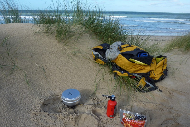 Je m'arrête sur la plage, entre les dunes, pour allumer mon réchaud et me restaurer. Mon repas de midi sera lyophilisé et café.