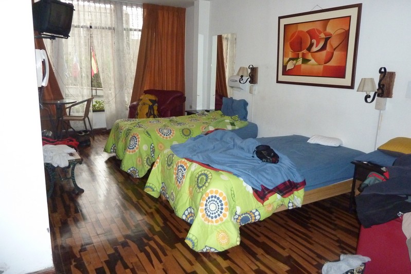 Finalement, après plus de 20 heures d'avion, avec 7 heures de décalage horaire, puis 9 heures de bus. Nous nous posons à l'hôtel Los Nogales, simple mais sympa et accueillant...(50 soles la chambre 2 lits et 9 soles le petit dèj).