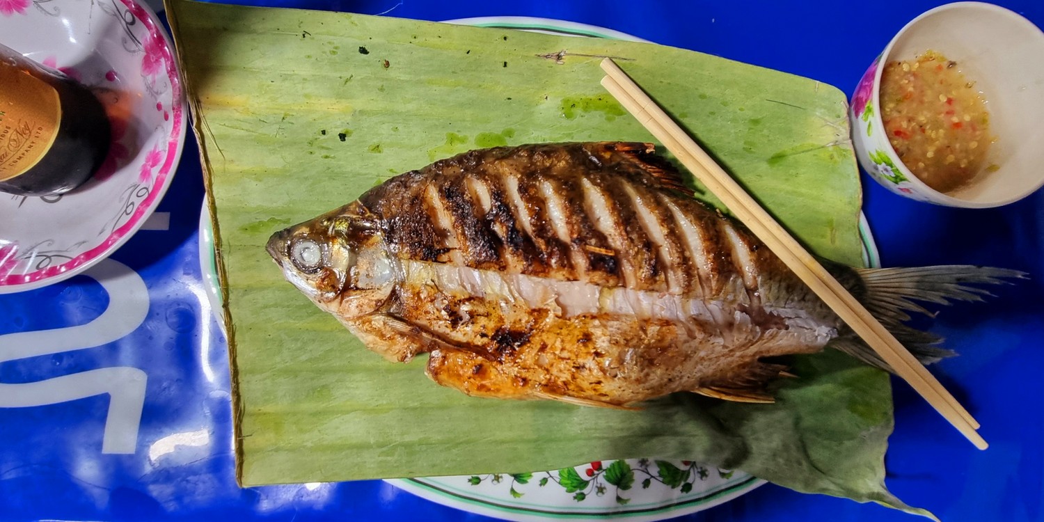 Puis nous ferons une halte vraiment cool sur une terrasse en bambou donnant sur les rizières pour un encas salade varié avec un shake coco,