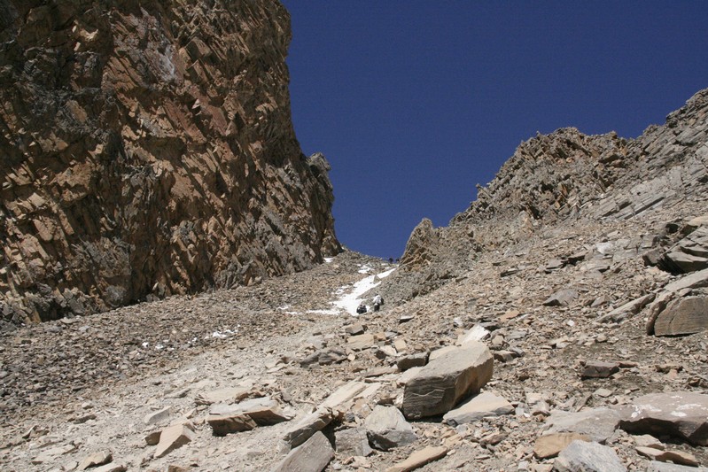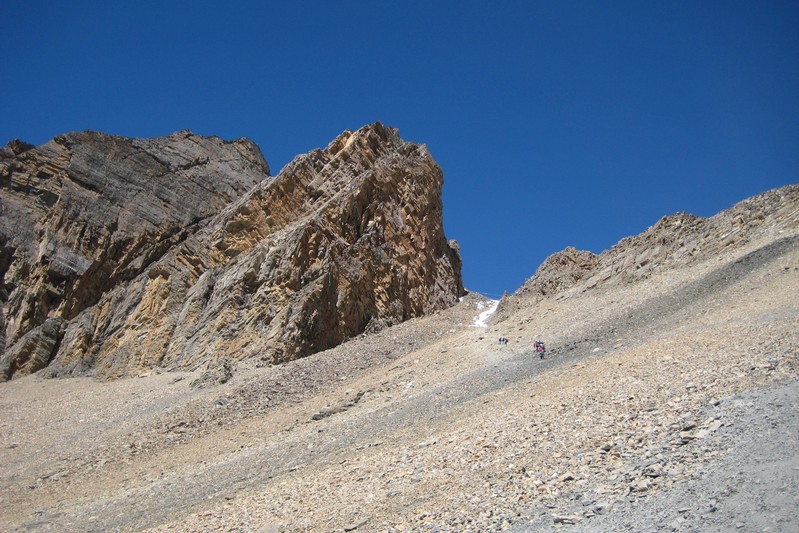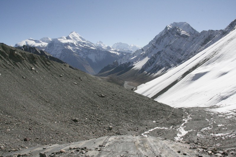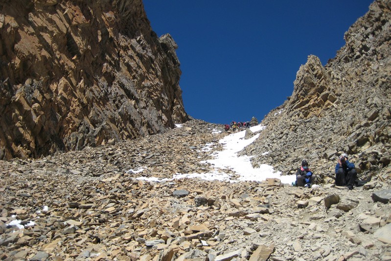 Premier arrêt bref à Kangla Pedi (4530 m) puis je pars devant et j'attaque la longue montée vers le col dans la glace et la neige abondante.