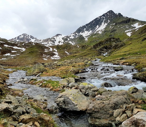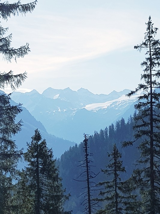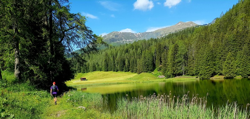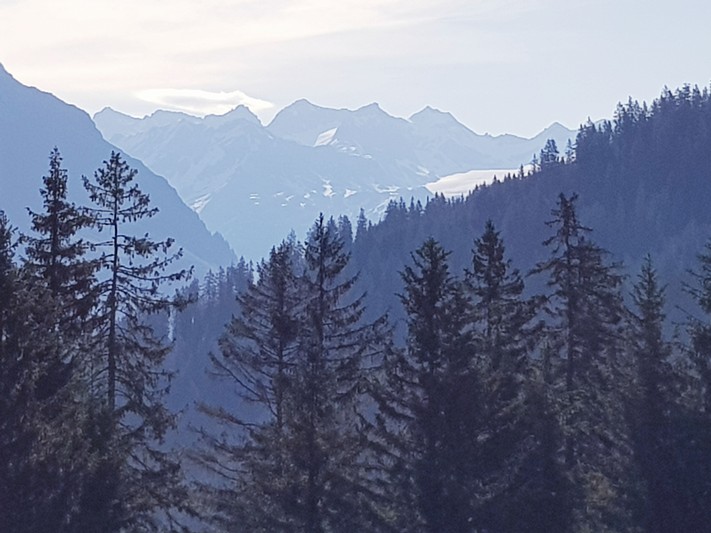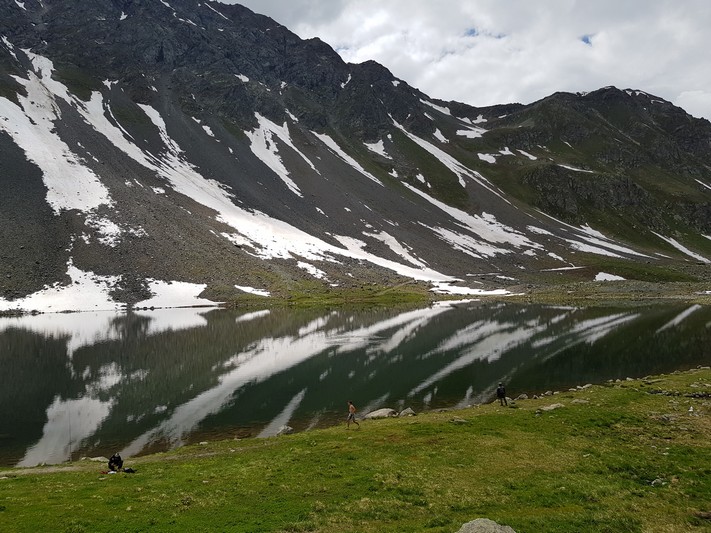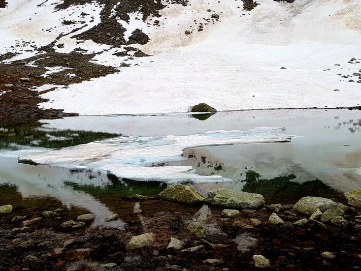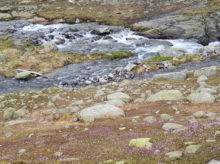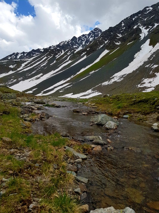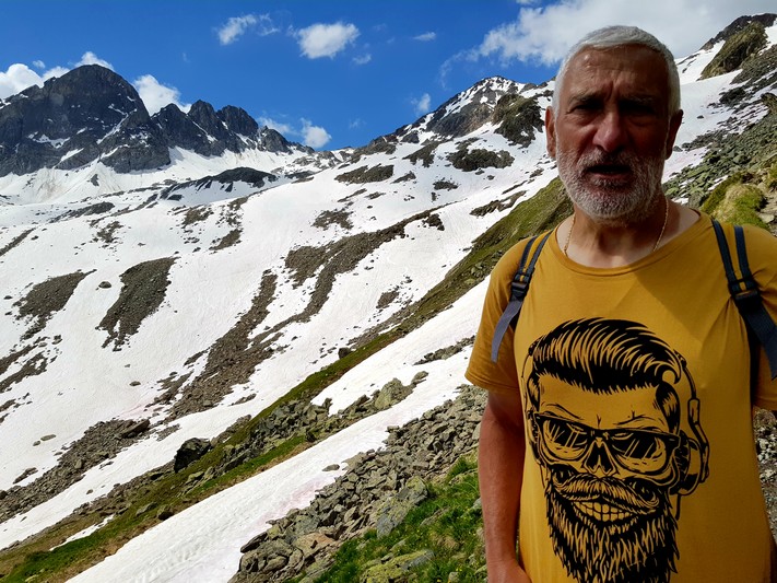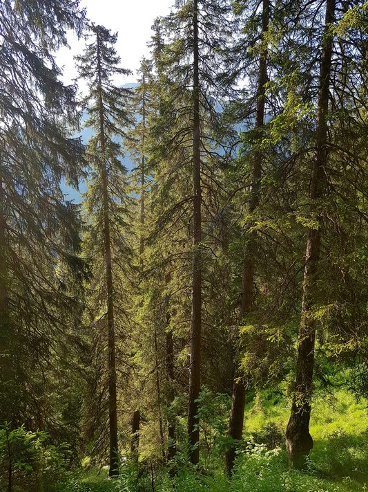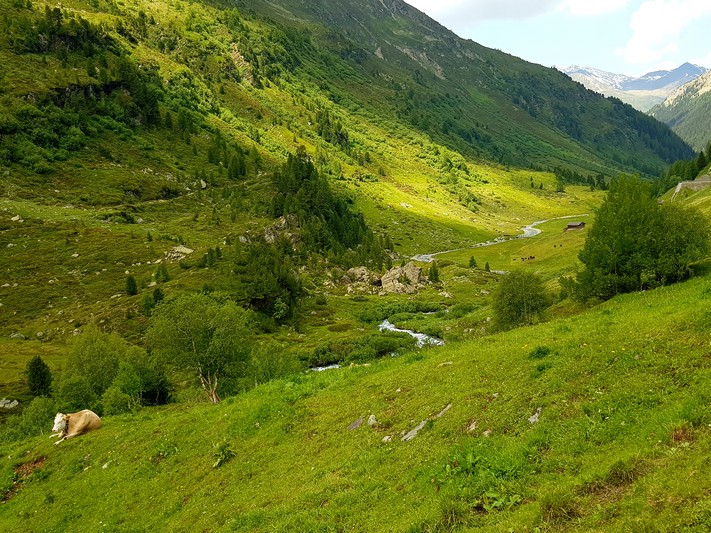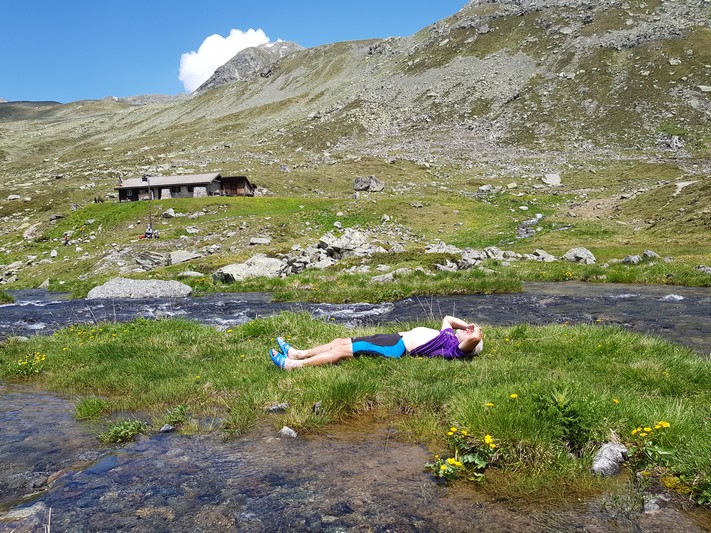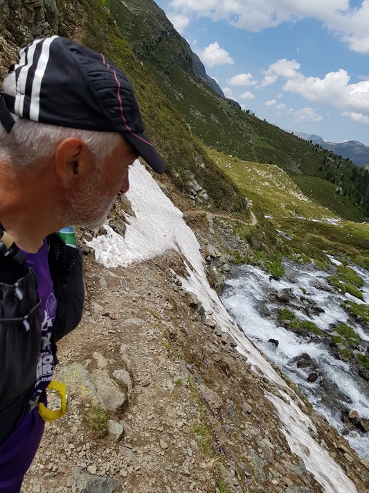 Je rejoins Adélio en passant à travers forêts de sapin, chemins d'altitude, torrent et névés.
