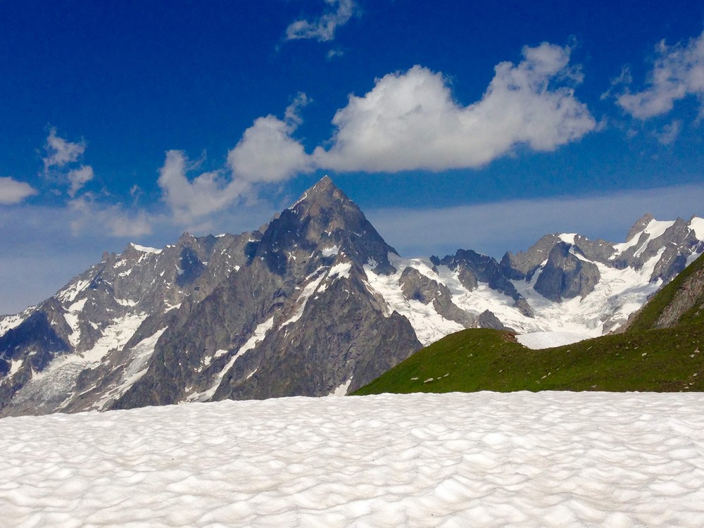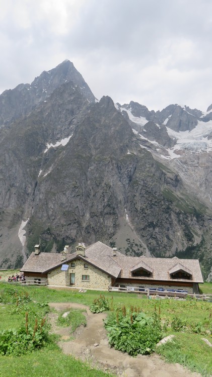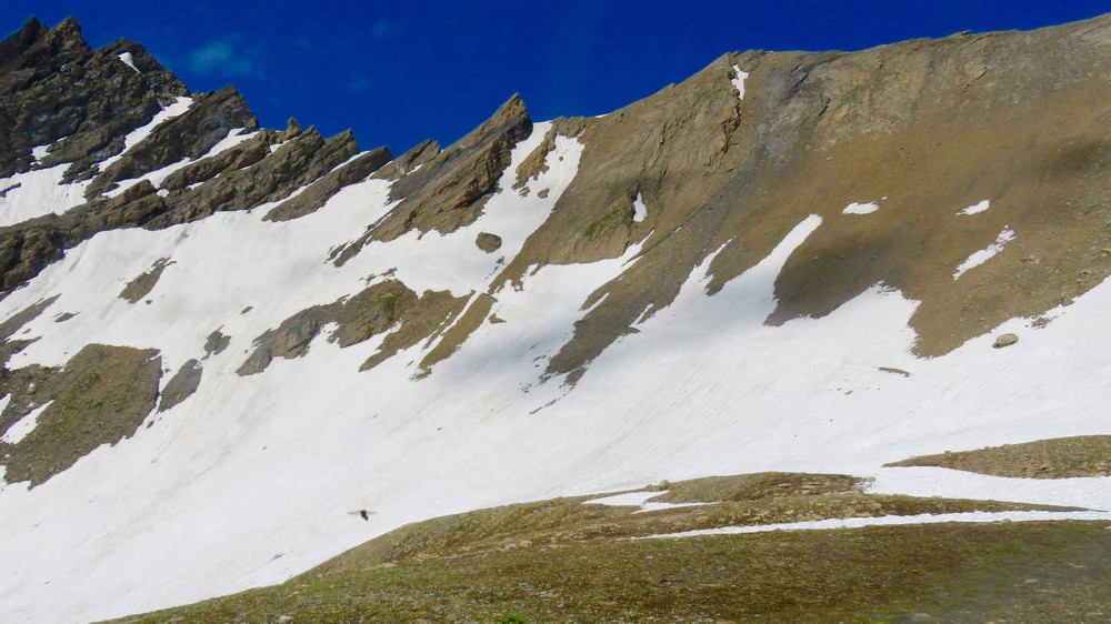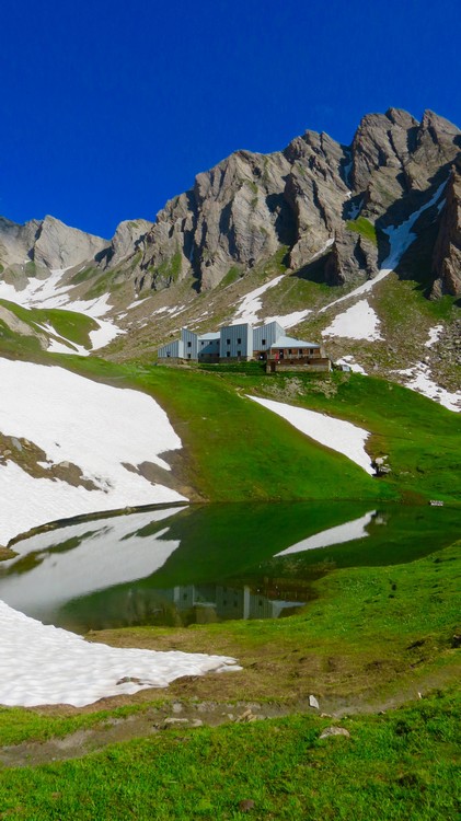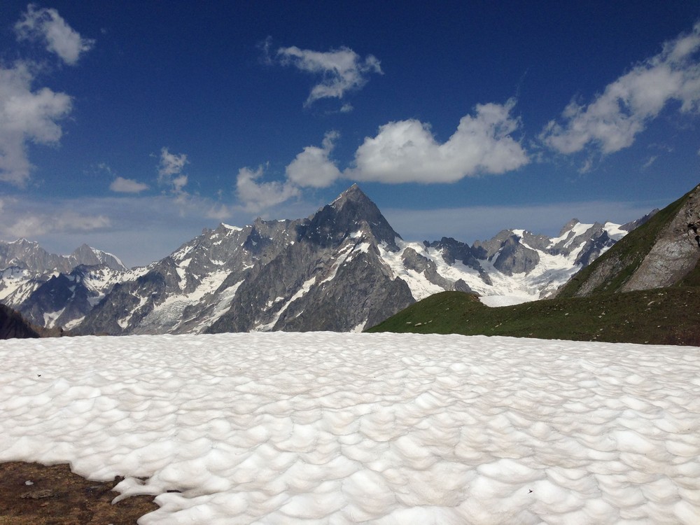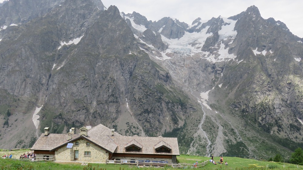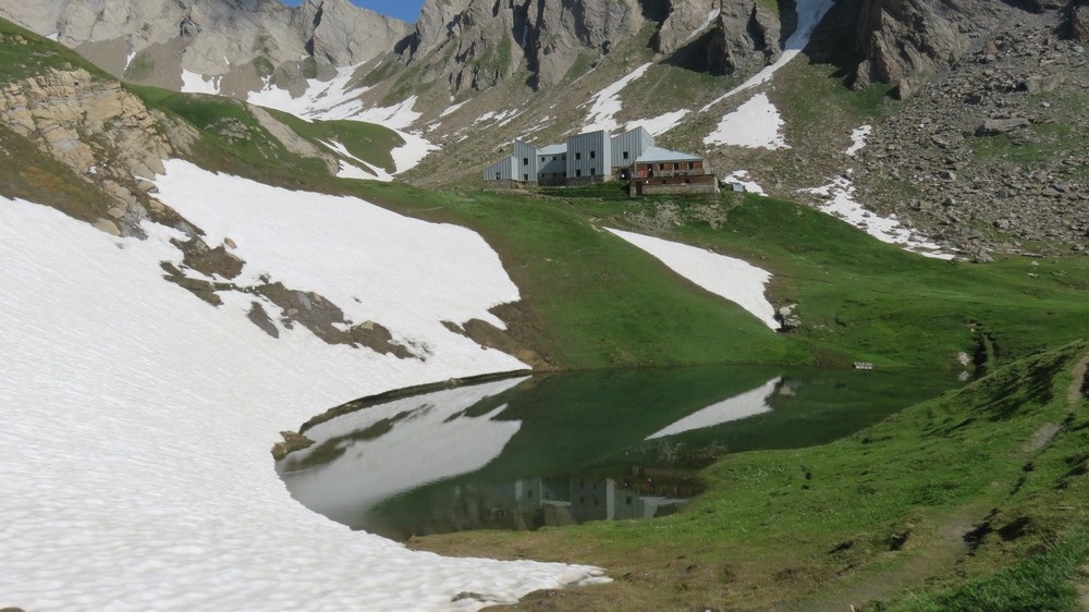 J'entame la descente vers 11 heures à travers les nombreux névés, longs mais faciles. Arrivée au refuge Walter Bonatti (2025 m) à 13 h 30 après