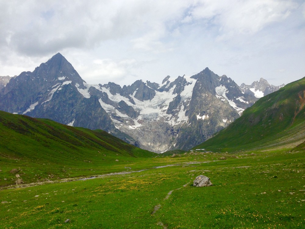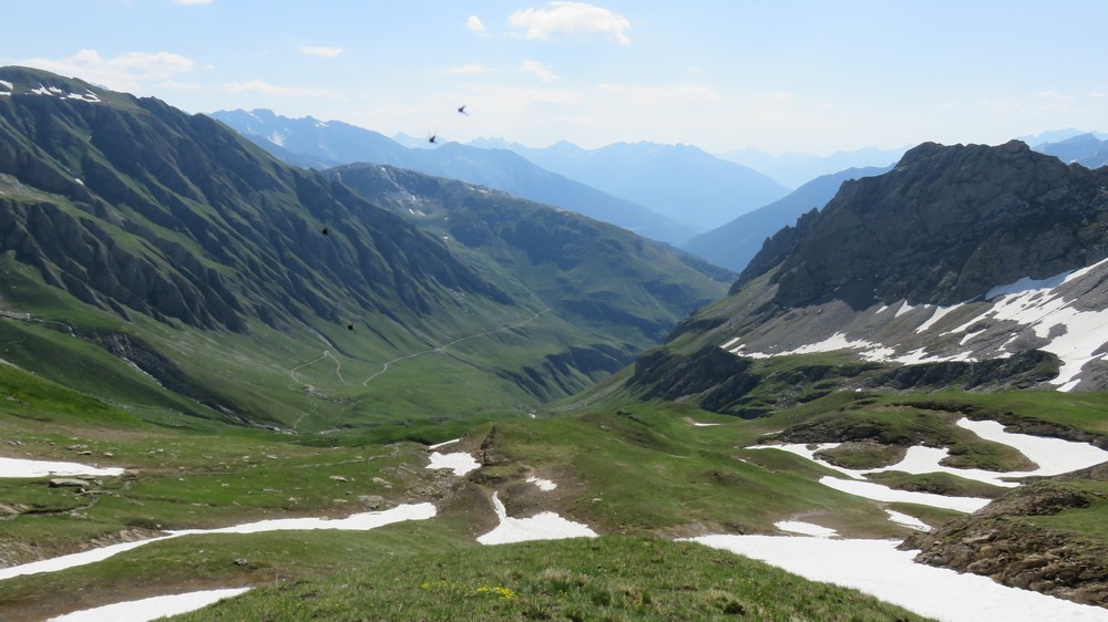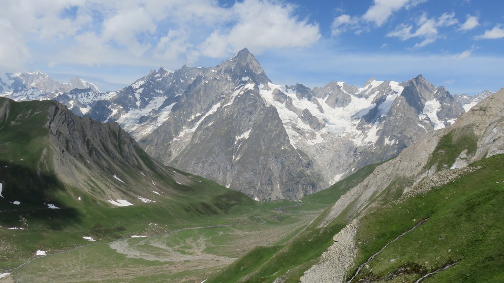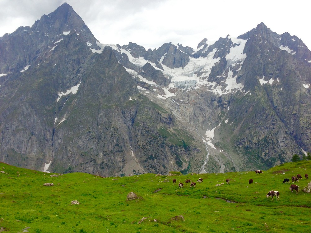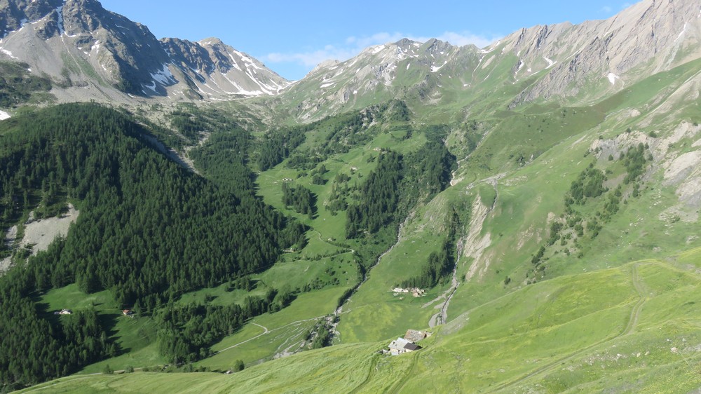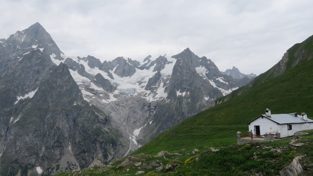 J'entame la descente vers 11 heures à travers les nombreux névés, longs mais faciles. Arrivée au refuge Walter Bonatti (2025 m) à 13 h 30 après