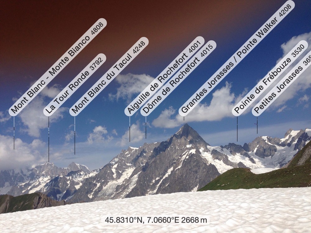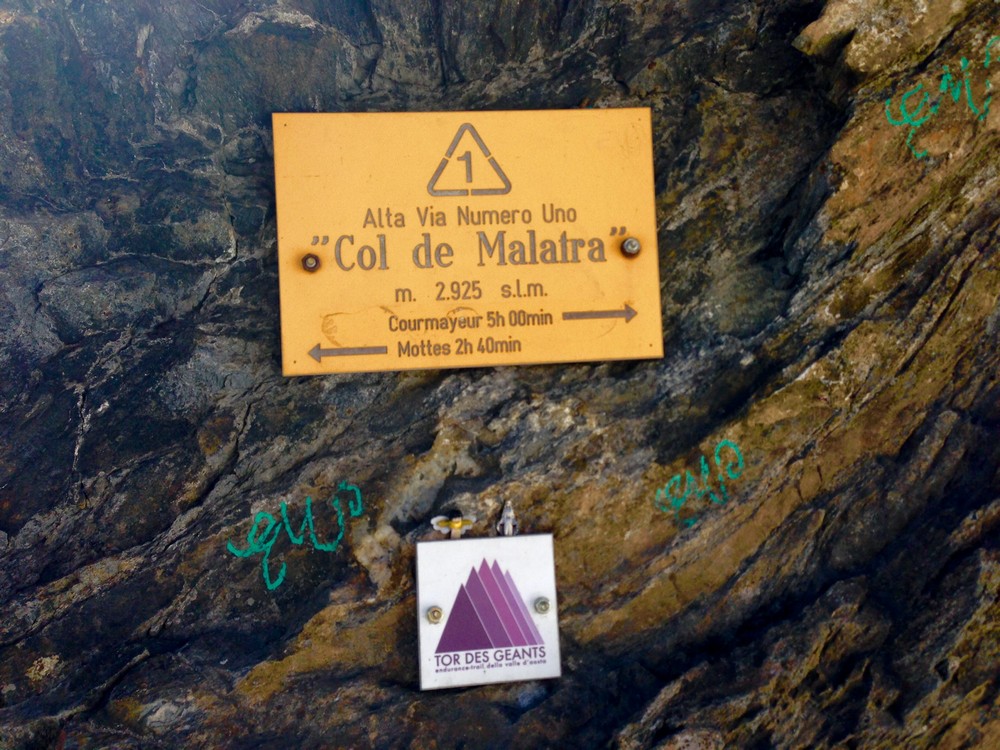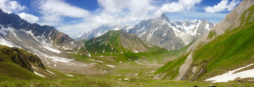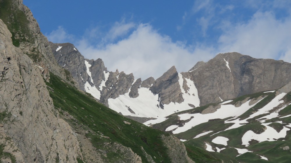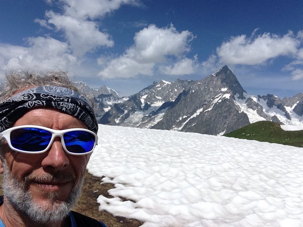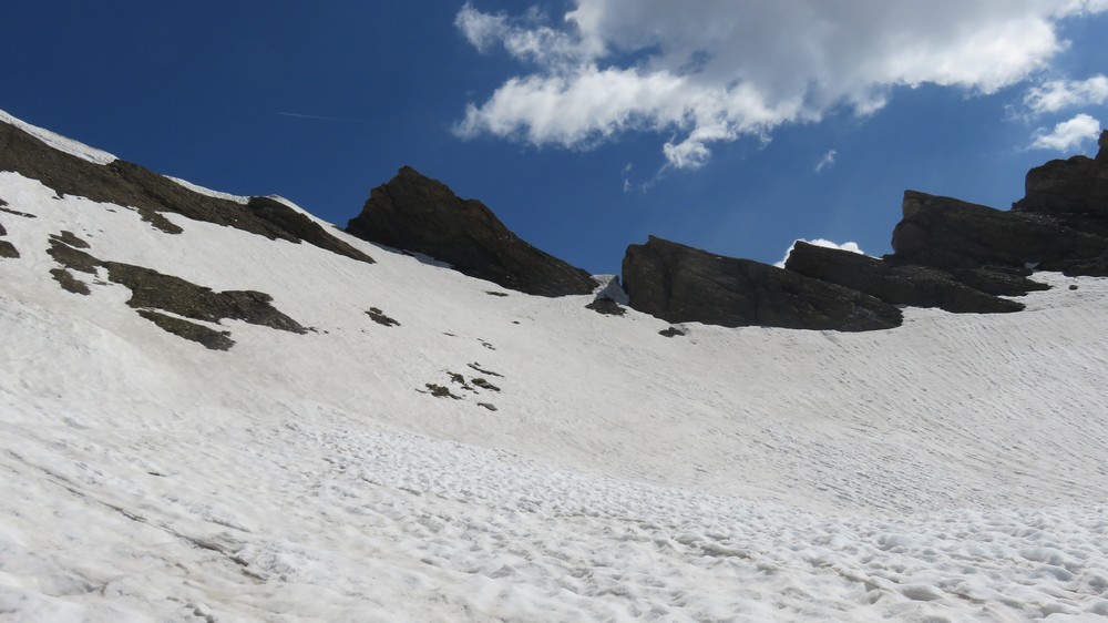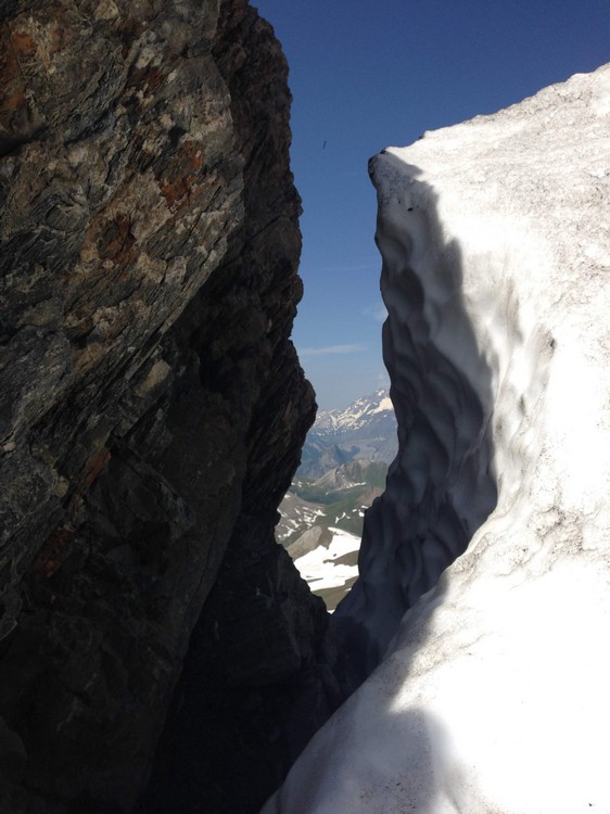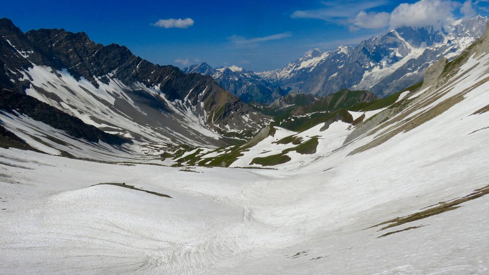 La montée vers le col va s'avèrer délicate car longue et trés pentue en névé. Heureusement il y a des traces, ce qui va vraiment me faciliter la tâche. Malgré tout, il faut quand même y aller avec mes mini cranpons et guêtres. Ils sont indispensables. J'atteint le passage étroit (entre neige et roche) du col de Malatrà (2925 m) et je découvre une autre vue extraordinaire sur toute la chaine du Mont Blanc et des Grandes Jurasses.
