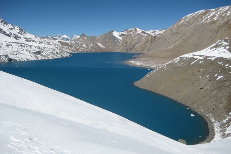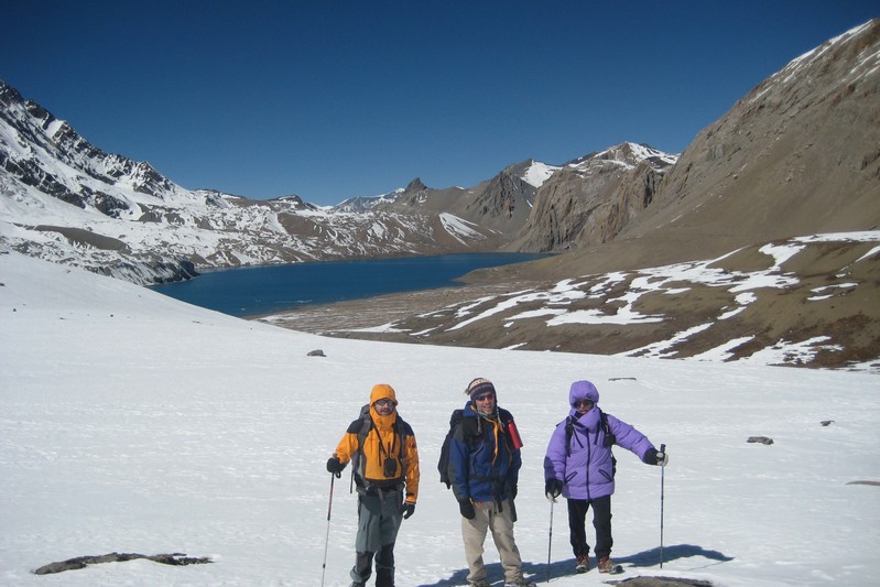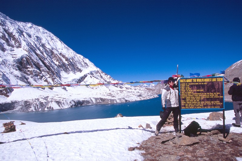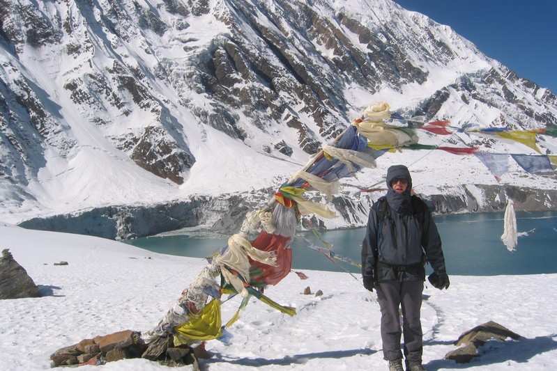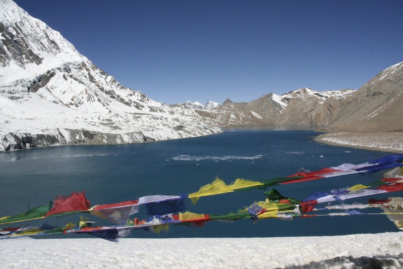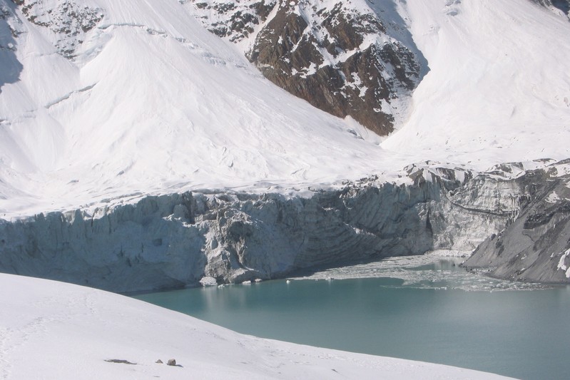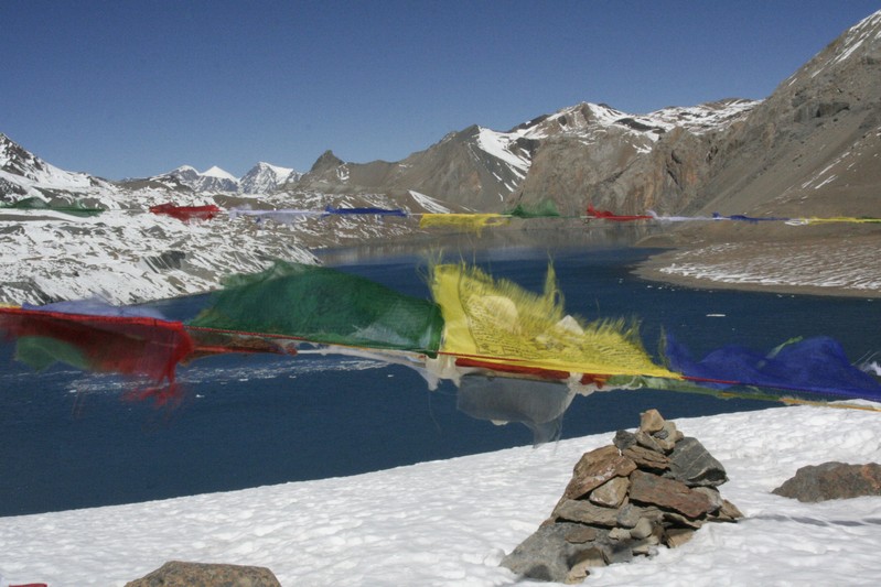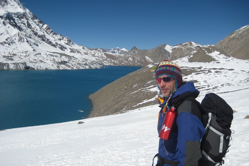 Le chemin pentu est long (2h20)... je parviens finalement le premier au lac Tilicho où le vent glacial souffle trés trés fort...