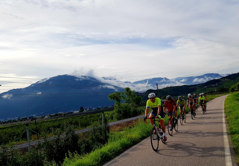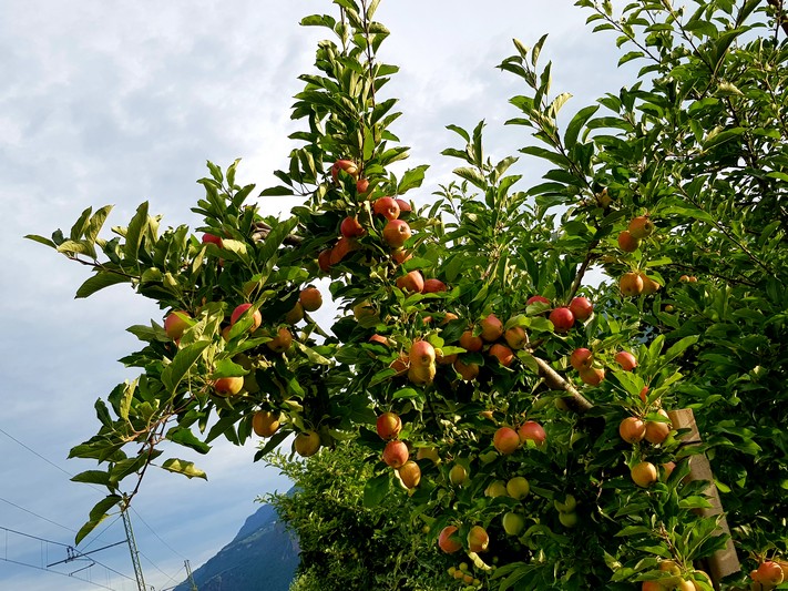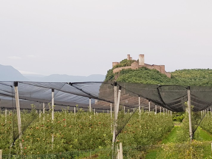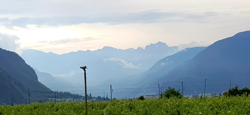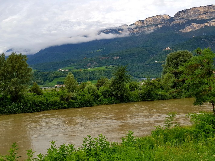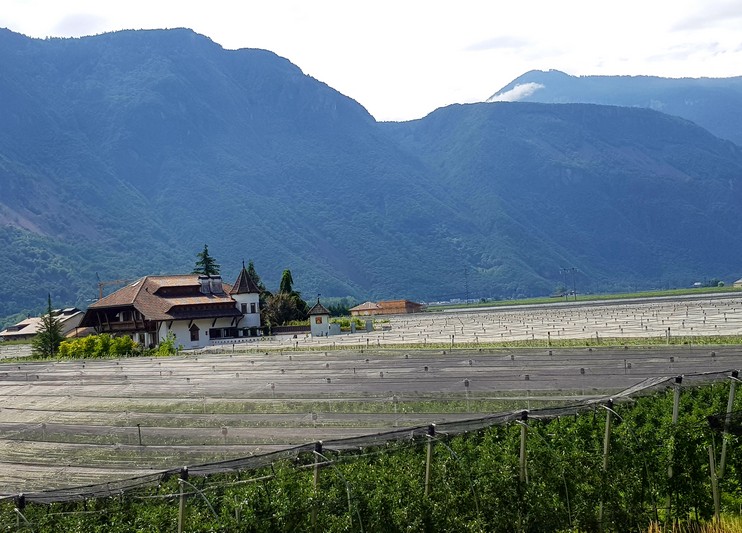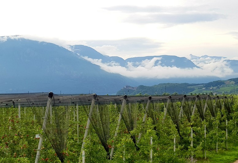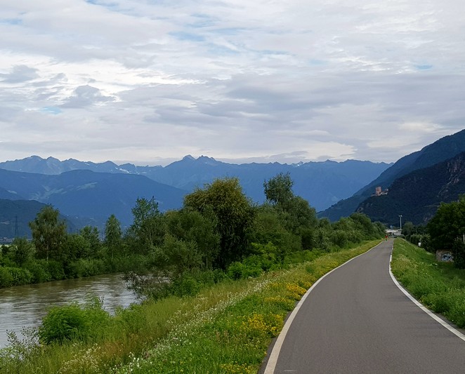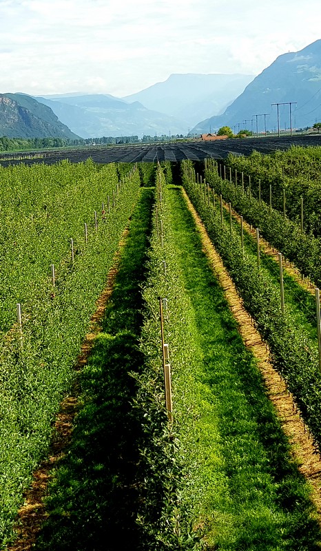 Quasi que de la piste cyclable le long de l'Adige, entre le fleuve et les champs de pommes.