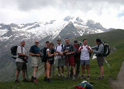 Descente par l'arête vers notre refuge Elisabetta Soldini face au glaciers de la Lée blanche et du petit Mont Blanc.