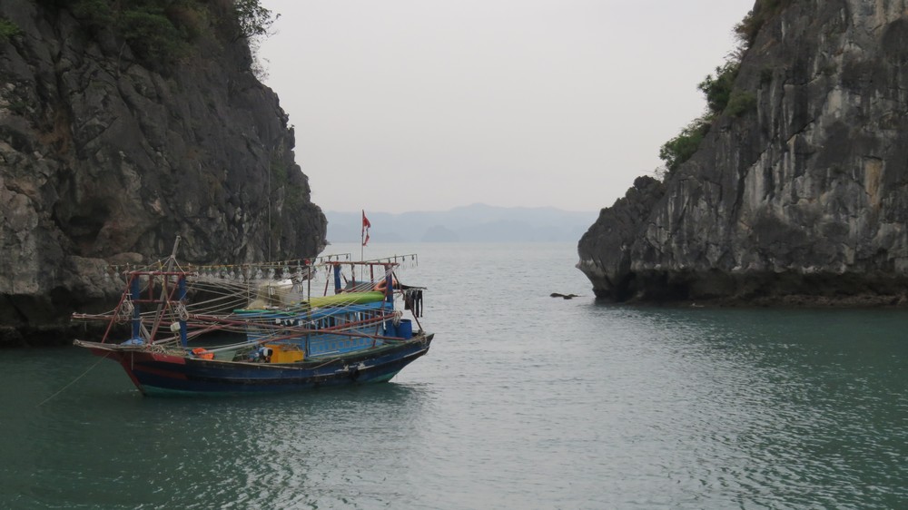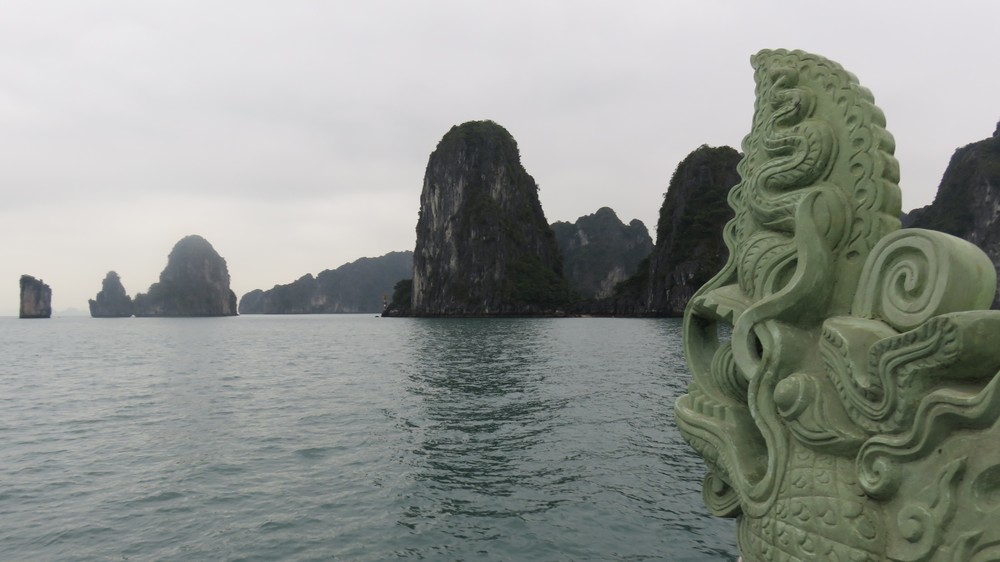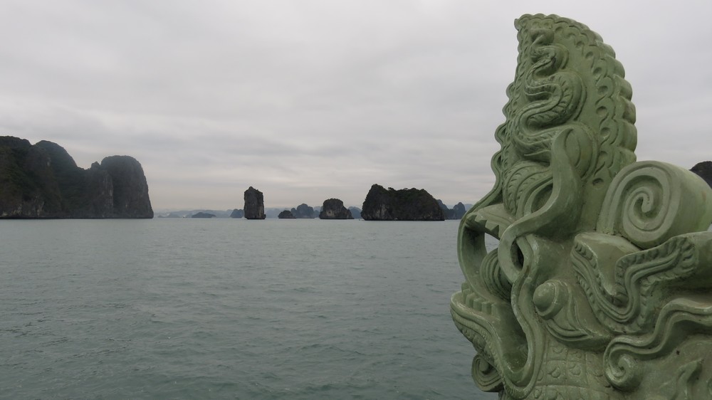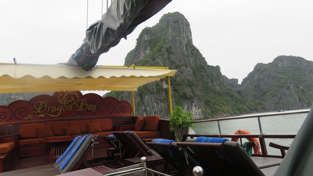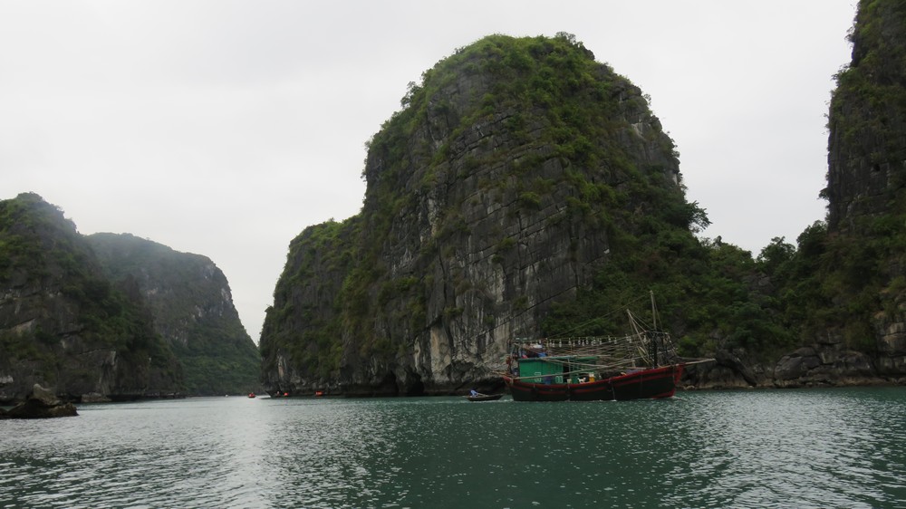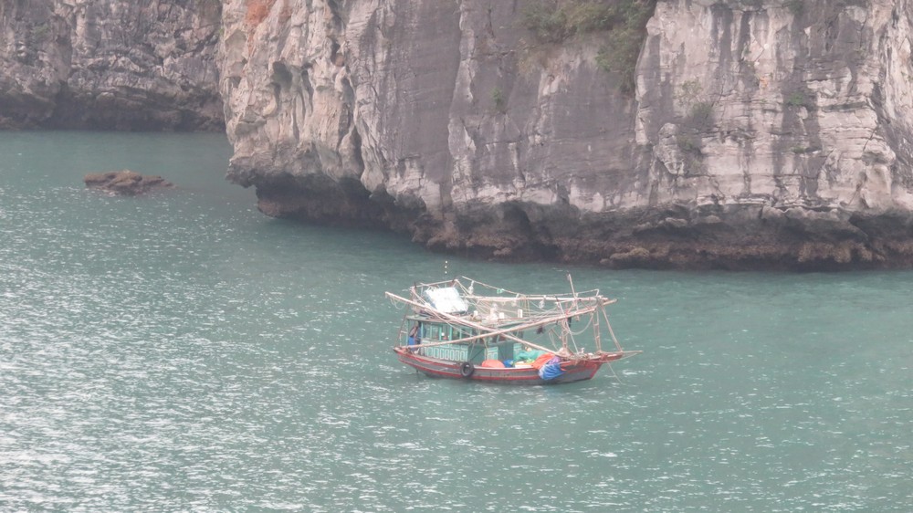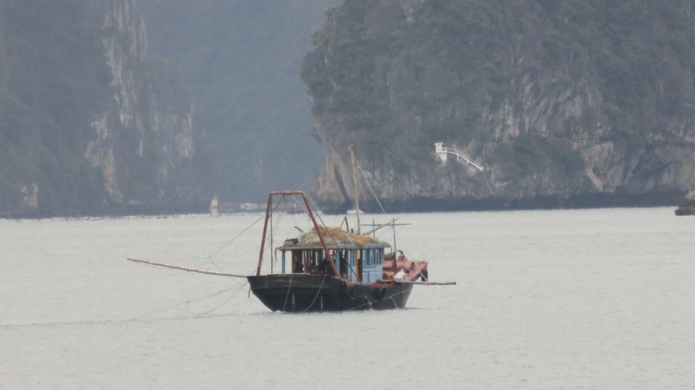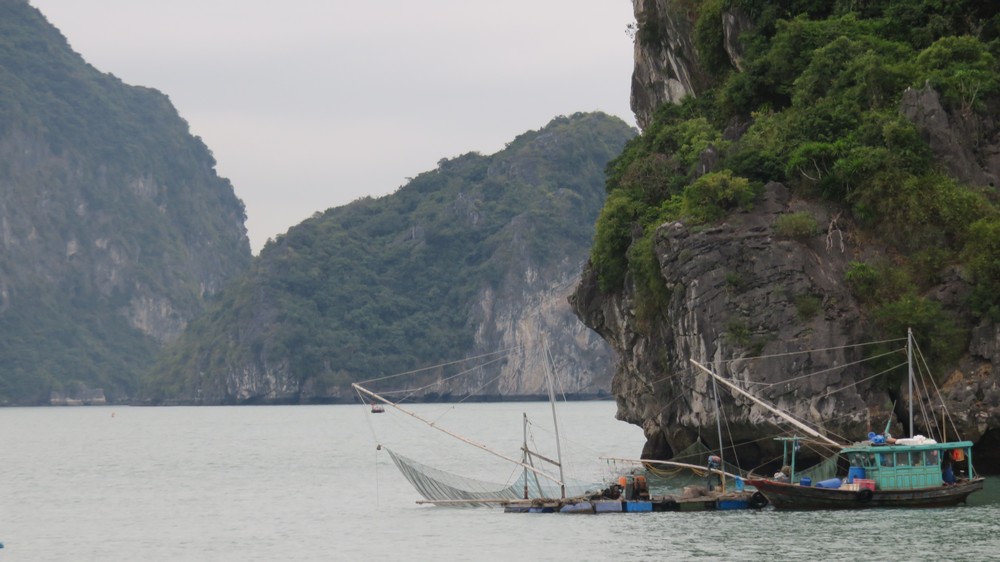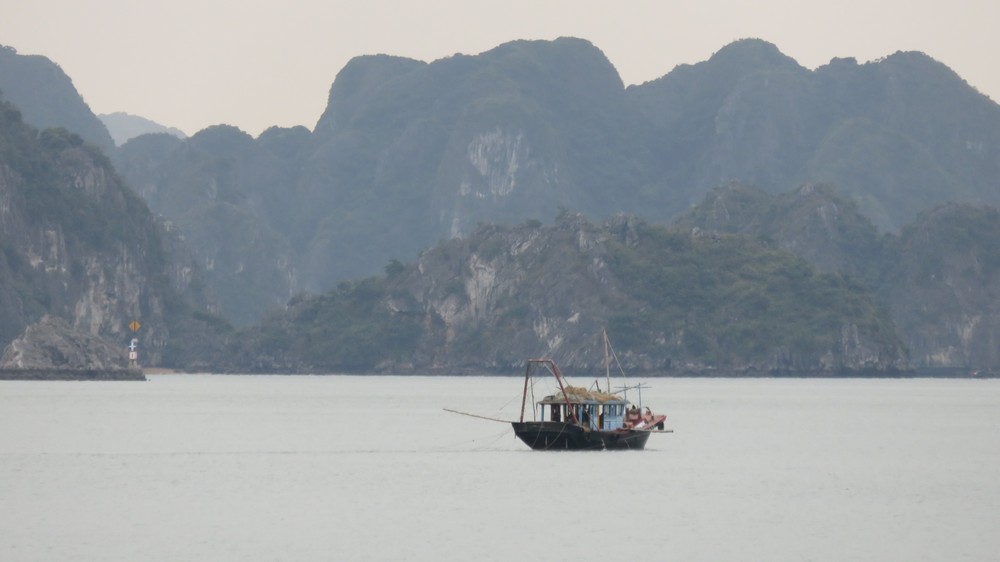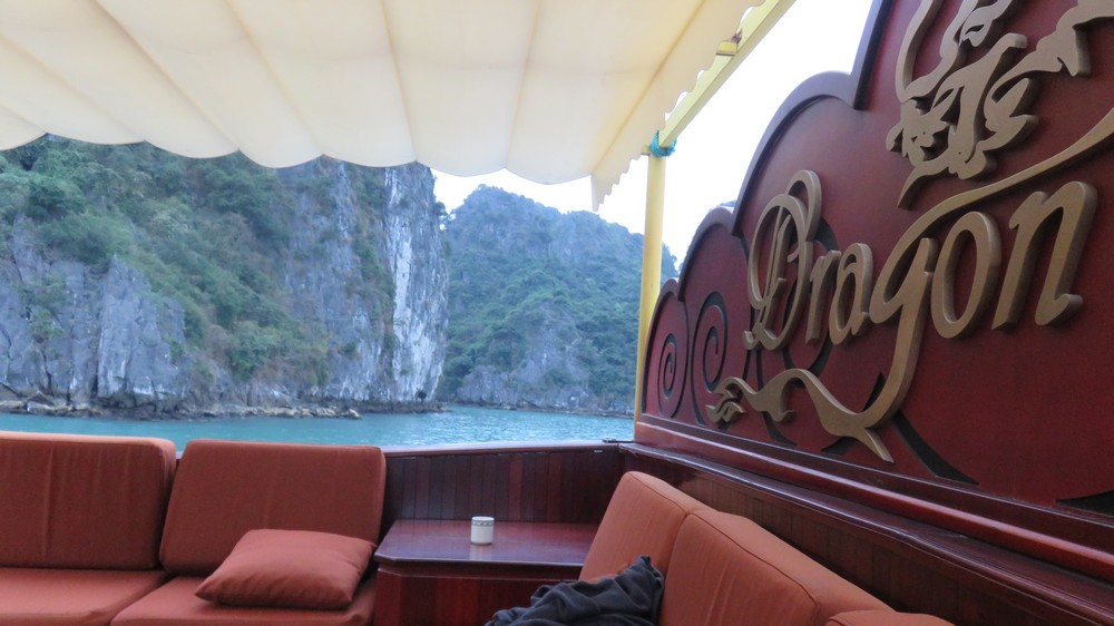 Notre bateau s'appelle le 'Dragon Bay' et, entre deux groupes de touristes, nous promène sur les eaux calmes de la gigantesque baie d'Halong. Plusieurs haltes sont effectuées pour la visite de grottes, une échappée en kayak, ou la rencontre de pêcheurs..