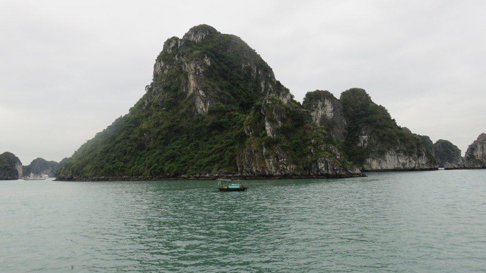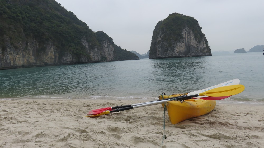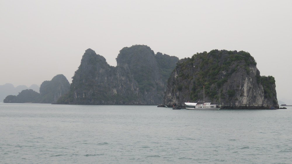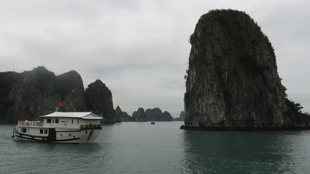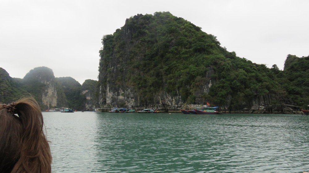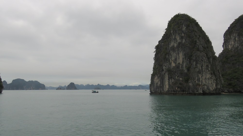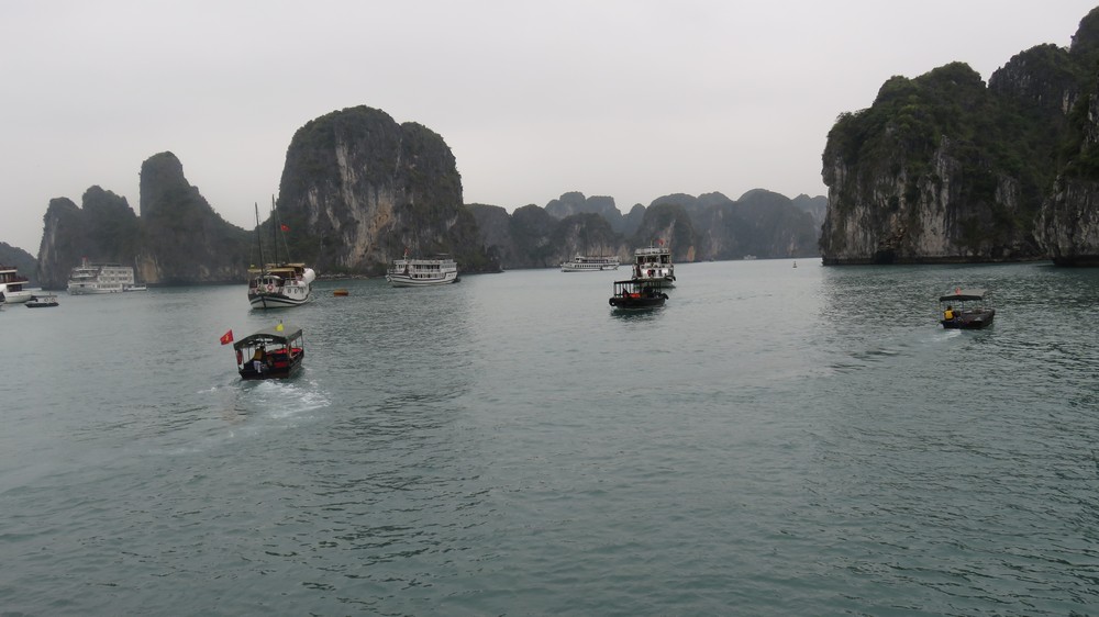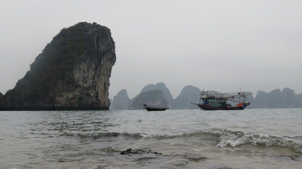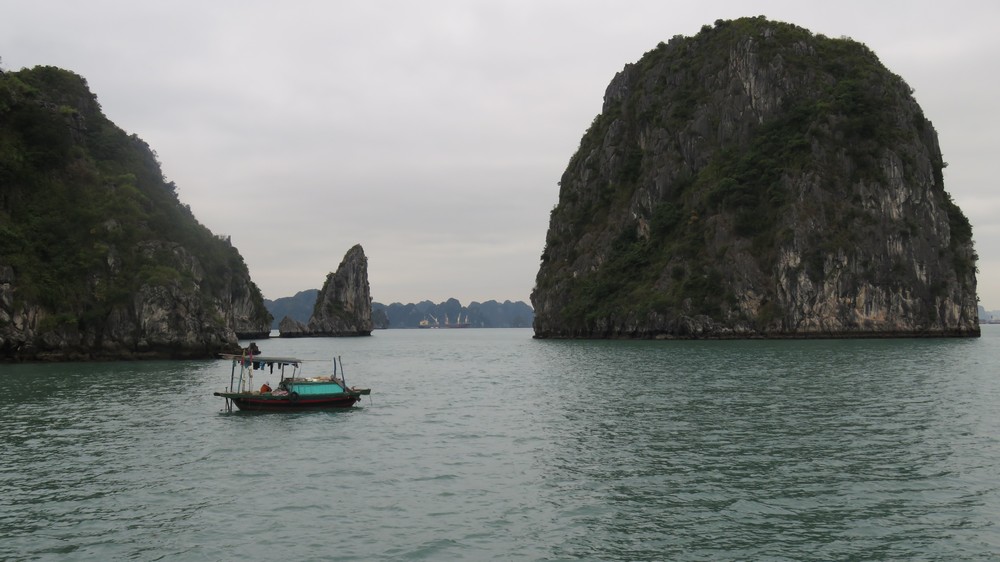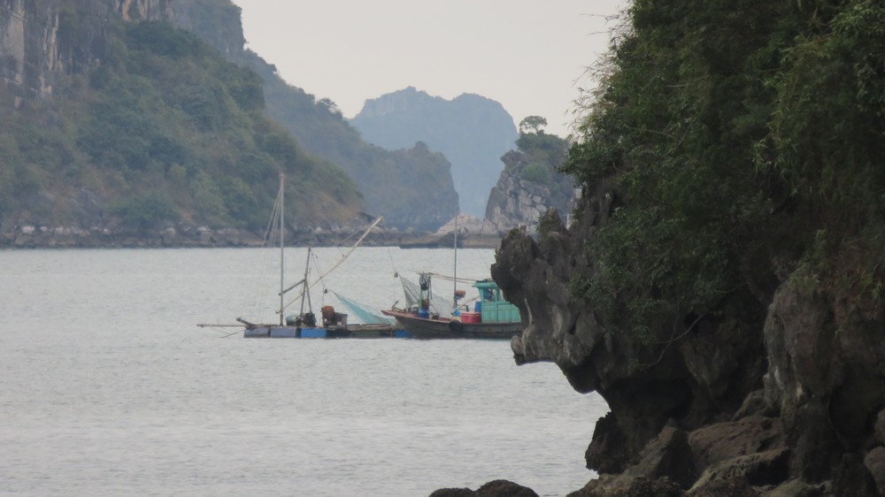Notre bateau s'appelle le 'Dragon Bay' et, entre deux groupes de touristes, nous promène sur les eaux calmes de la gigantesque baie d'Halong. Plusieurs haltes sont effectuées pour la visite de grottes, une échappée en kayak, ou la rencontre de pêcheurs..