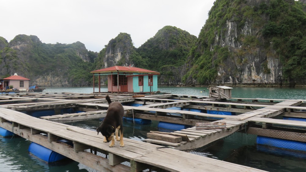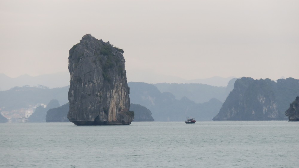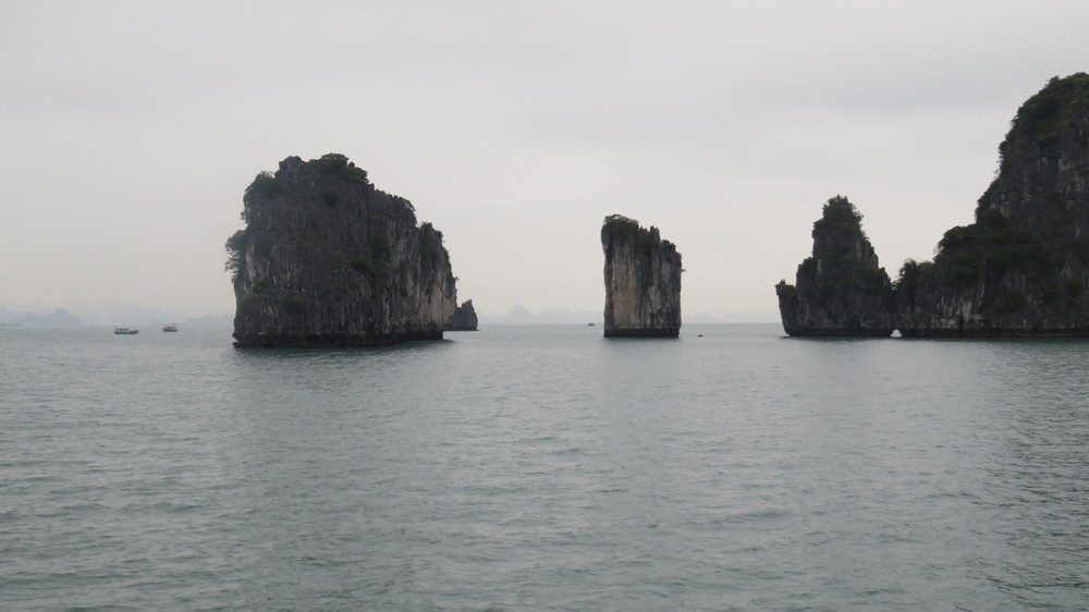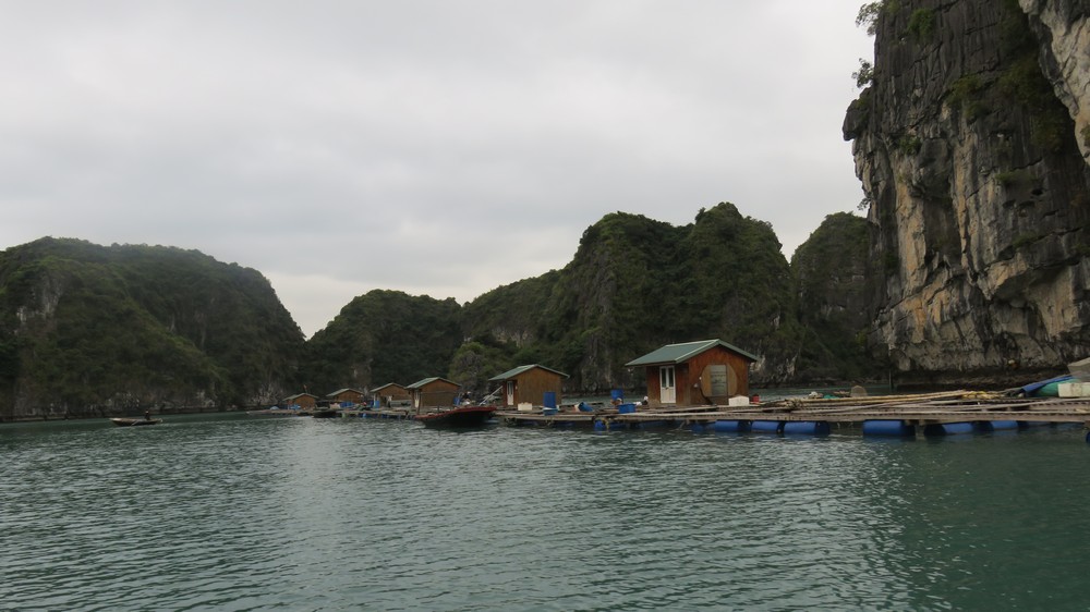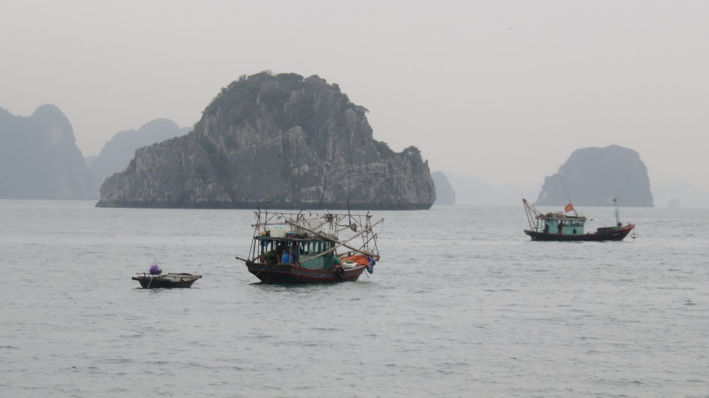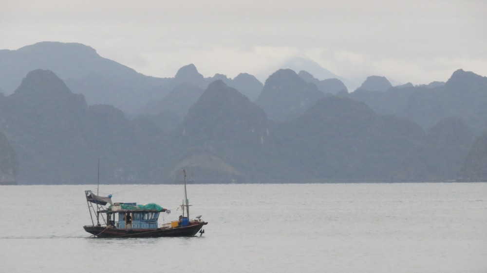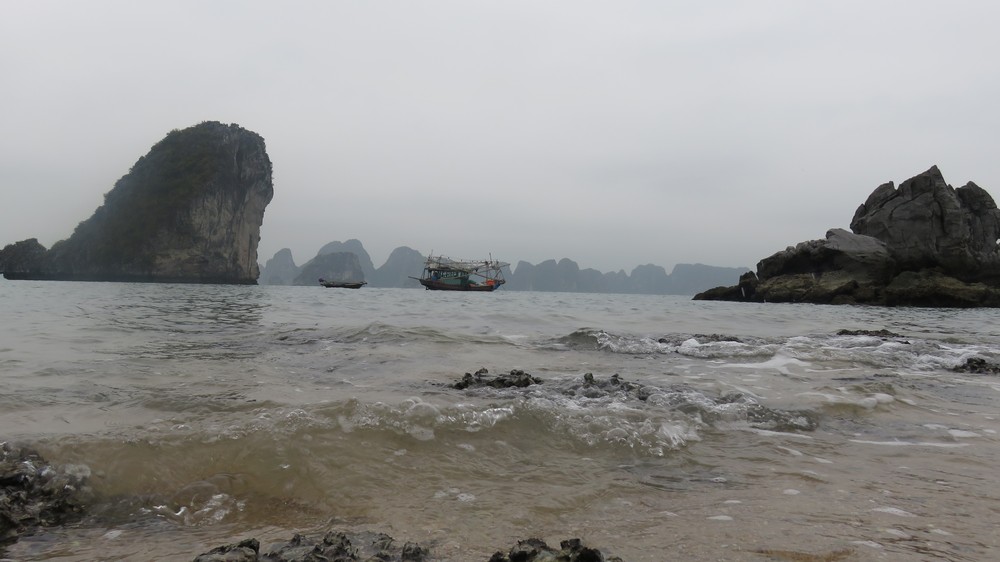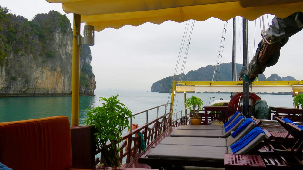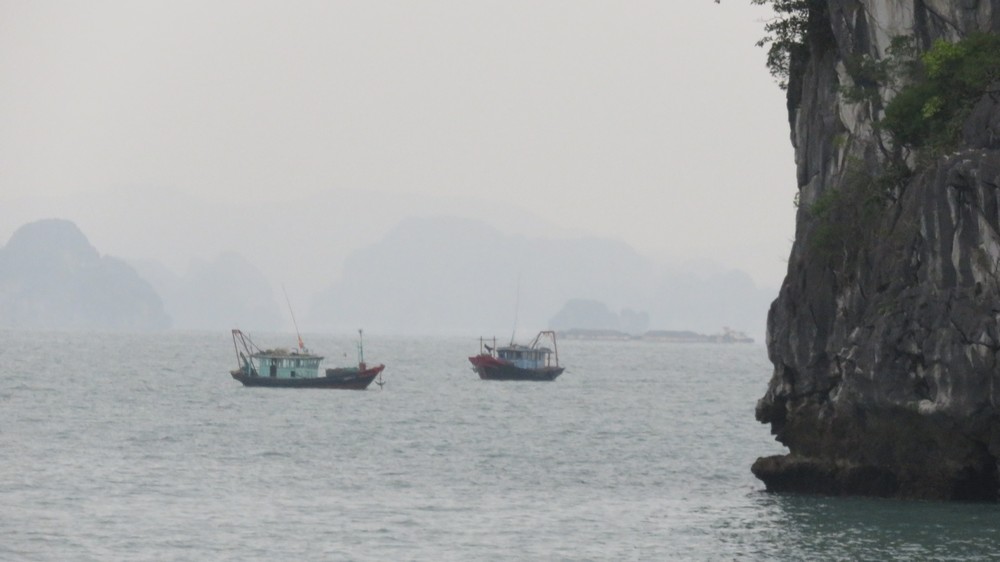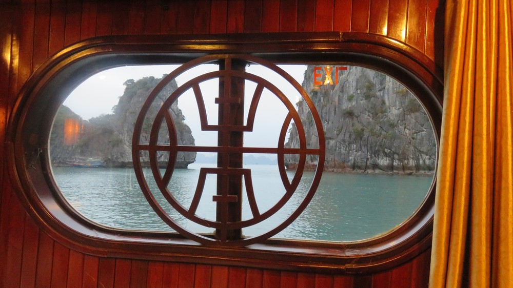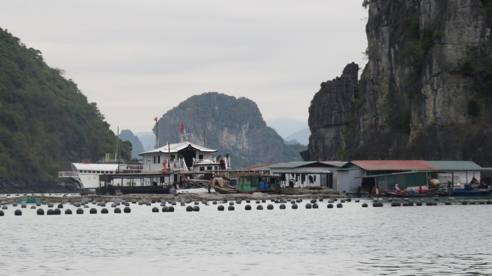 Notre bateau s'appelle le 'Dragon Bay' et, entre deux groupes de touristes, nous promène sur les eaux calmes de la gigantesque baie d'Halong. Plusieurs haltes sont effectuées pour la visite de grottes, une échappée en kayak, ou la rencontre de pêcheurs..