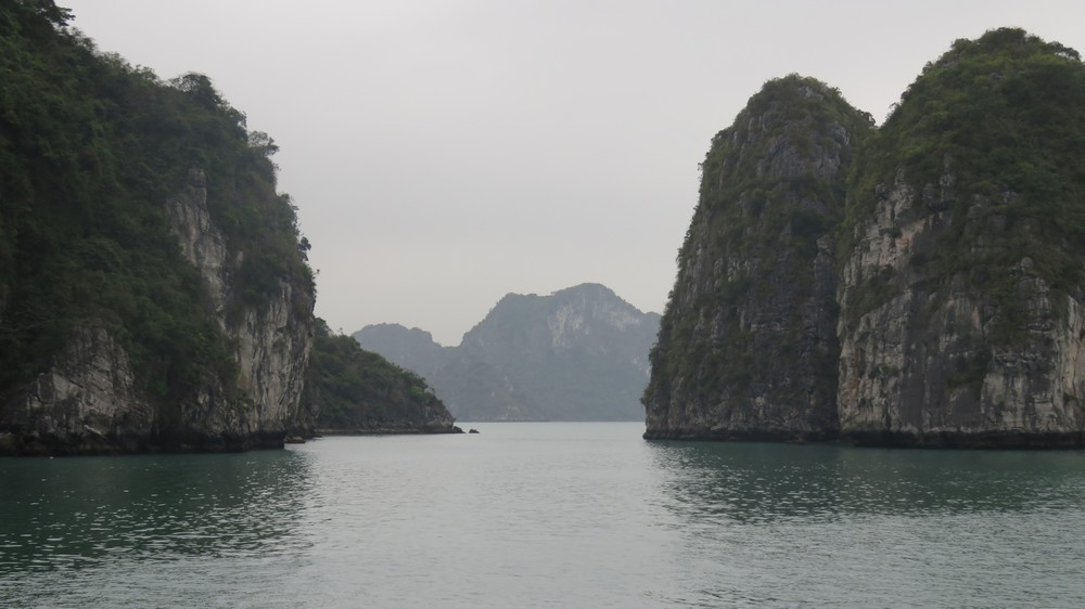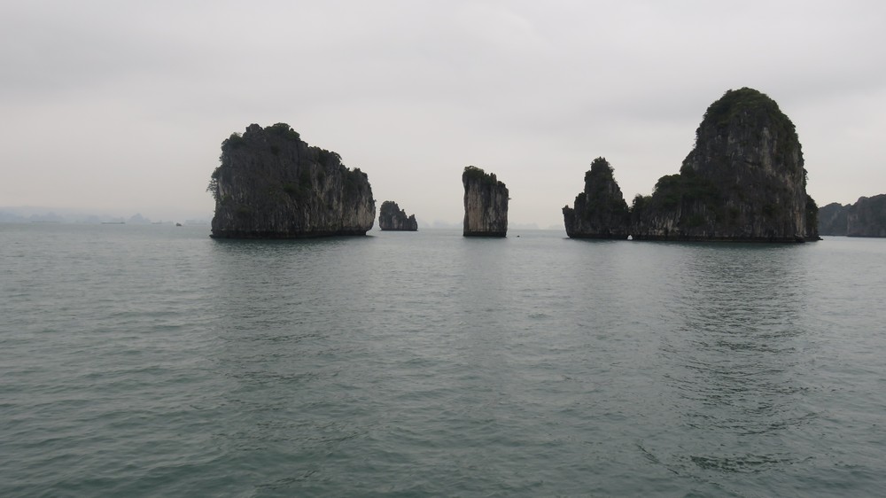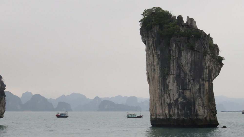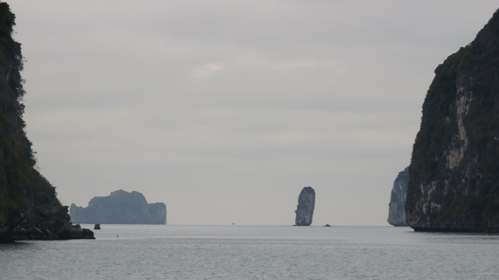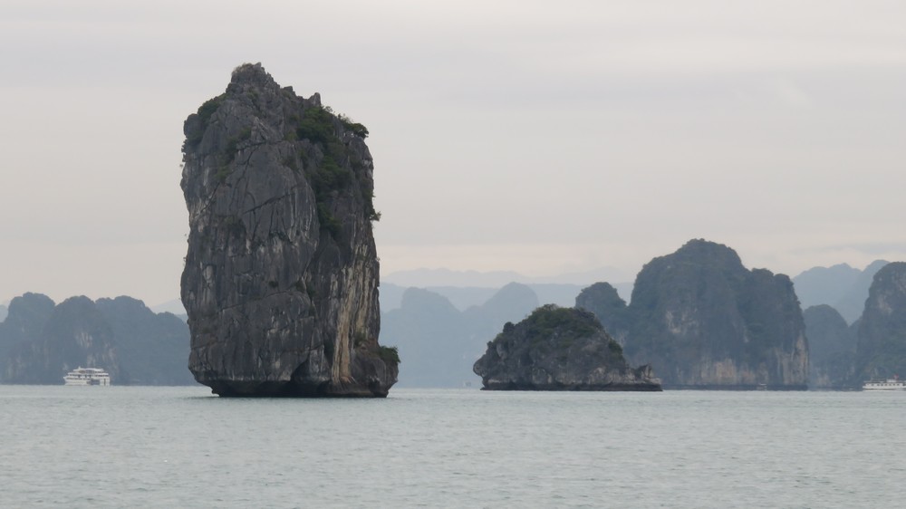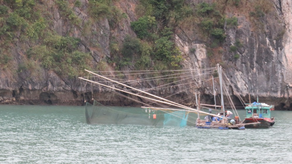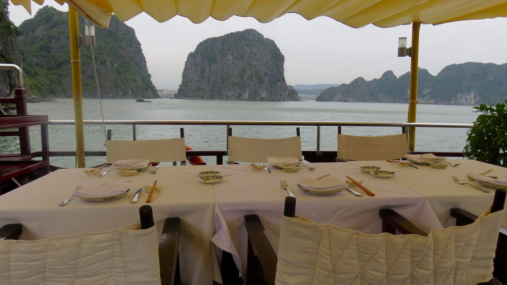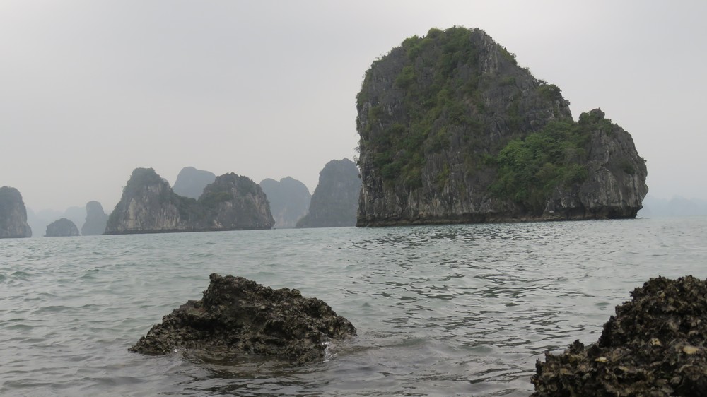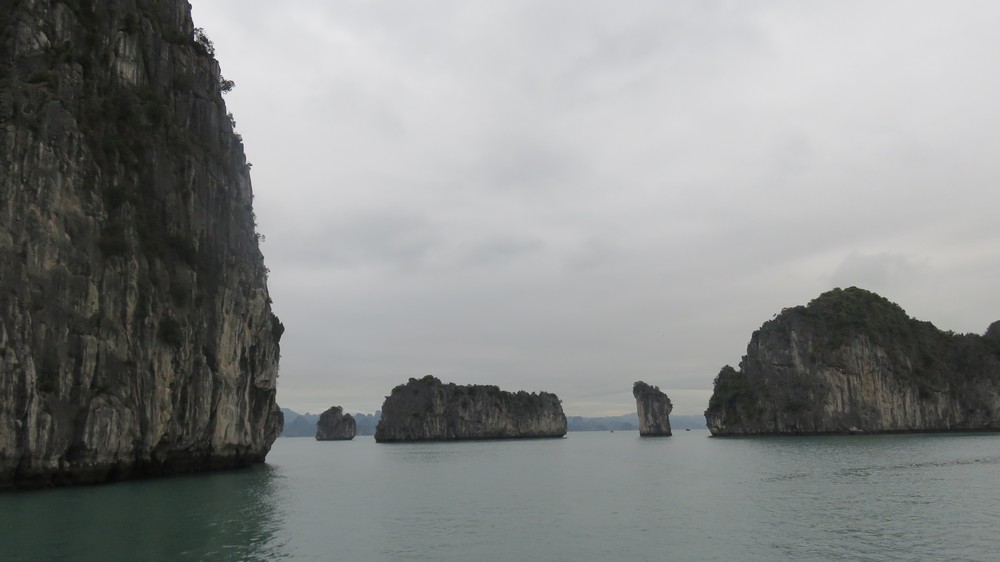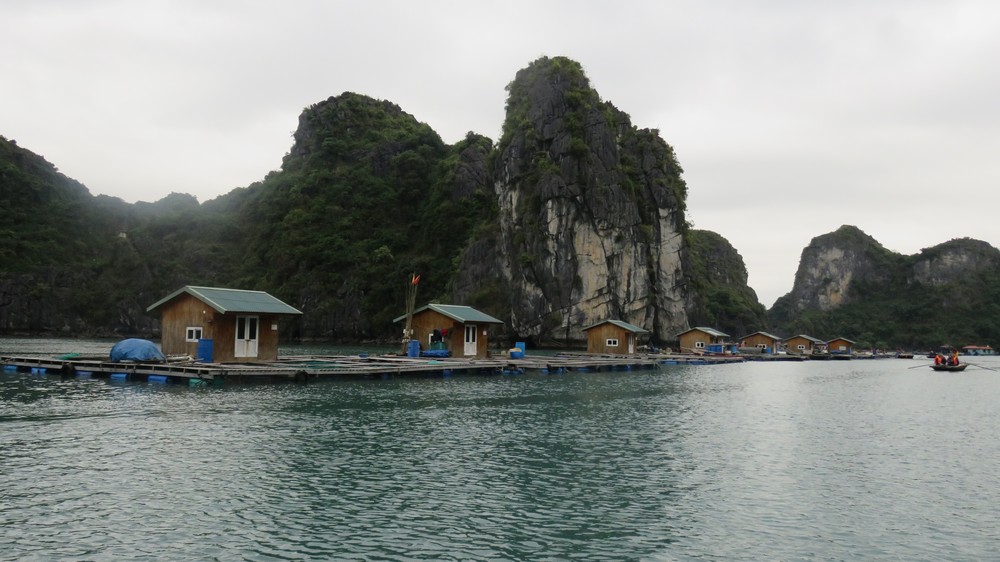 Notre bateau s'appelle le 'Dragon Bay' et, entre deux groupes de touristes, nous promène sur les eaux calmes de la gigantesque baie d'Halong. Plusieurs haltes sont effectuées pour la visite de grottes, une échappée en kayak, ou la rencontre de pêcheurs..