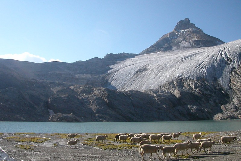 par le glacier du même nom où un troupeau de brebis se restaure.