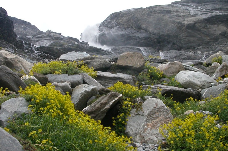 Beau spectacle varié, gros rochers parsemés de fleurs, cascade grandiose, nombreux torrents qui finalement s'unissent