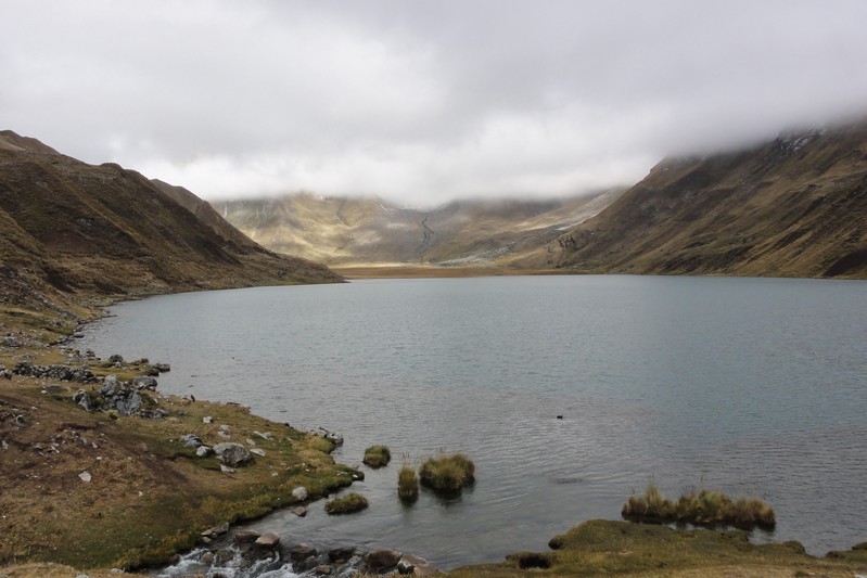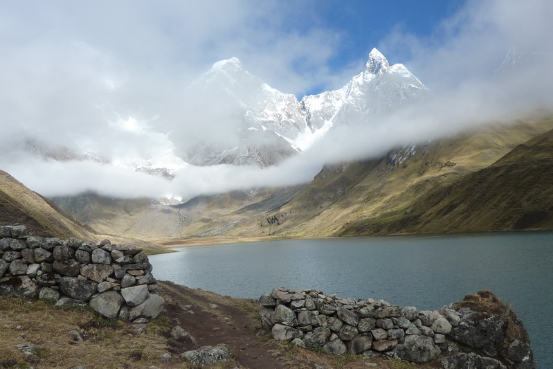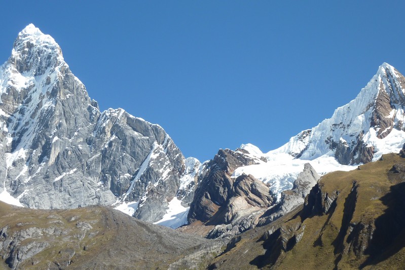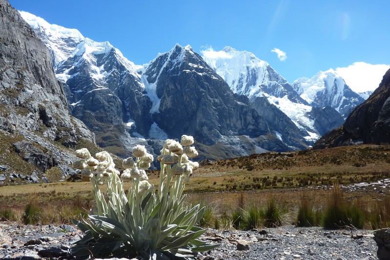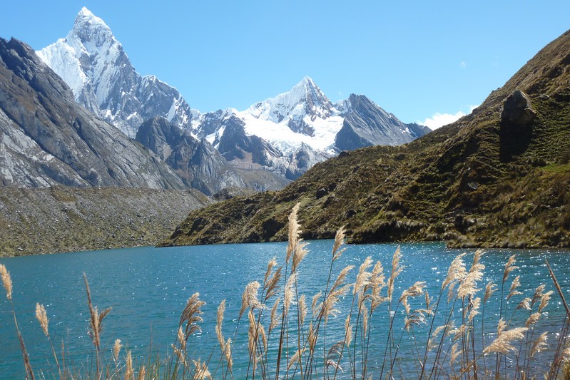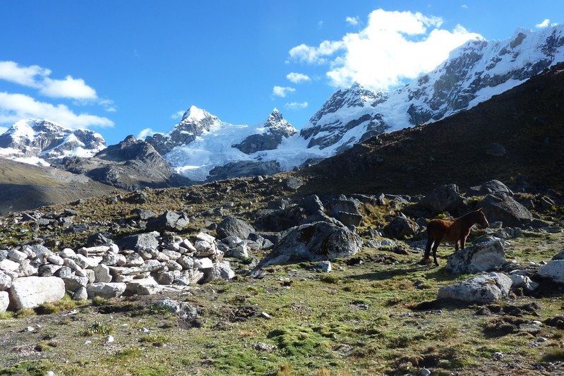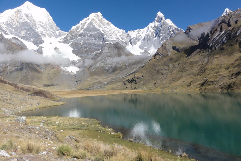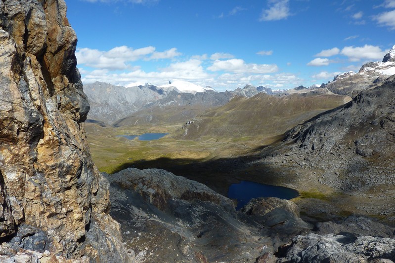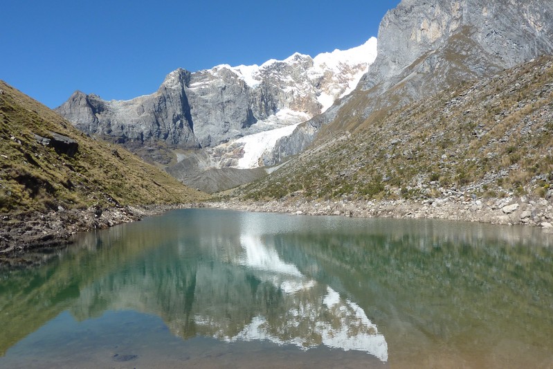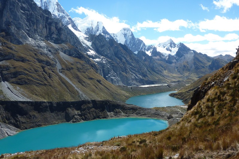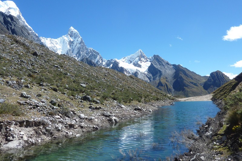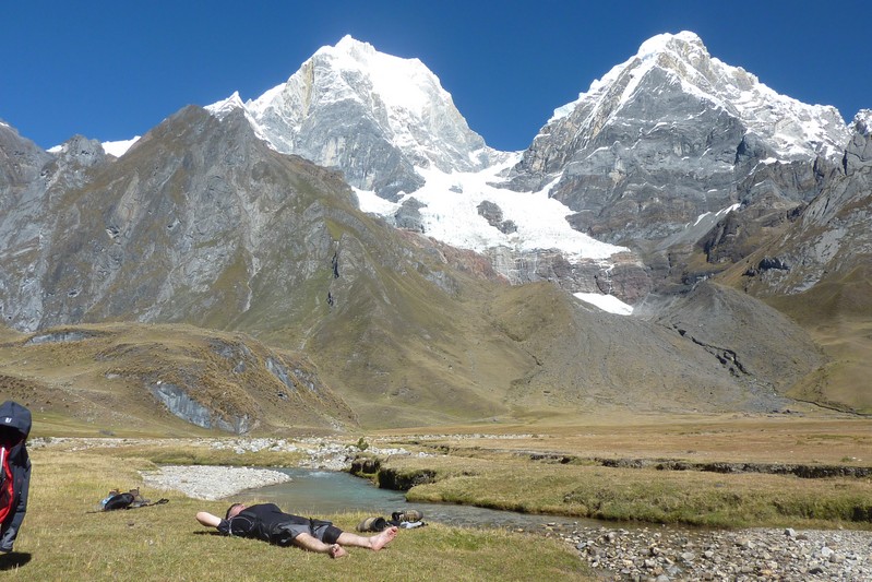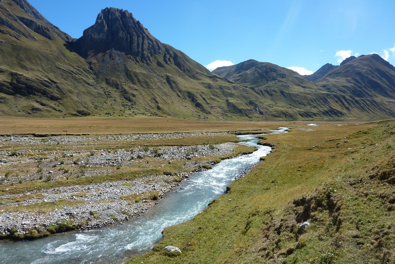 Le parcours est majestueux. On se baigne les pieds dans le torrent gelé... l'eau est limpide et nous fait le plus grand bien. Les lacs sont vraiment beaux (Lacs de Siùla(4300m), Quesillococha(4330m)...), les couleurs oscillent entre le turquoise et le vert, puis vers le rouille et le rouge des sols de zinc, de fer et d'argent. Les croutes neigeuses des sommets forment de magnifiques toits de poudreuse aux crevasses gigantesques. Les séracs, les moraines, les cascades et torrents sont magnifiques et règnent silencieux dans un panorama à vous couper le souffle.
