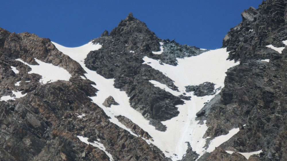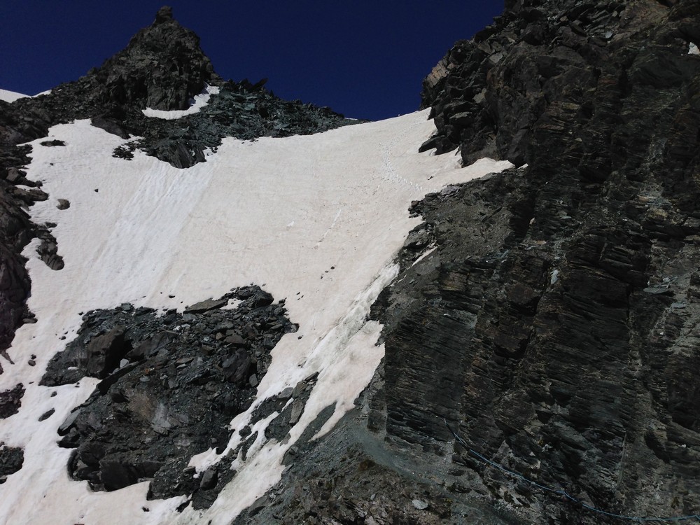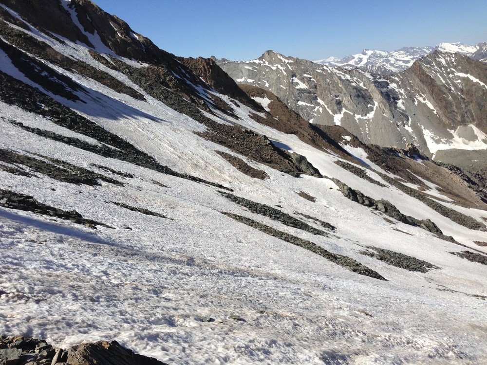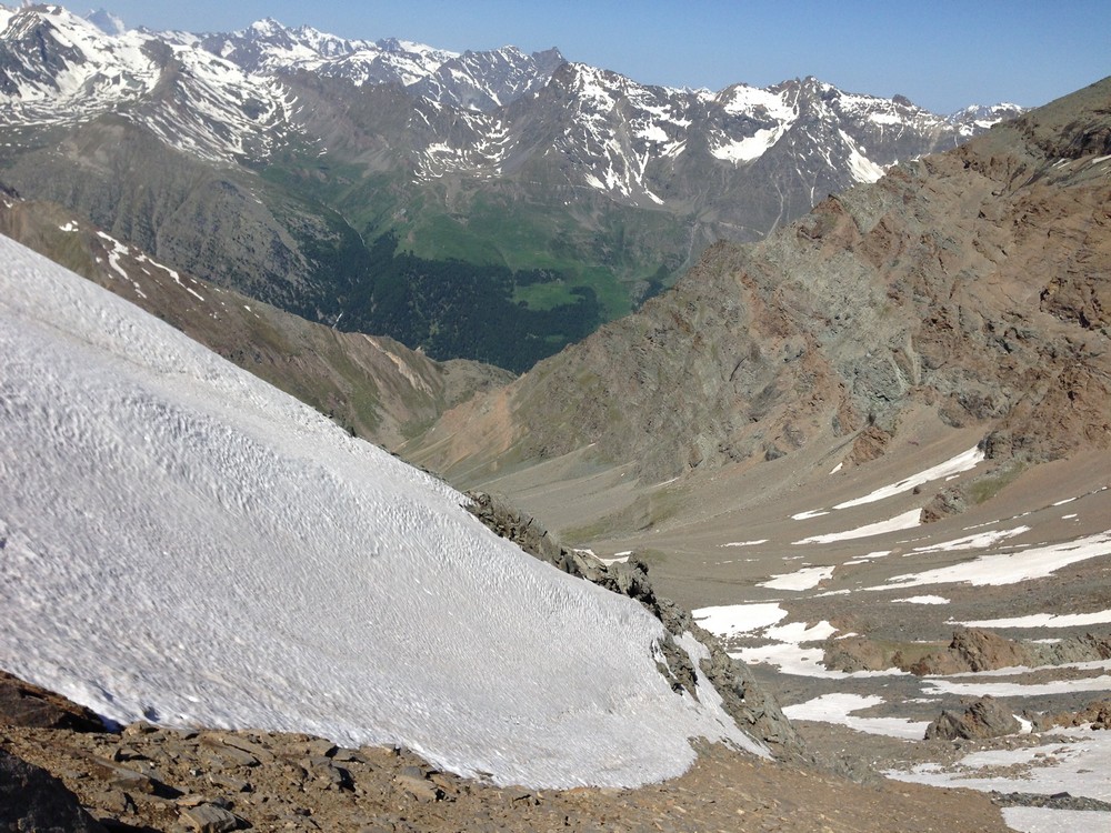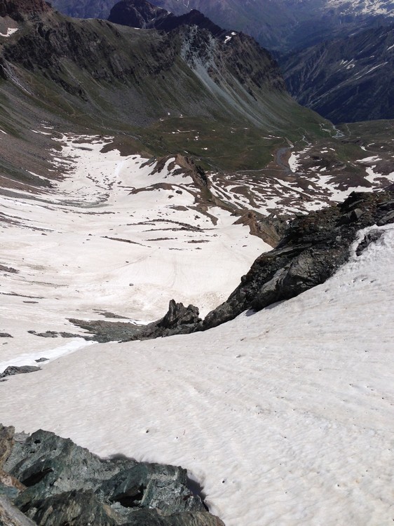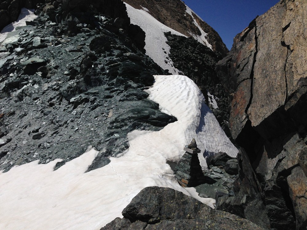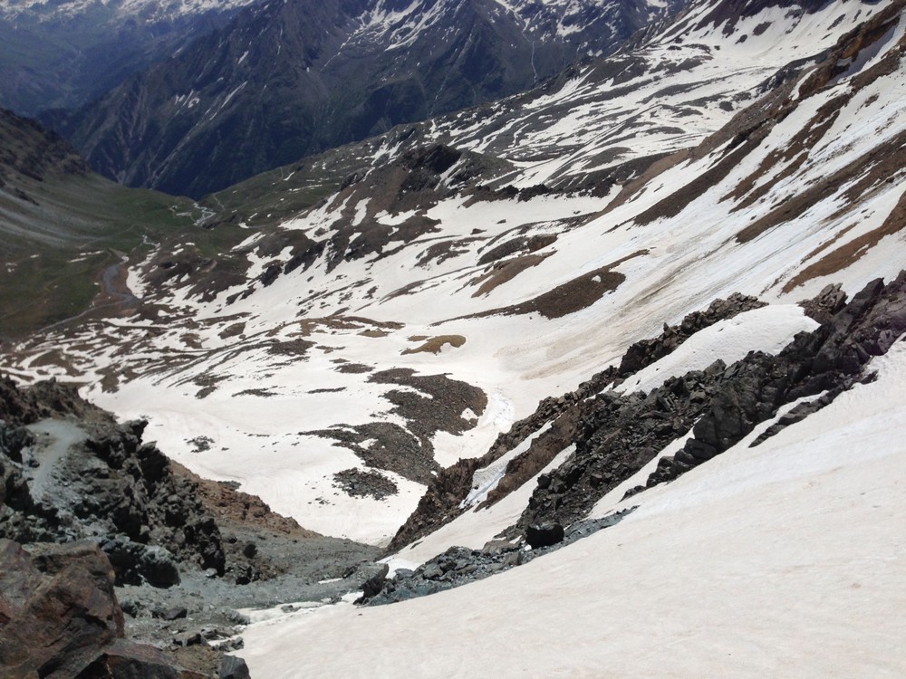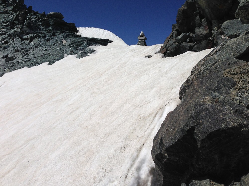 Longue montée dans les sapins qui disparaissent vers 2150 m puis la pente continue assez fortement le long des torrents jusqu'à 3100 m où je rencontre quelques bouquetins. Les derniers 200 m ont été particulièrement difficiles et je ne désire vraiment pas revenir en arrière. La neige a tout envahi et le chemin a vite disparu. Je ne vois pas le cairn indiquant le passage du col (3299 m). Il n'y a aucune trace de pas et je monte donc sur une partie rocailleuse pour atteindre la crête. Une fois celle-ci atteinte, je découvre ma position à environ 50 mêtres à gauche du passage. Il me faut donc longer la roche à l'aide de mes mains pour atteindre celui-ci. Basculer sur l'autre versant ne sera pas de tout repos car je dois emprunter un névé très abrupte. La plus grande prudence est de rigueur ! Chaque pas est minutieusement controlé et les bâtons sont ma survie.