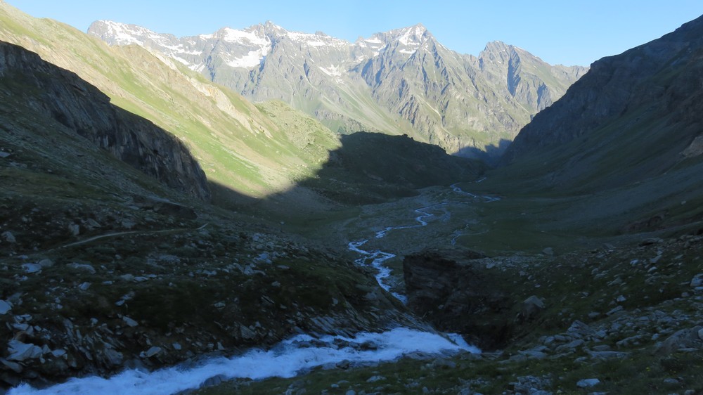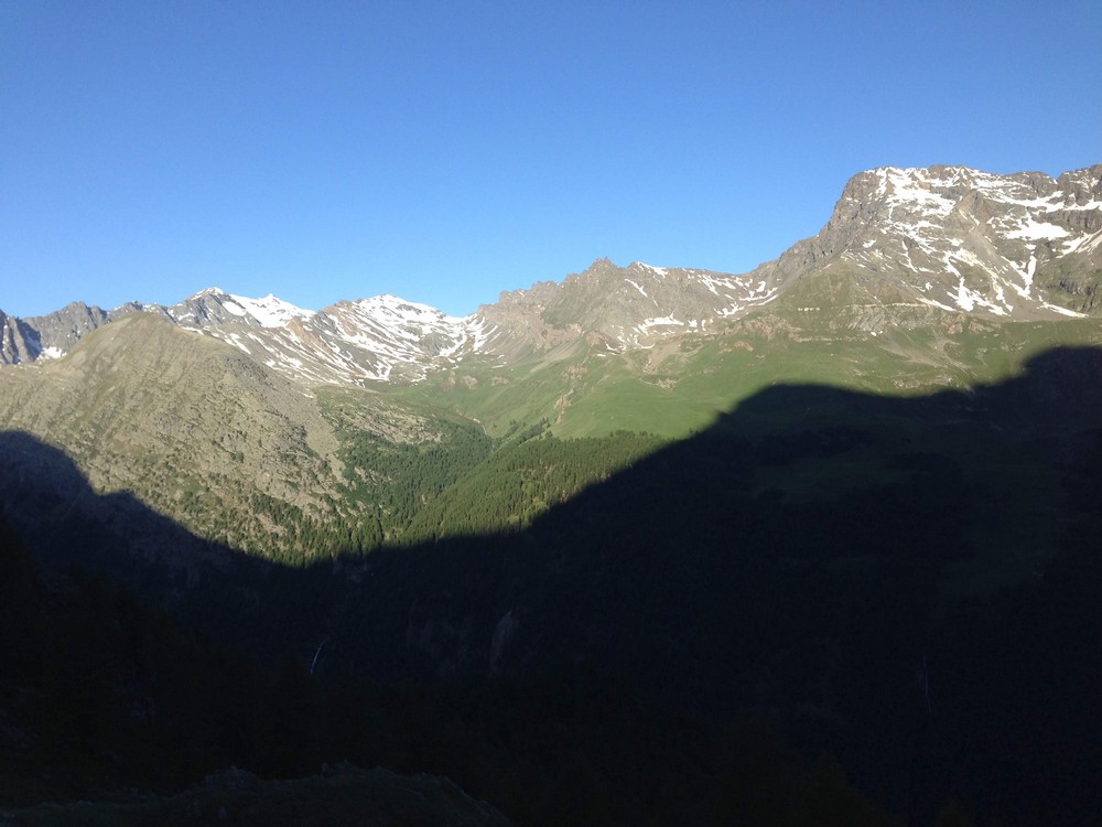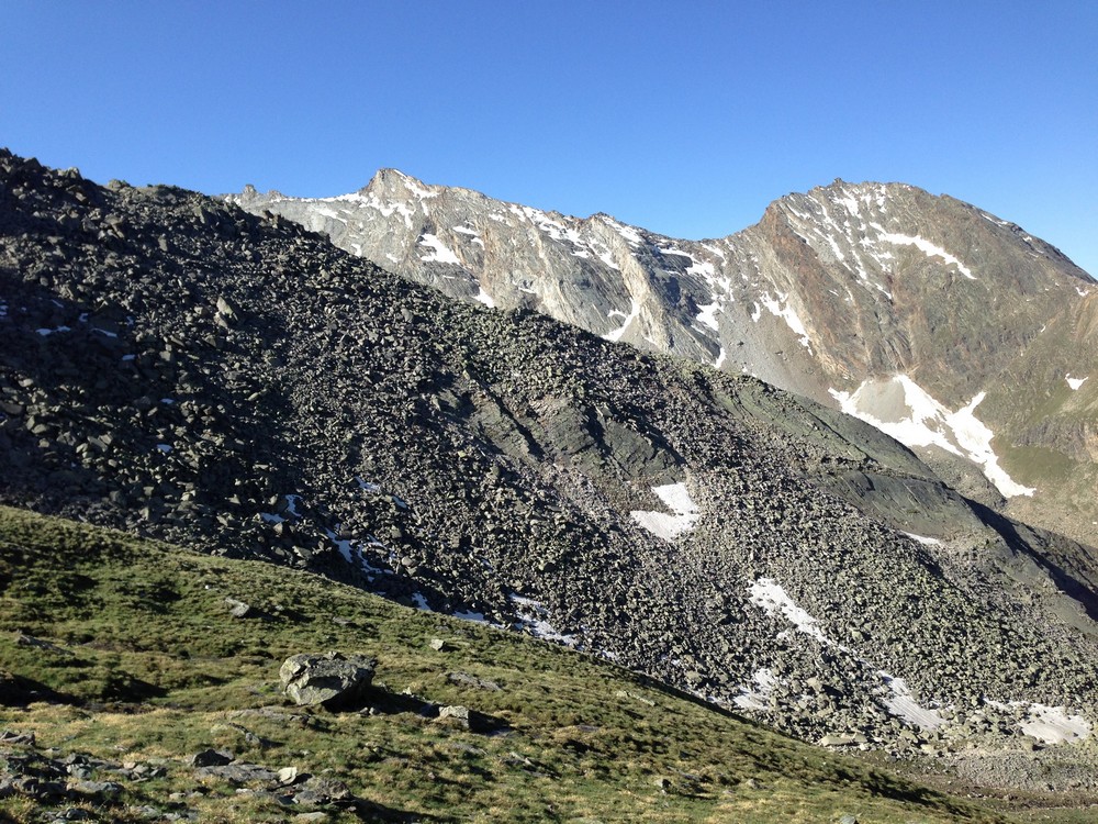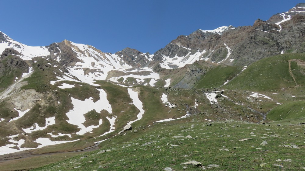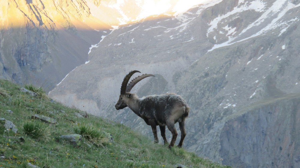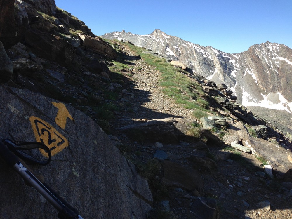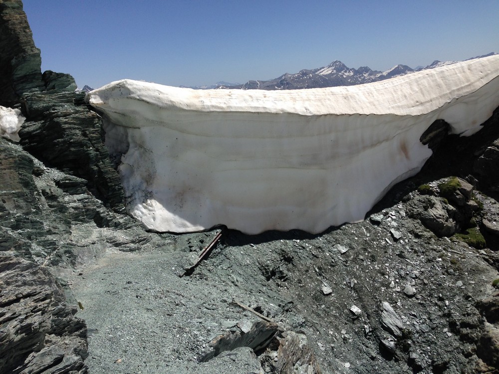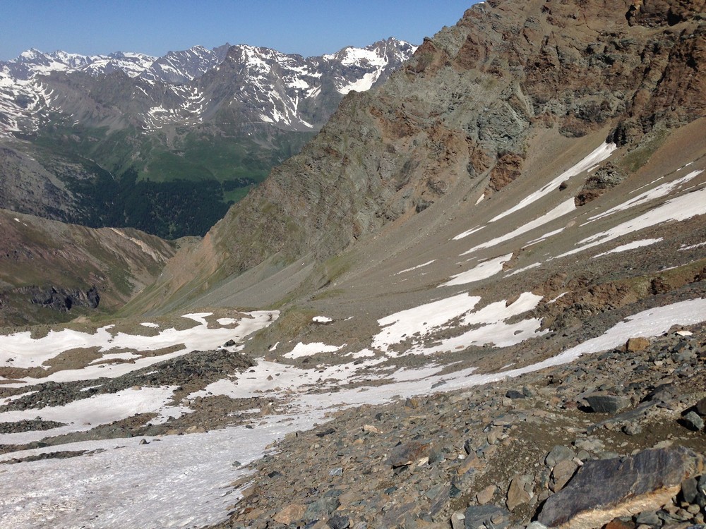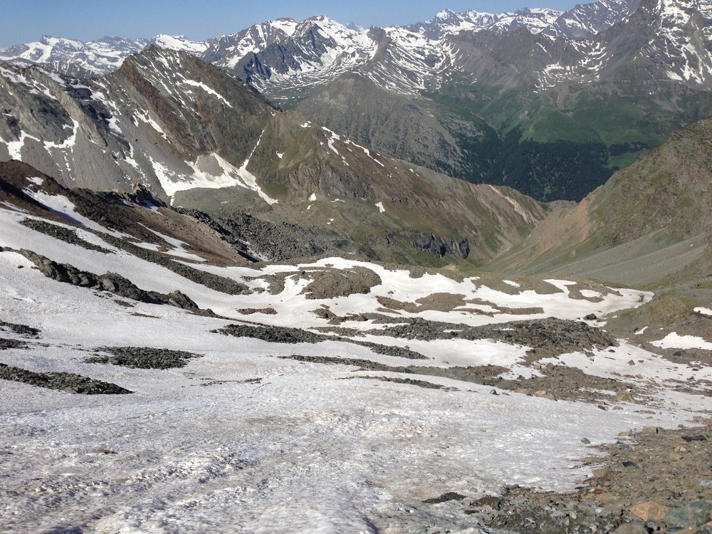 Longue montée dans les sapins qui disparaissent vers 2150 m puis la pente continue assez fortement le long des torrents jusqu'à 3100 m où je rencontre quelques bouquetins. Les derniers 200 m ont été particulièrement difficiles et je ne désire vraiment pas revenir en arrière. La neige a tout envahi et le chemin a vite disparu. Je ne vois pas le cairn indiquant le passage du col (3299 m). Il n'y a aucune trace de pas et je monte donc sur une partie rocailleuse pour atteindre la crête. Une fois celle-ci atteinte, je découvre ma position à environ 50 mêtres à gauche du passage. Il me faut donc longer la roche à l'aide de mes mains pour atteindre celui-ci. Basculer sur l'autre versant ne sera pas de tout repos car je dois emprunter un névé très abrupte. La plus grande prudence est de rigueur ! Chaque pas est minutieusement controlé et les bâtons sont ma survie.
