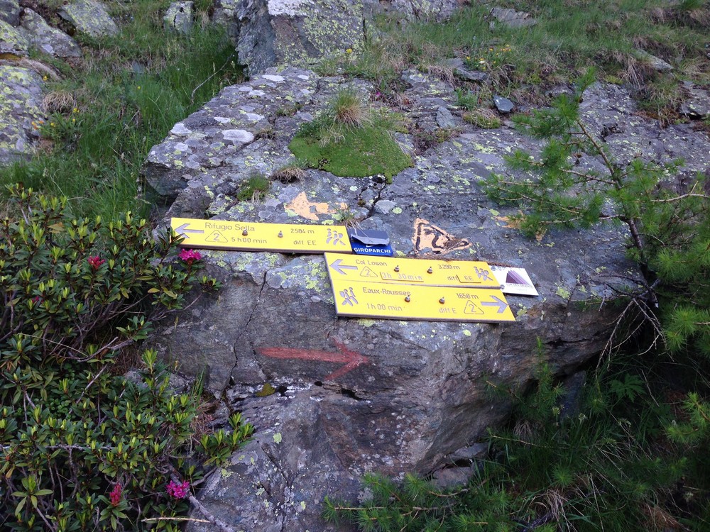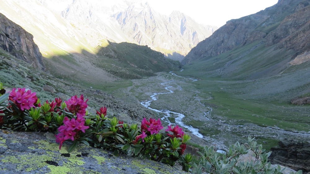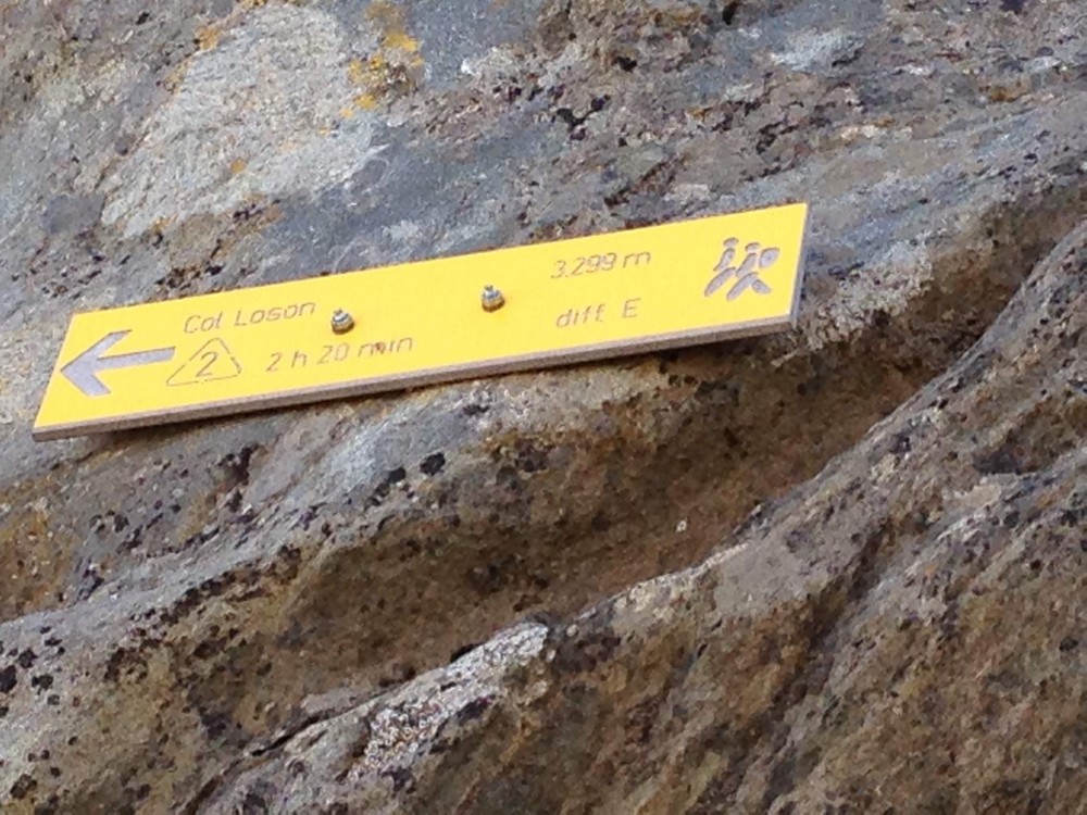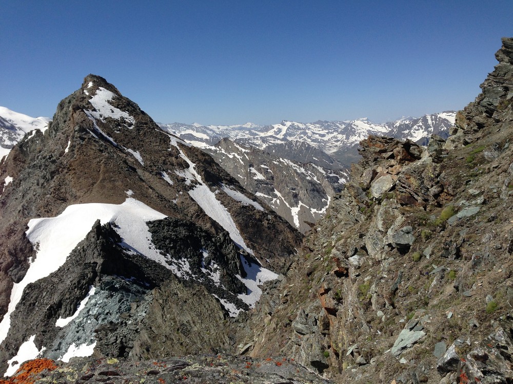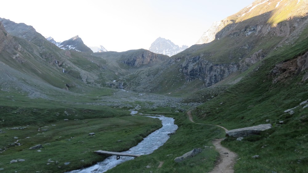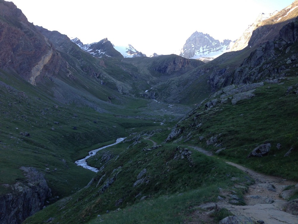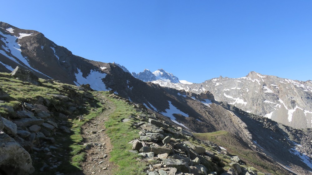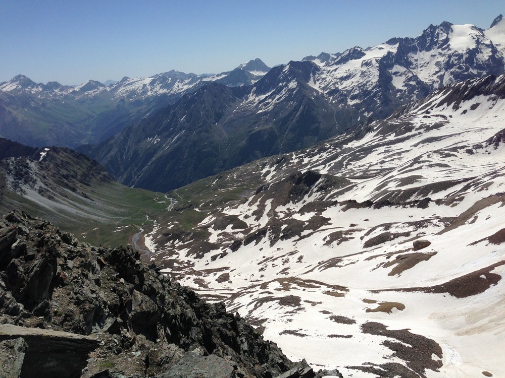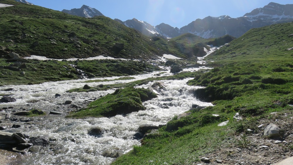 Longue montée dans les sapins qui disparaissent vers 2150 m puis la pente continue assez fortement le long des torrents jusqu'à 3100 m où je rencontre quelques bouquetins. Les derniers 200 m ont été particulièrement difficiles et je ne désire vraiment pas revenir en arrière. La neige a tout envahi et le chemin a vite disparu. Je ne vois pas le cairn indiquant le passage du col (3299 m). Il n'y a aucune trace de pas et je monte donc sur une partie rocailleuse pour atteindre la crête. Une fois celle-ci atteinte, je découvre ma position à environ 50 mêtres à gauche du passage. Il me faut donc longer la roche à l'aide de mes mains pour atteindre celui-ci. Basculer sur l'autre versant ne sera pas de tout repos car je dois emprunter un névé très abrupte. La plus grande prudence est de rigueur ! Chaque pas est minutieusement controlé et les bâtons sont ma survie.