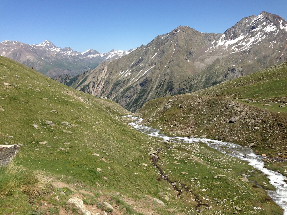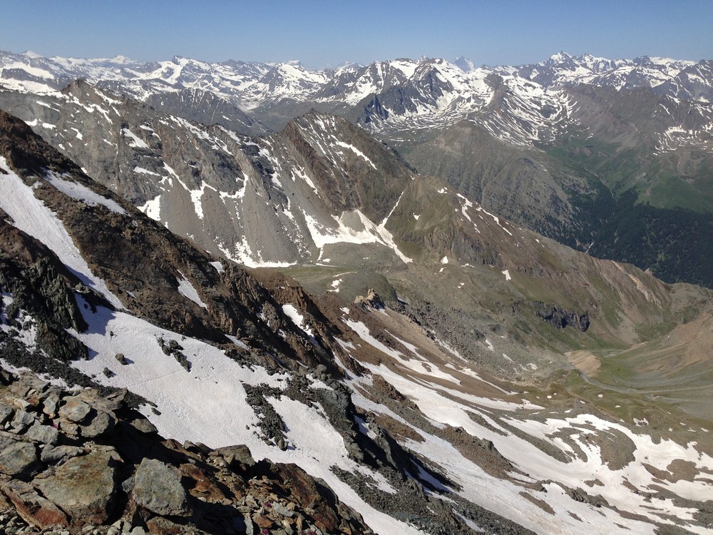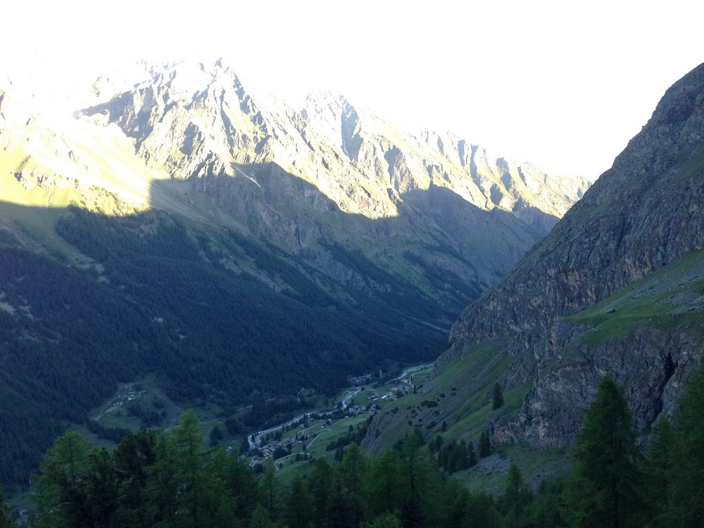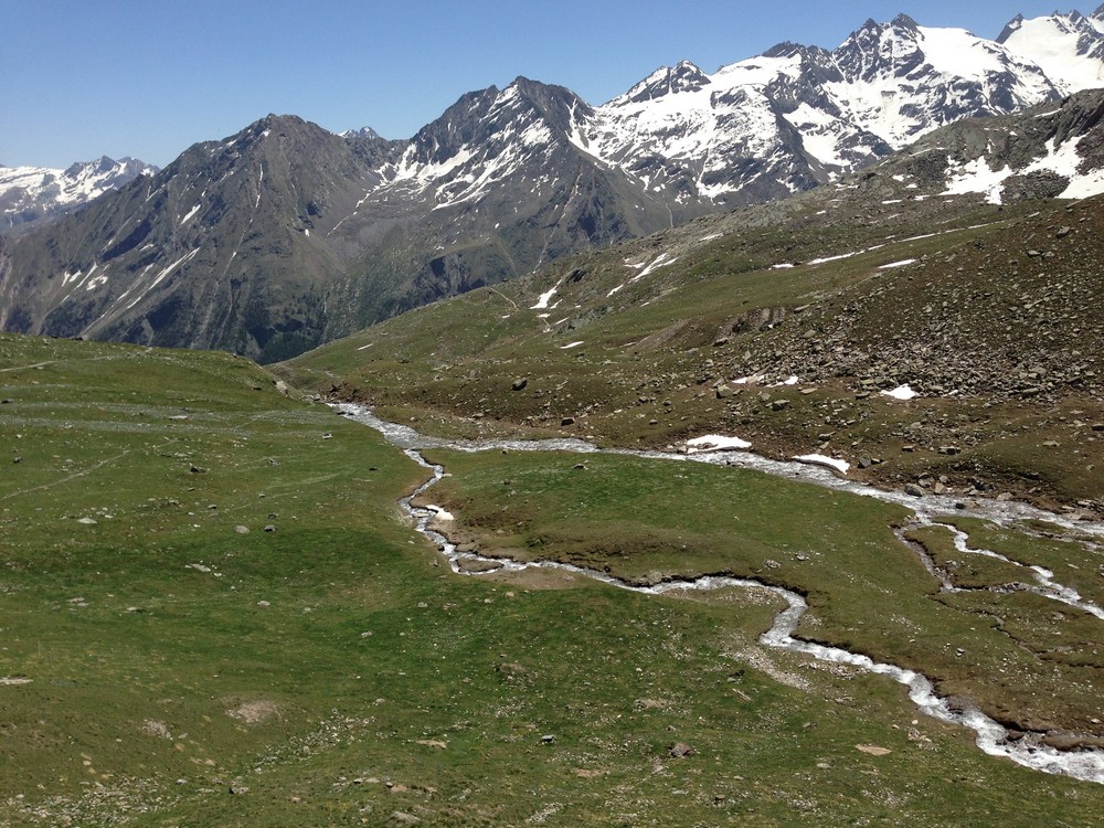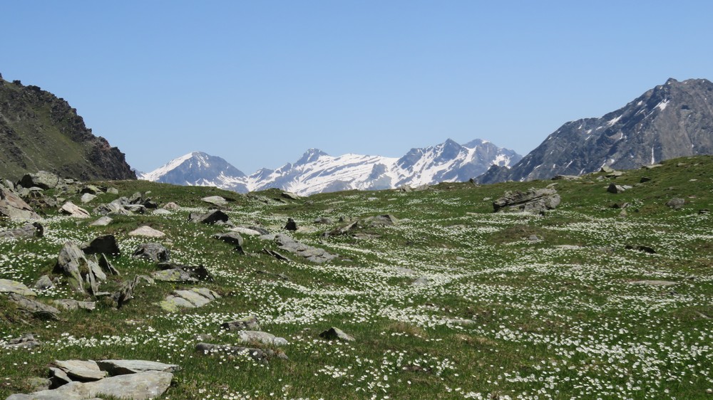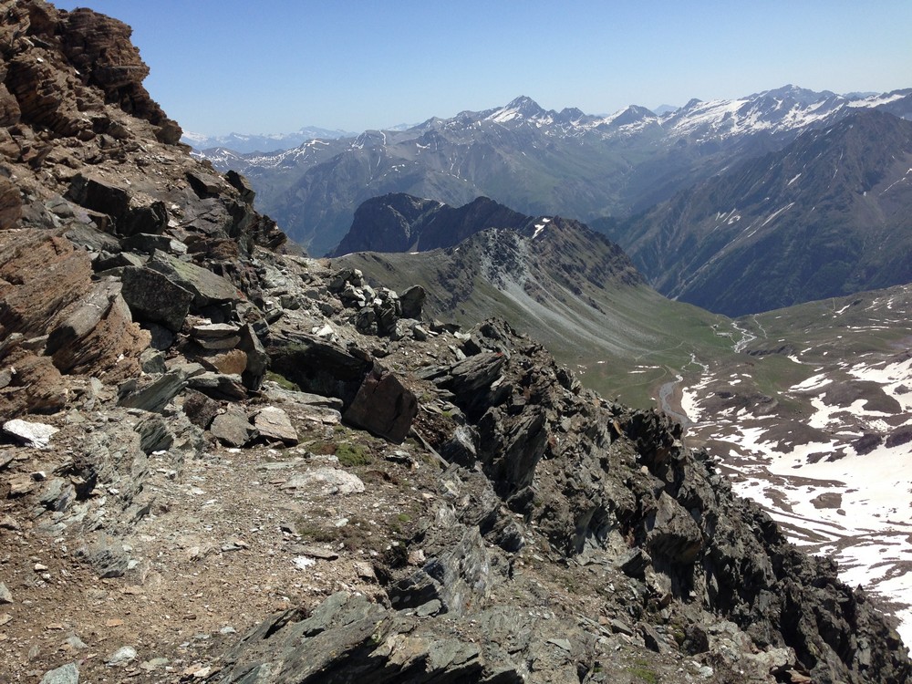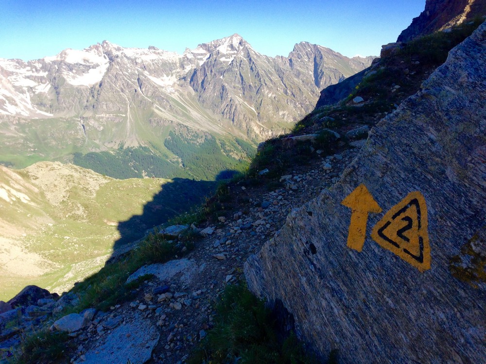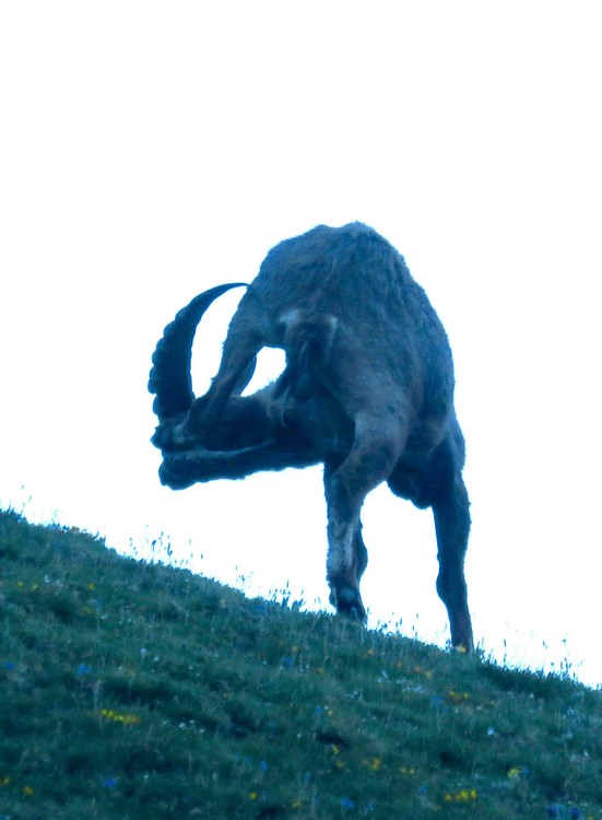 Longue montée dans les sapins qui disparaissent vers 2150 m puis la pente continue assez fortement le long des torrents jusqu'à 3100 m où je rencontre quelques bouquetins. Les derniers 200 m ont été particulièrement difficiles et je ne désire vraiment pas revenir en arrière. La neige a tout envahi et le chemin a vite disparu. Je ne vois pas le cairn indiquant le passage du col (3299 m). Il n'y a aucune trace de pas et je monte donc sur une partie rocailleuse pour atteindre la crête. Une fois celle-ci atteinte, je découvre ma position à environ 50 mêtres à gauche du passage. Il me faut donc longer la roche à l'aide de mes mains pour atteindre celui-ci. Basculer sur l'autre versant ne sera pas de tout repos car je dois emprunter un névé très abrupte. La plus grande prudence est de rigueur ! Chaque pas est minutieusement controlé et les bâtons sont ma survie.