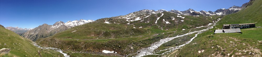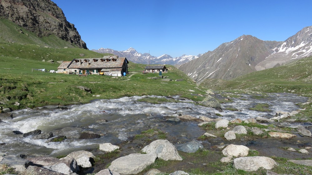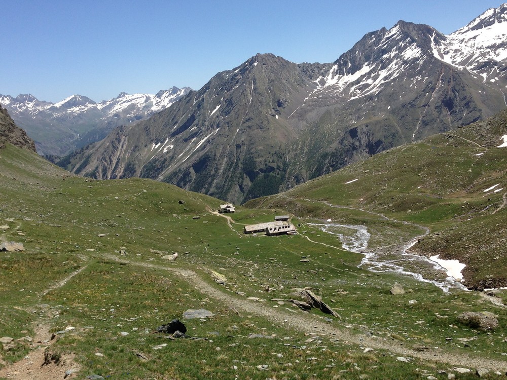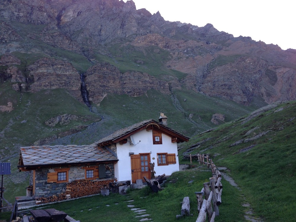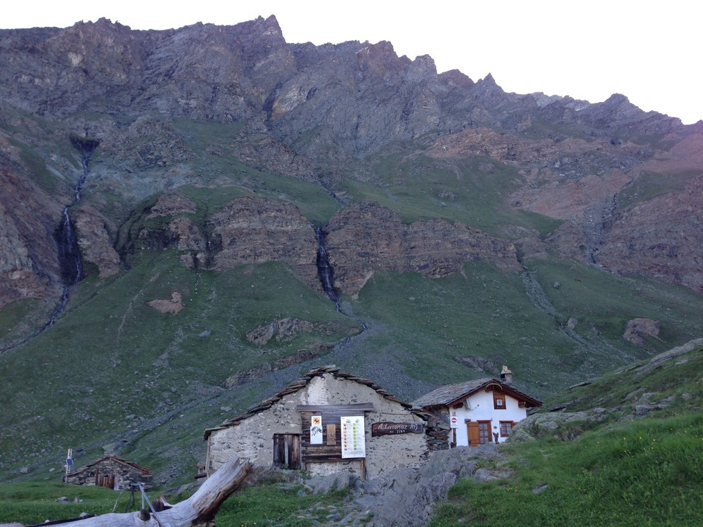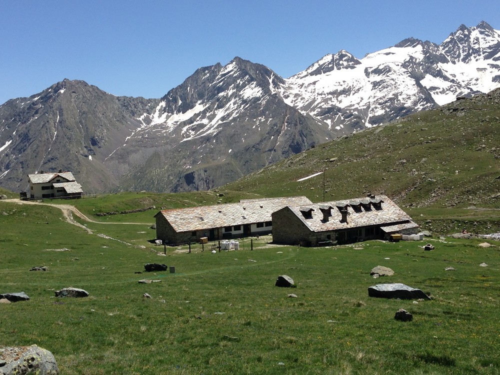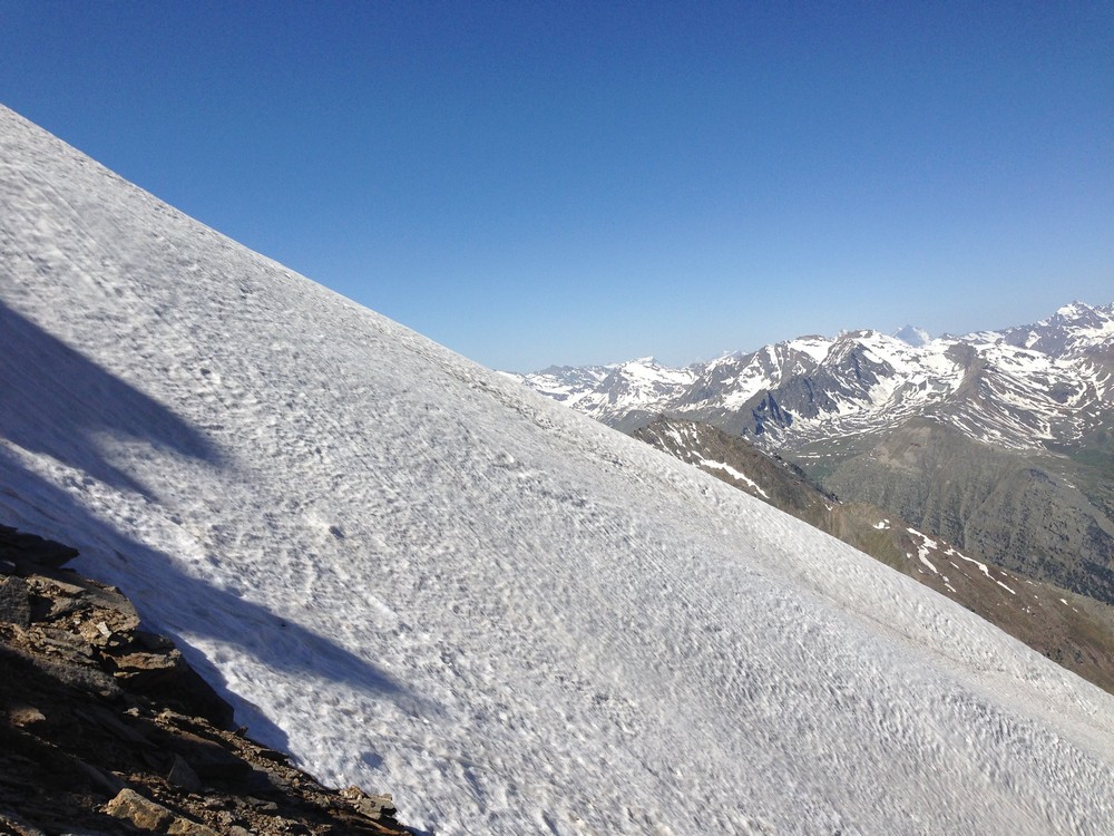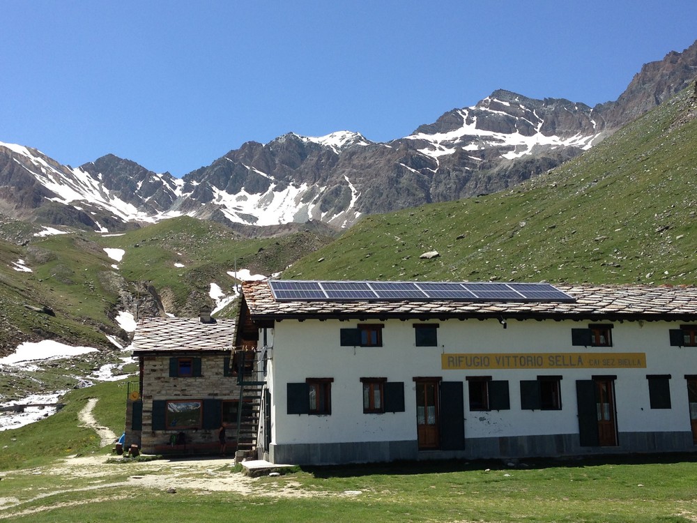 Après avoir traversé de nombreux névés dans une neige de plus en plus molle, me voici finalement aux abords du refuge Vittorio Sella..