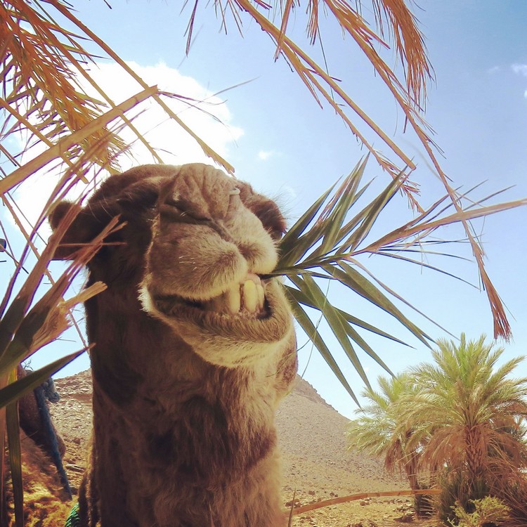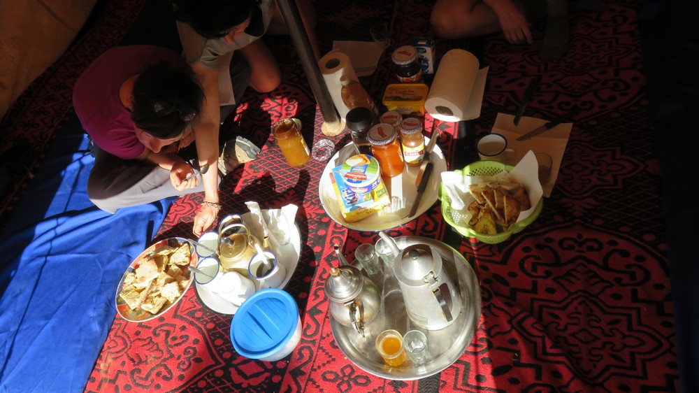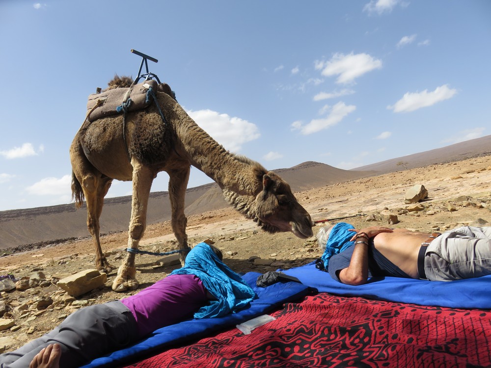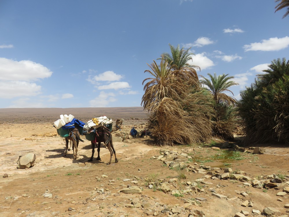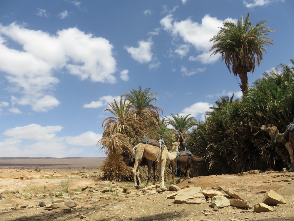 Arrêt pour déjeuner dans l'oasis Achguig où nous prendrons vraiment notre temps car même les dromadaires sont fatigués.. Relaxation, repas complet et hydratation.