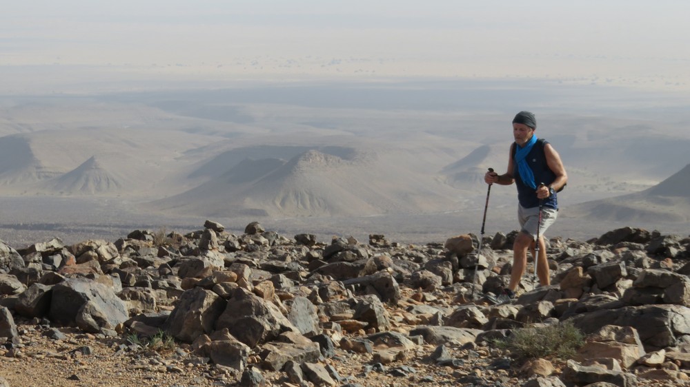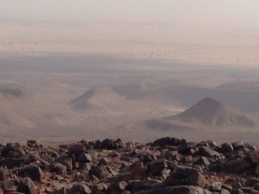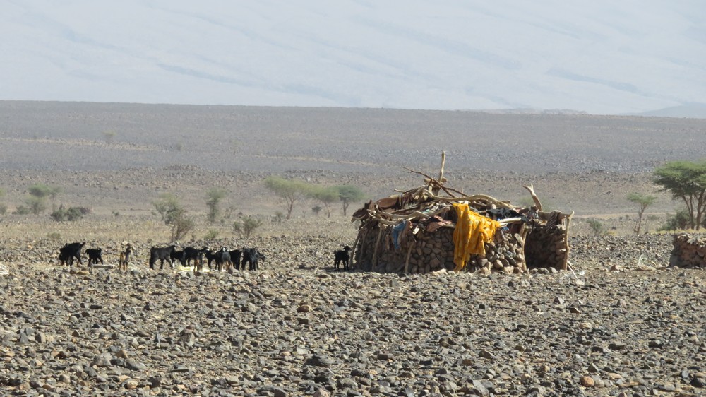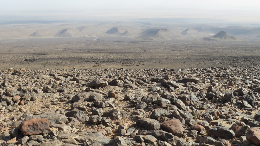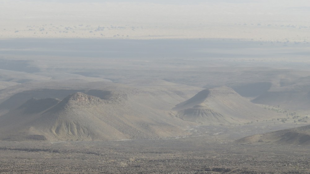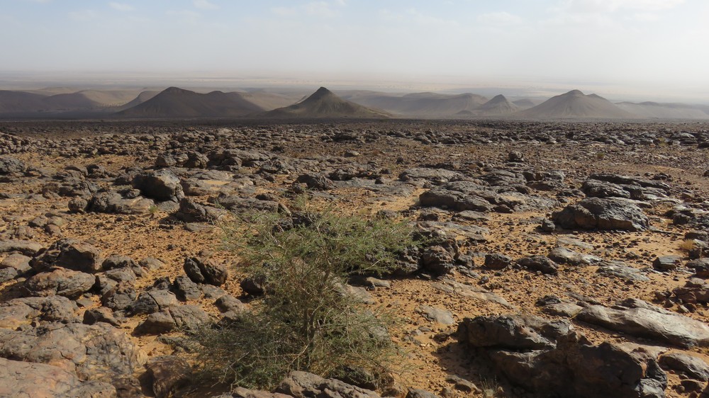 Direction le col Laiouge (1180 m) en cette fin d'après midi à travers des champs de roche arides mais le spectacle est encore au rendez vous.. un panorama lunaire donnant sur les dunes et les collines de pierre volcanique. Nous redescendons de l'autre côté, dans la vallée, pour notre bivouac près de la source Laiouge.