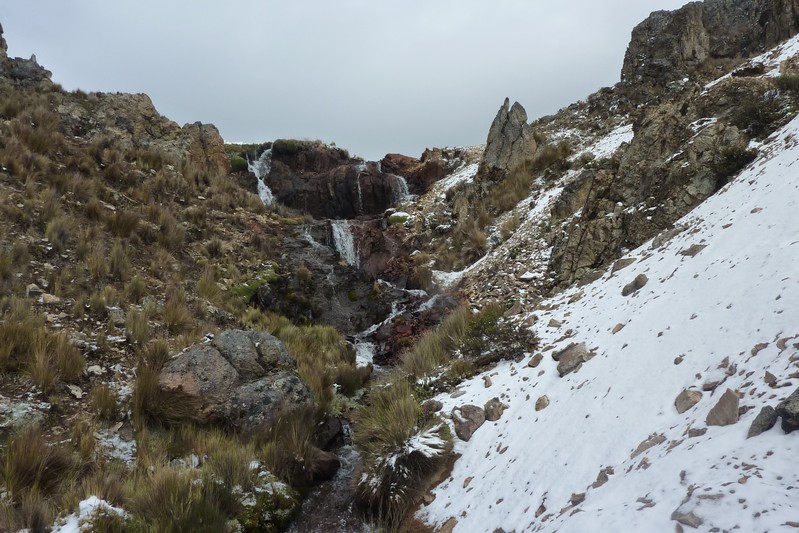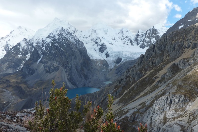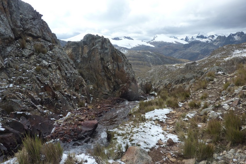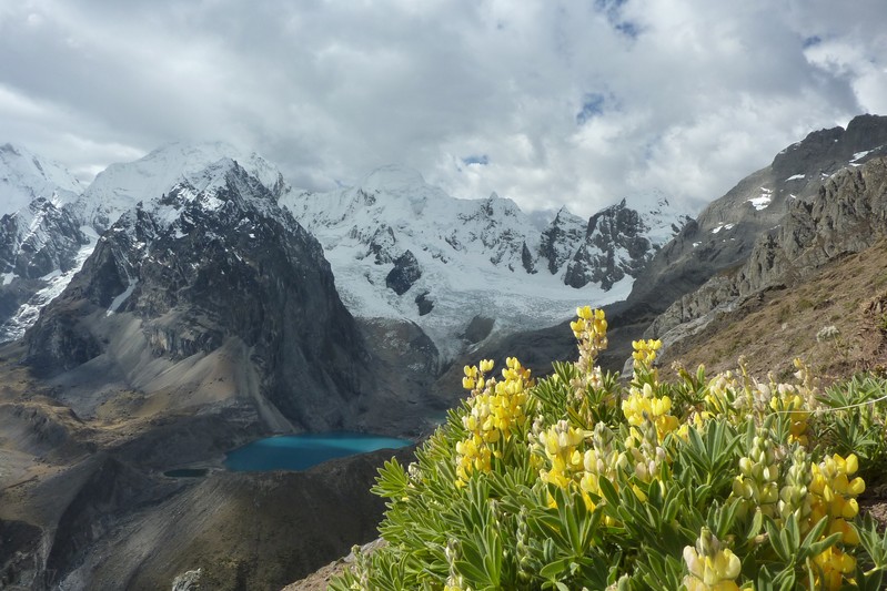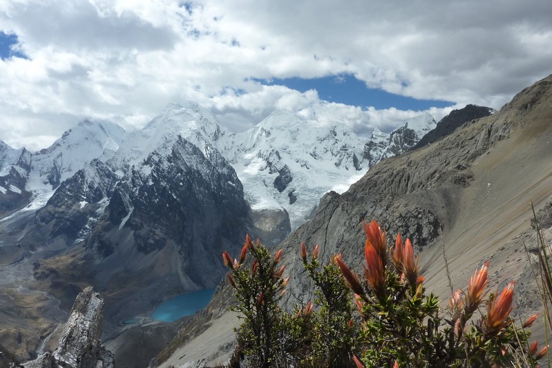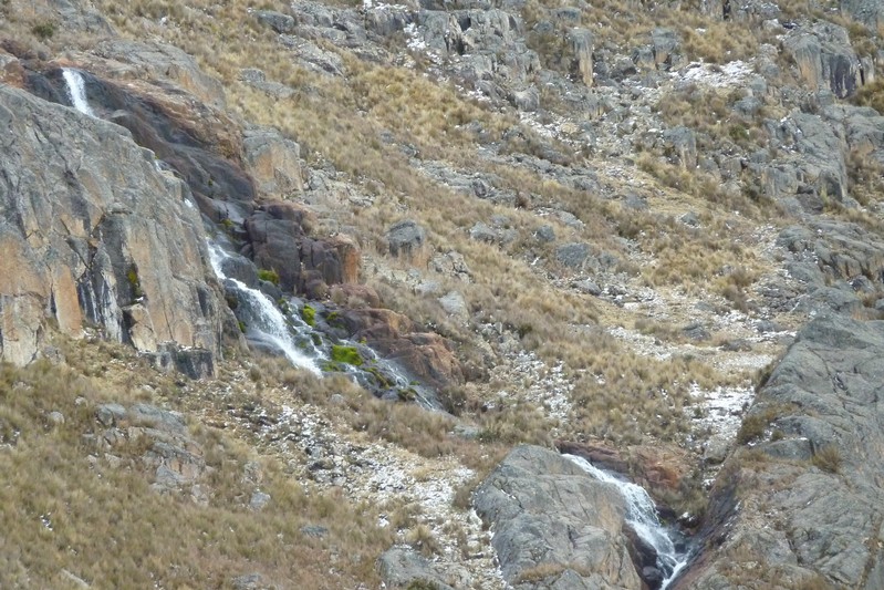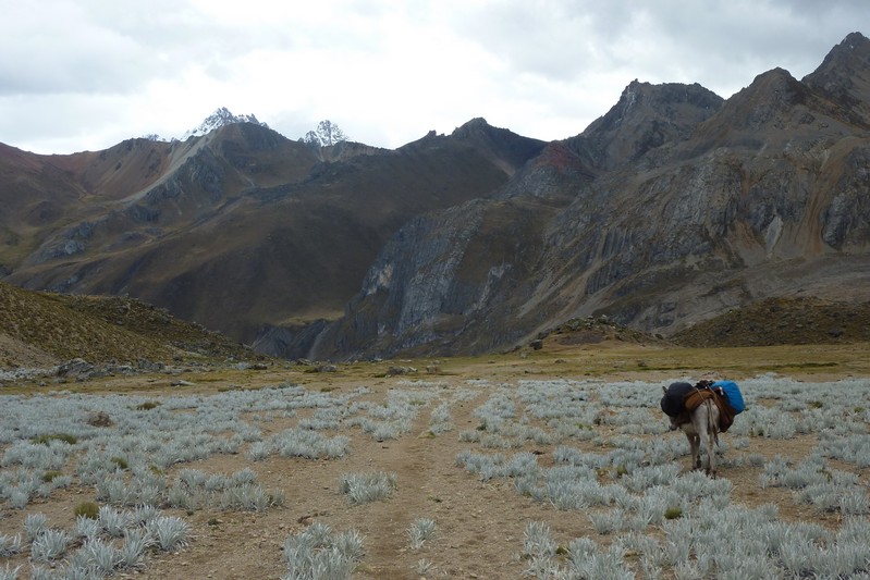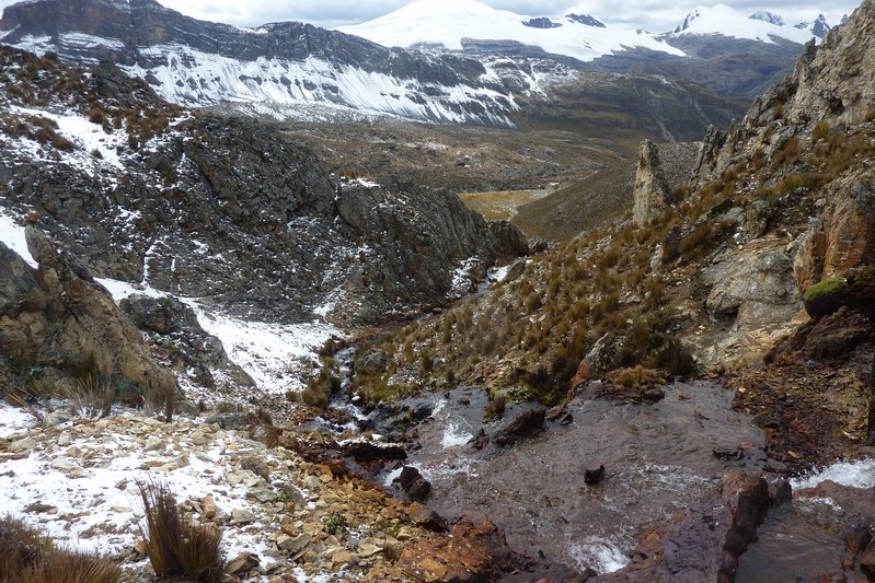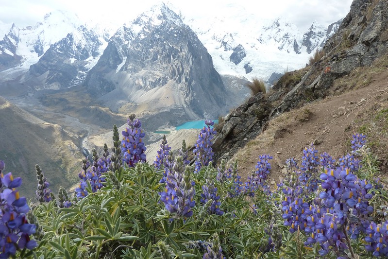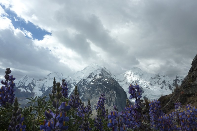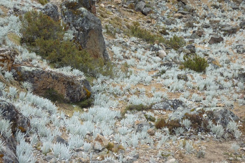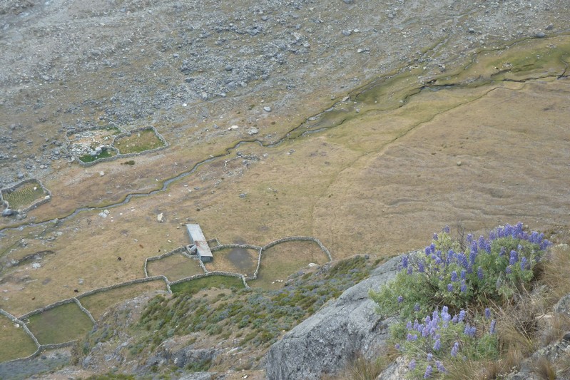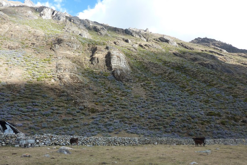 Après un peu de repos bien mérité, nous entammons une descente longue et escarpée à travers les arbustes de fleurs bleues. Le sentier se perd trés vite et je vais couper à travers, au feeling, pour atteindre le bas. Nous avons beau chercher, pas de campsite et pas de place pour la tente. Les animaux ont laissé tant d'excréments que seules les fleurs en profitent.... Nous aurions aimé trouver un paysan pour nous garder nos sacs à dos afin de pouvoir marcher légers vers le camp de base du Siula Grande et retrouver a crête empruntée dans le film 'la mort suspendue'.Mais avec nos sacs, l'aller-retour n'est pas envisageable et nous décidons d'y renoncer. Après un nettoyage grossier, entre pierres et méthane, la tente est finalement placée en surplomb du torrent et face au glacier.