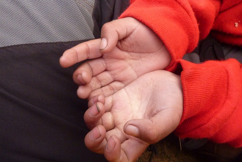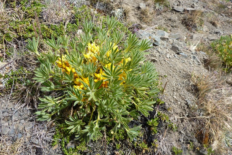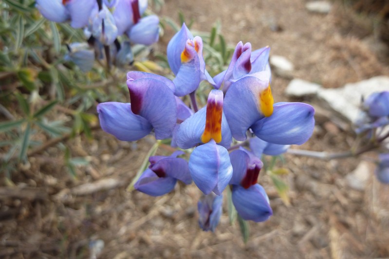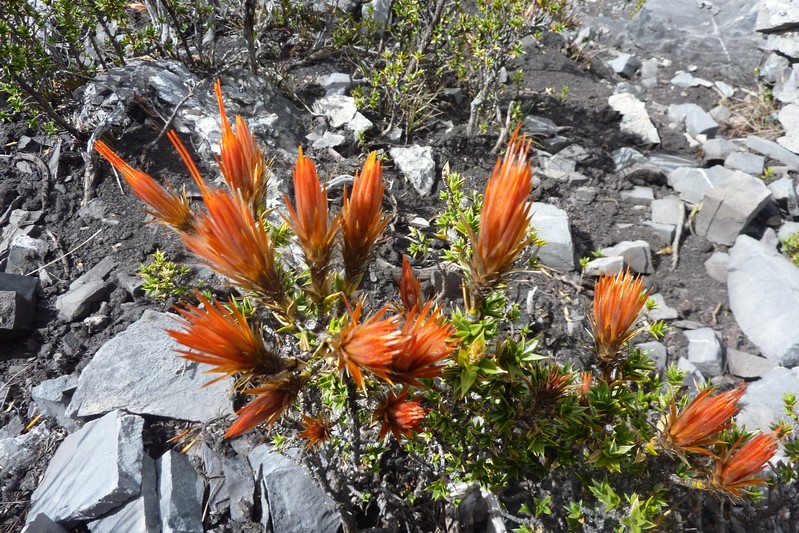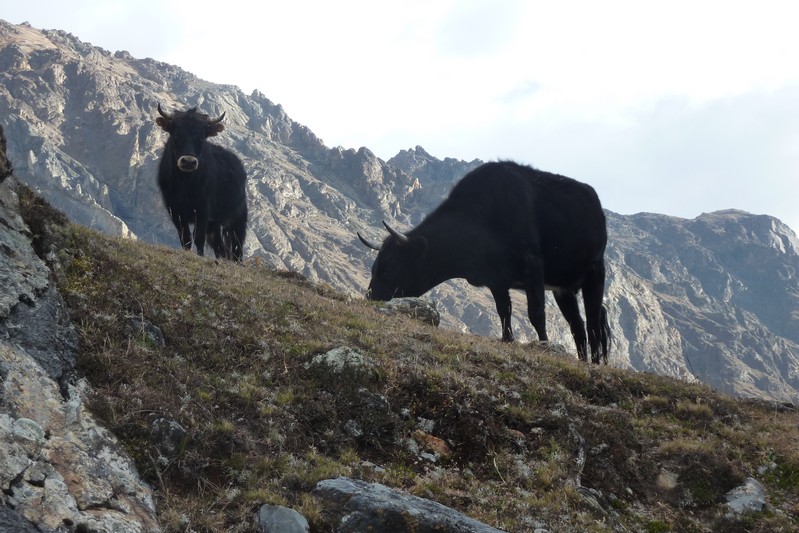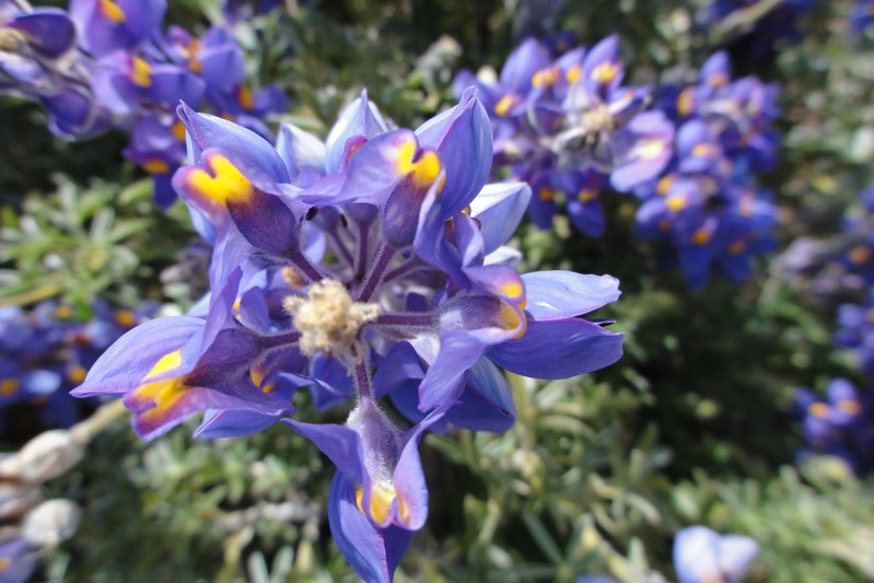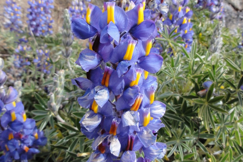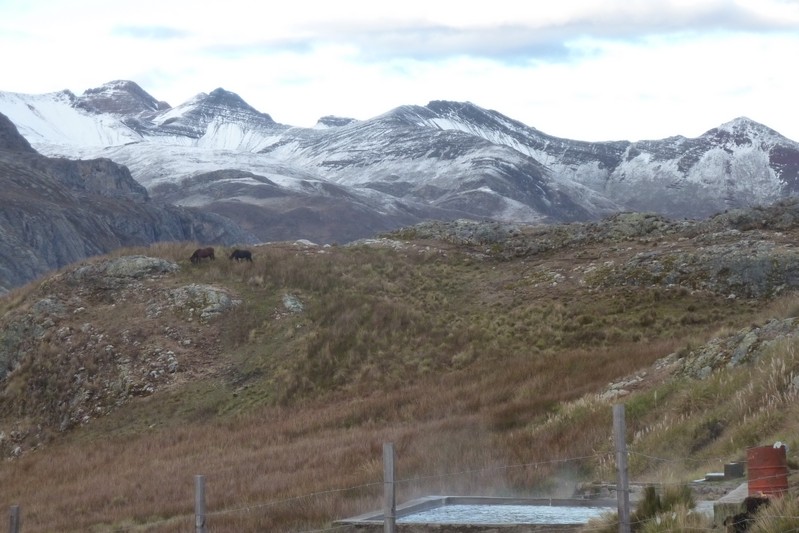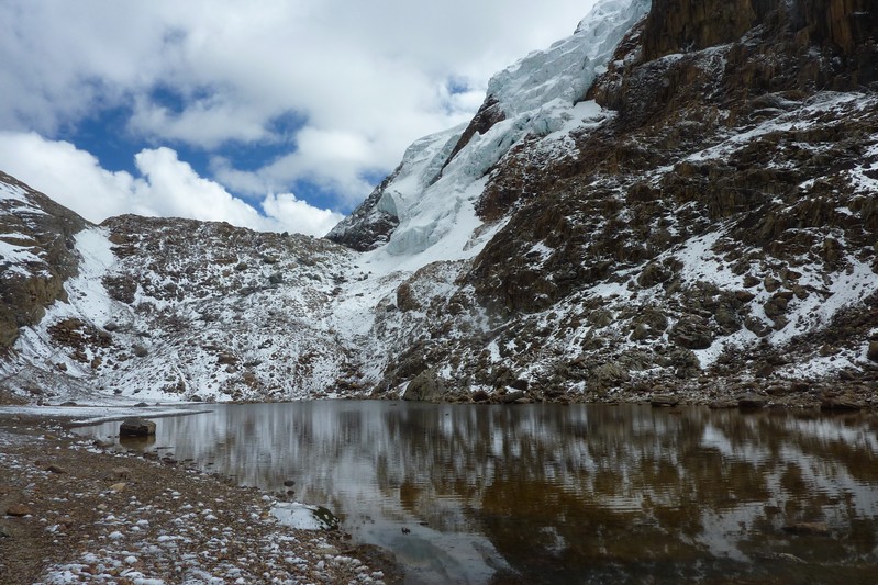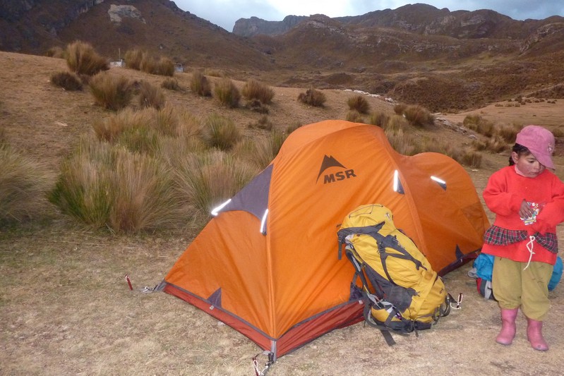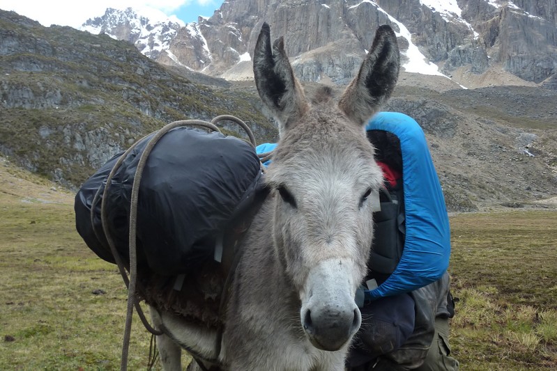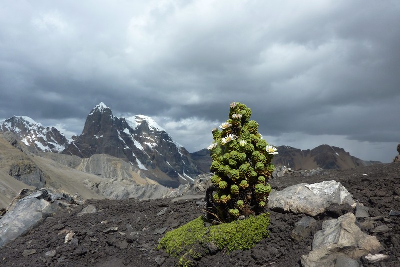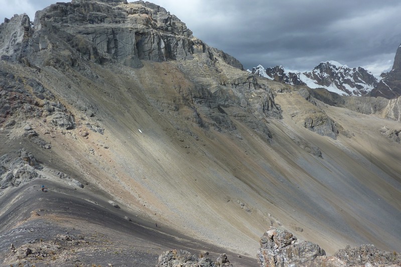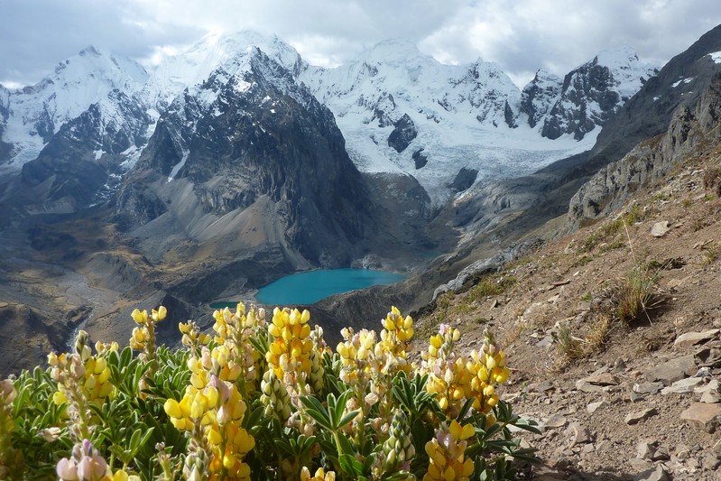 Après un peu de repos bien mérité, nous entammons une descente longue et escarpée à travers les arbustes de fleurs bleues. Le sentier se perd trés vite et je vais couper à travers, au feeling, pour atteindre le bas. Nous avons beau chercher, pas de campsite et pas de place pour la tente. Les animaux ont laissé tant d'excréments que seules les fleurs en profitent.... Nous aurions aimé trouver un paysan pour nous garder nos sacs à dos afin de pouvoir marcher légers vers le camp de base du Siula Grande et retrouver a crête empruntée dans le film 'la mort suspendue'.Mais avec nos sacs, l'aller-retour n'est pas envisageable et nous décidons d'y renoncer. Après un nettoyage grossier, entre pierres et méthane, la tente est finalement placée en surplomb du torrent et face au glacier.