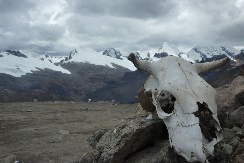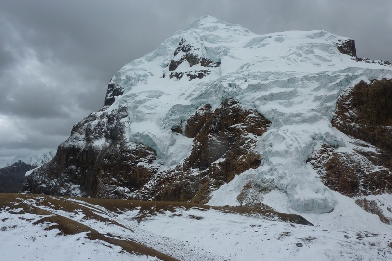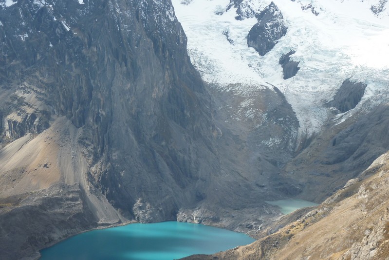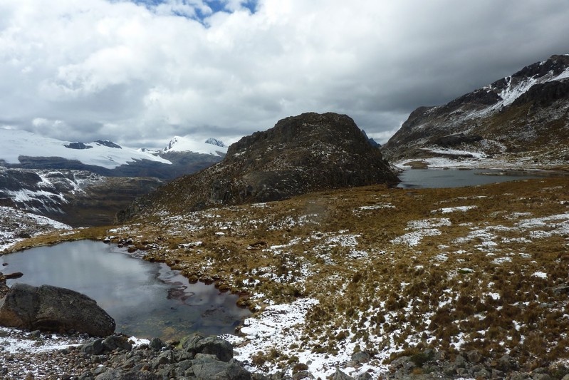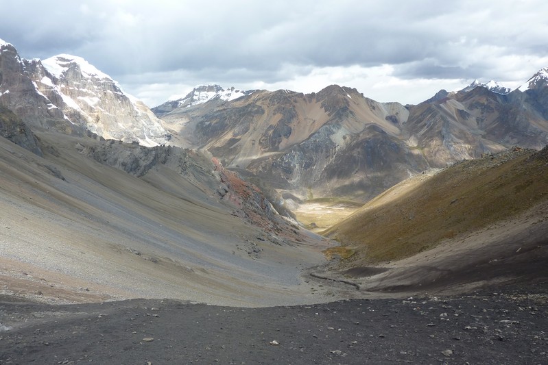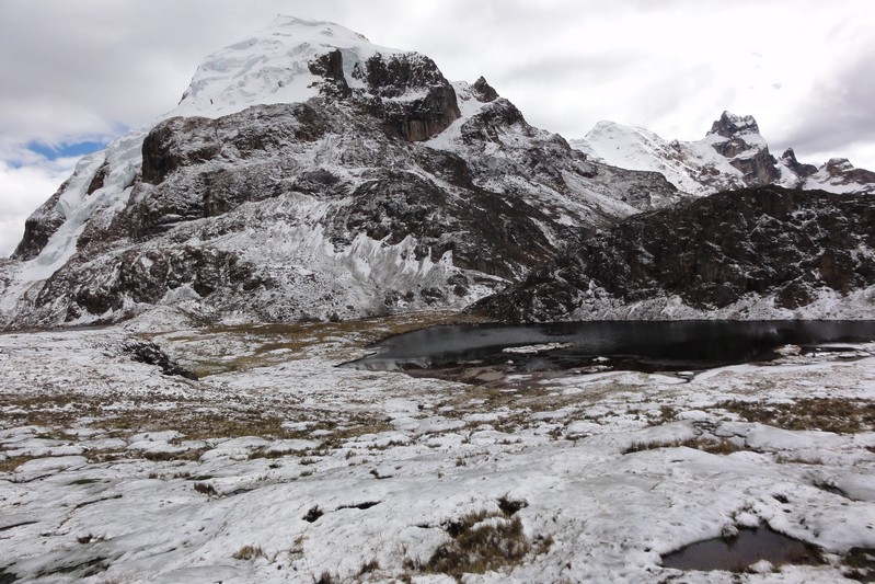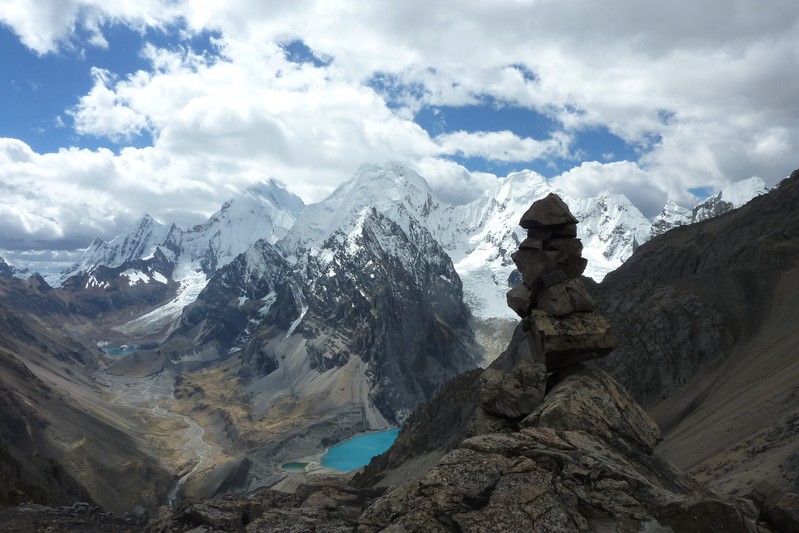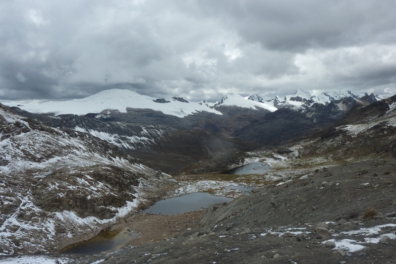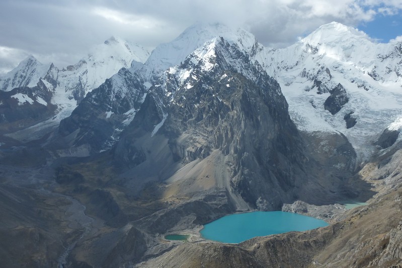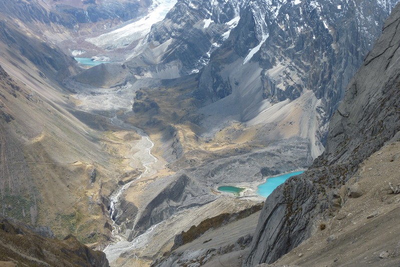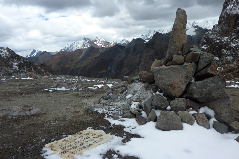 Je me sens en forme aujourd'hui.. L'agua termal m'a fait le plus grand bien. Le passage du premier col (5008 m) se fait sans grande difficulté après avoir longuement emprunté les sentiers enneigés. Une plaque commémorative est placée dans le silence et le vent en mémoire d'Alain. Le second col est plus difficile à atteindre. Peut-être que la fatigue se fait ressentir mais la montée dans une trés longue moraine épuise. Notre volonté a pris le dessus et la Punta Negra a été vaincue ! Le panorama est époustouflant ! Une vue plongeante sur les lacs, les torrents, les glaciers et les séracs du Siula Grande offre un spectacle inoubliable.