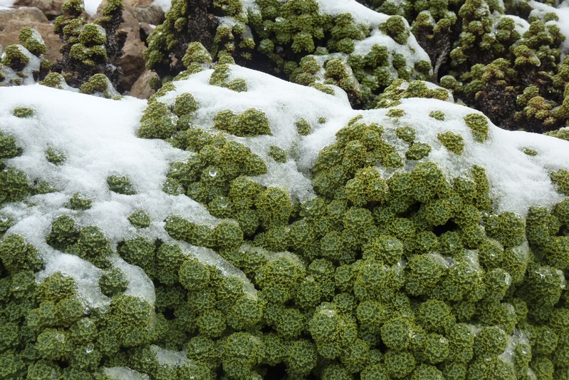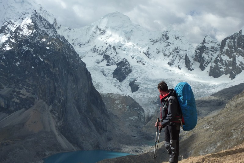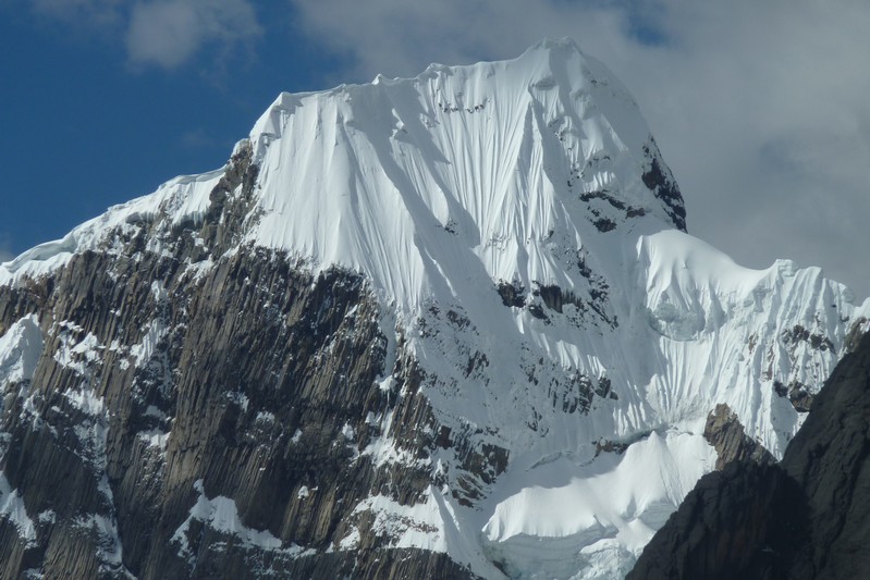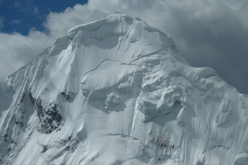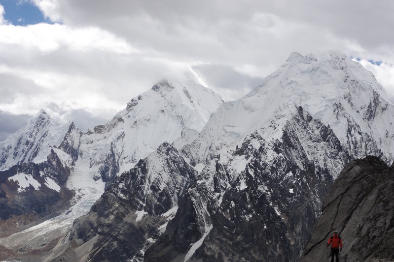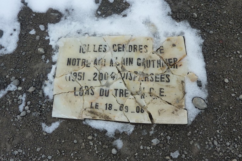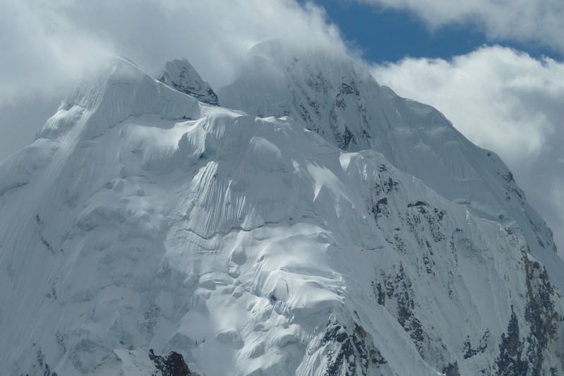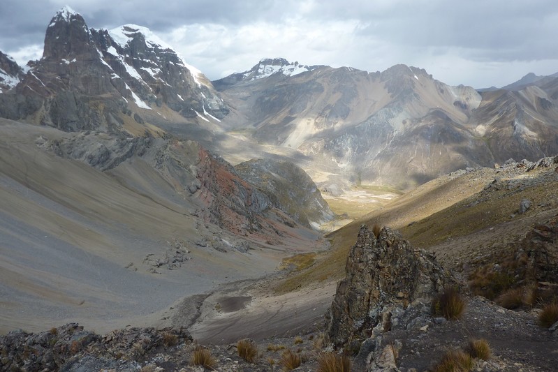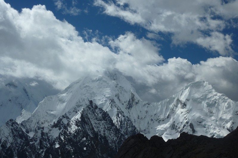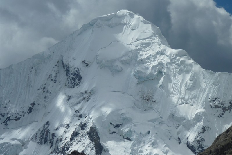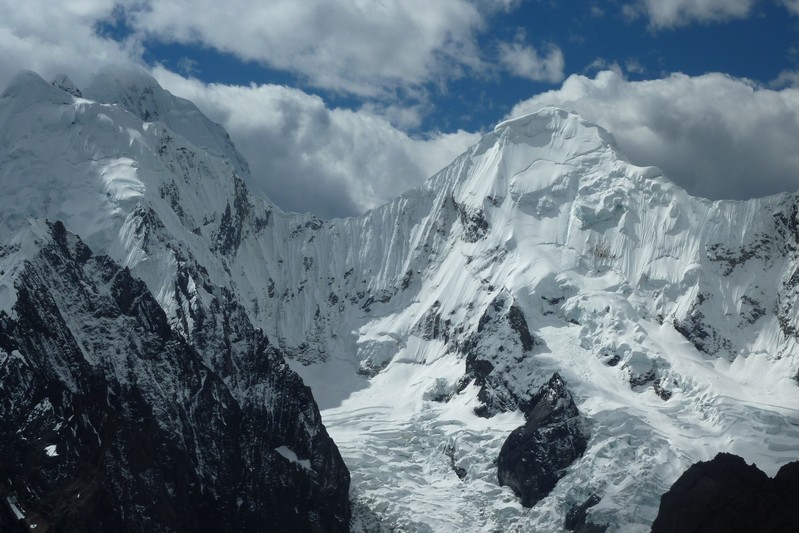 Je me sens en forme aujourd'hui.. L'agua termal m'a fait le plus grand bien. Le passage du premier col (5008 m) se fait sans grande difficulté après avoir longuement emprunté les sentiers enneigés. Une plaque commémorative est placée dans le silence et le vent en mémoire d'Alain. Le second col est plus difficile à atteindre. Peut-être que la fatigue se fait ressentir mais la montée dans une trés longue moraine épuise. Notre volonté a pris le dessus et la Punta Negra a été vaincue ! Le panorama est époustouflant ! Une vue plongeante sur les lacs, les torrents, les glaciers et les séracs du Siula Grande offre un spectacle inoubliable.