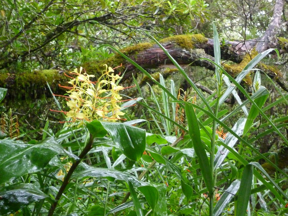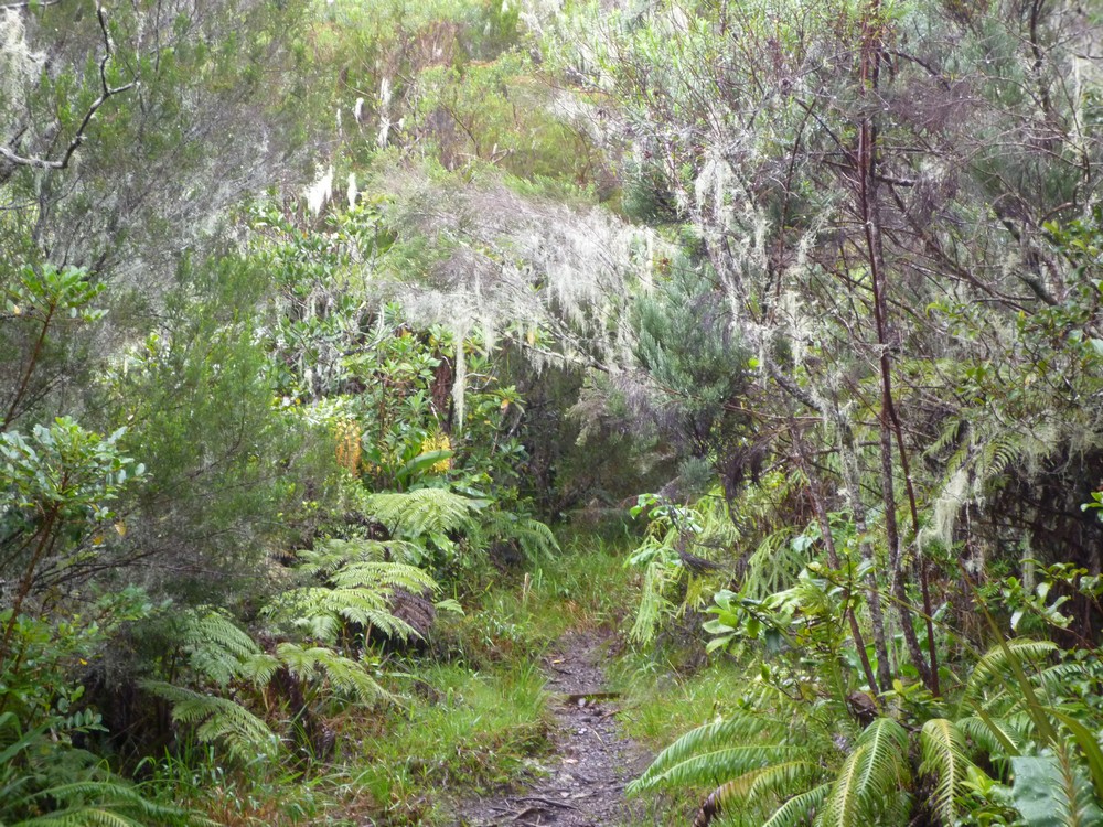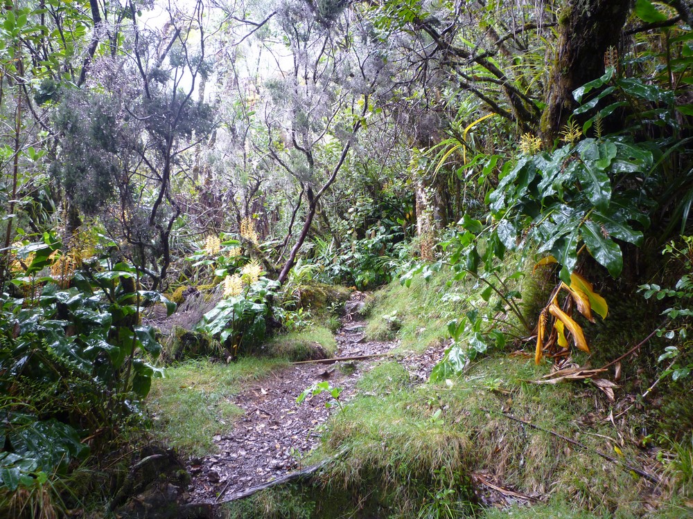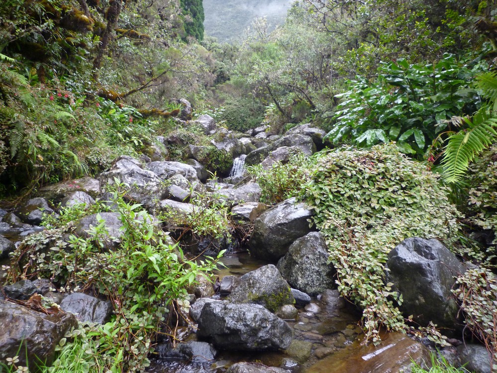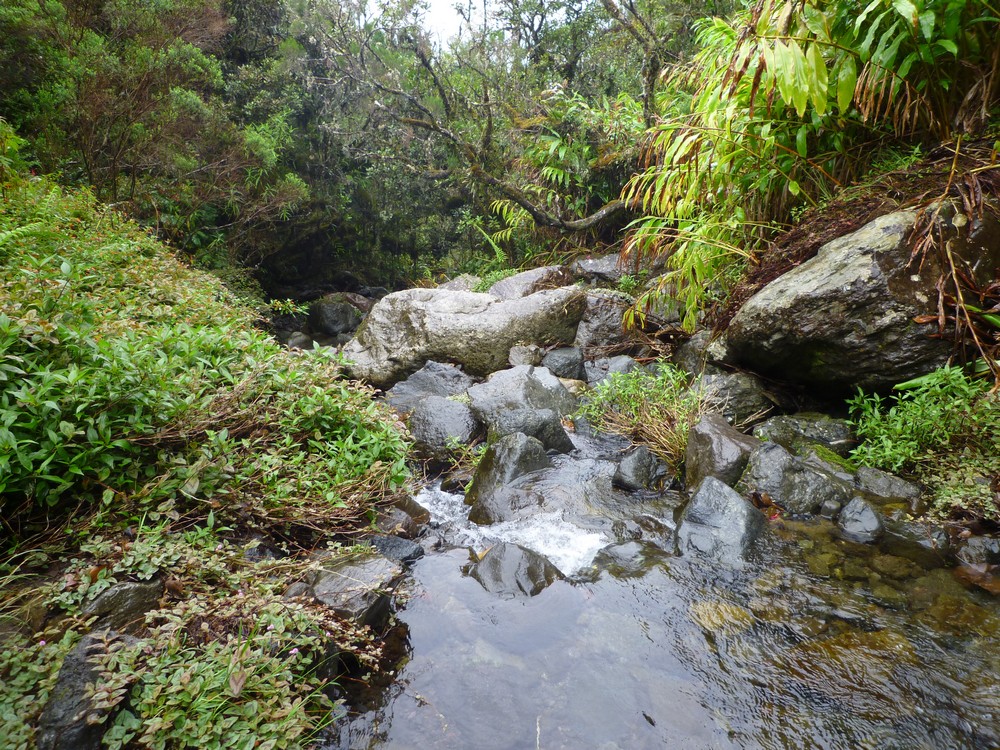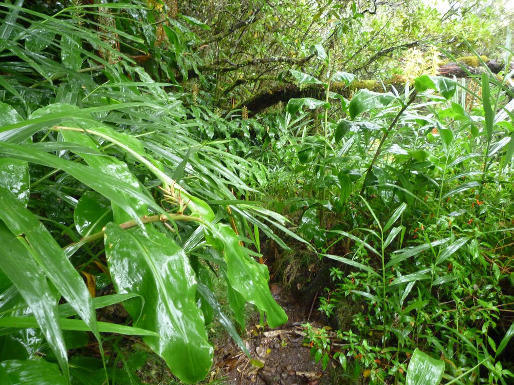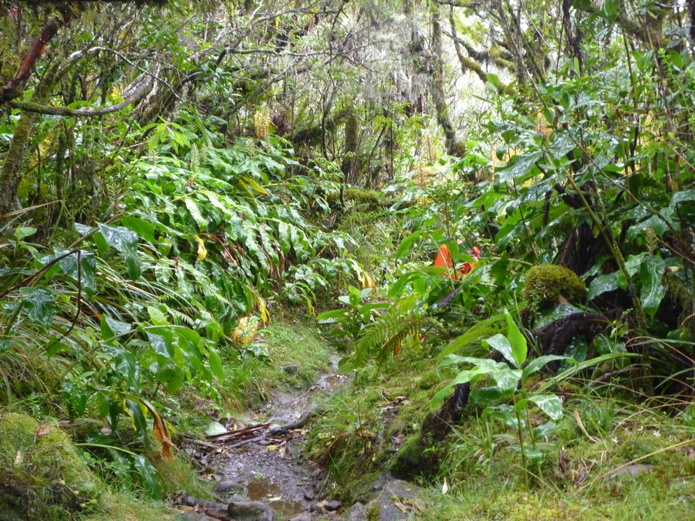 La végétation est trés dense et gorgée d'eau..Cet itinéraire s'avère dangereux, car il nous faut emprunter le chemin sur les roches glissantes et de trés nombreuses
