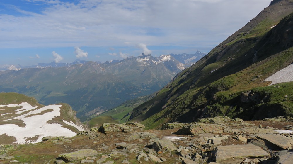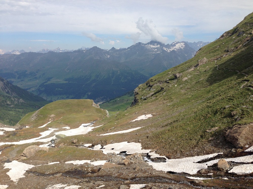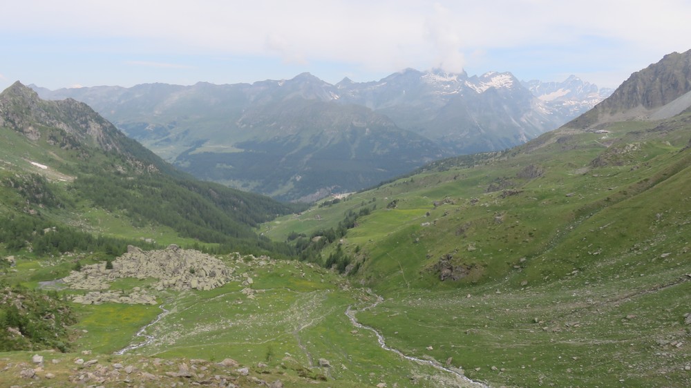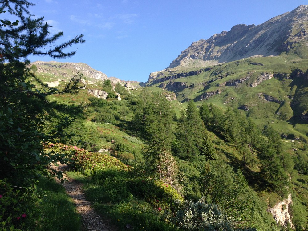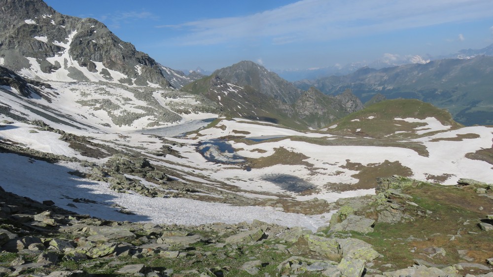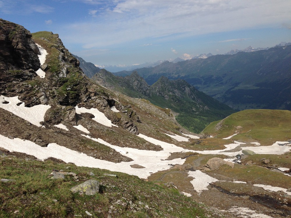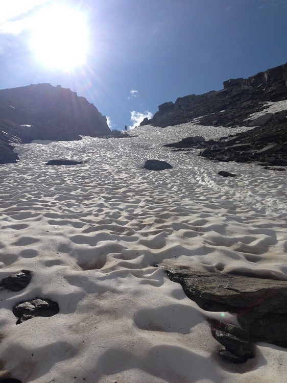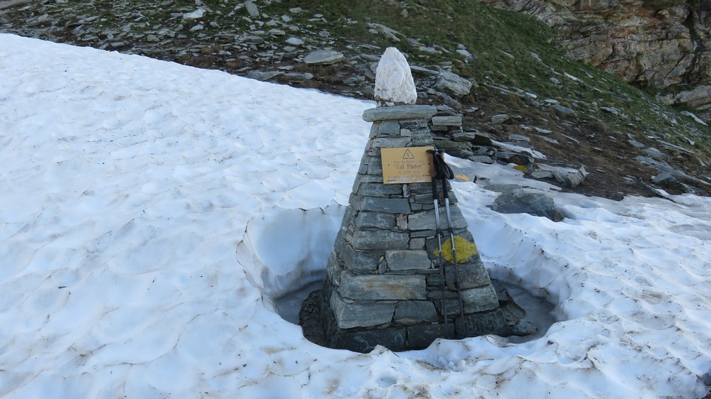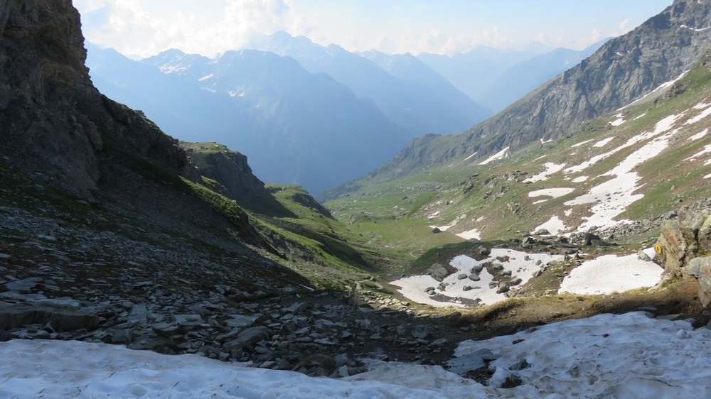 Les sapins sont présents jusqu'à 2200 m puis je prends la direction du col Pinter (2777 m) que j'atteins à 9 h par un sentier assez rude mais sans neige. L'autre versant offre un beau panorama avec quelques névés gérables. Le début de la descente est abrupte puis c'est avec douceur que je parviens au refuge 'Vieux Crest' à 11 heures.