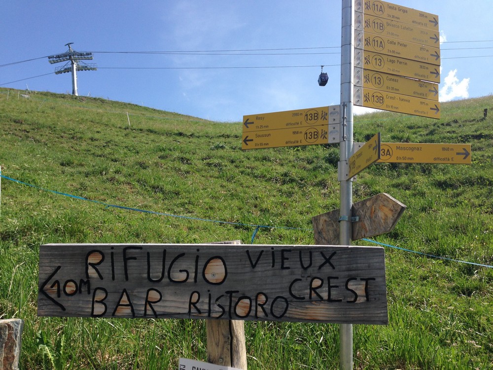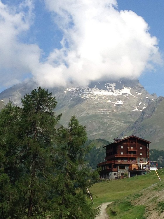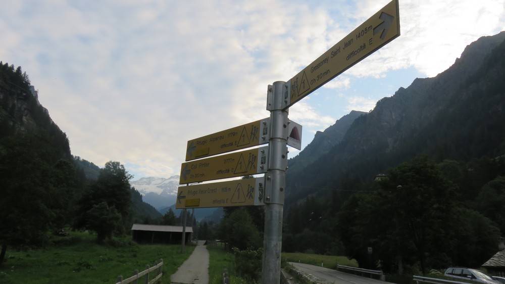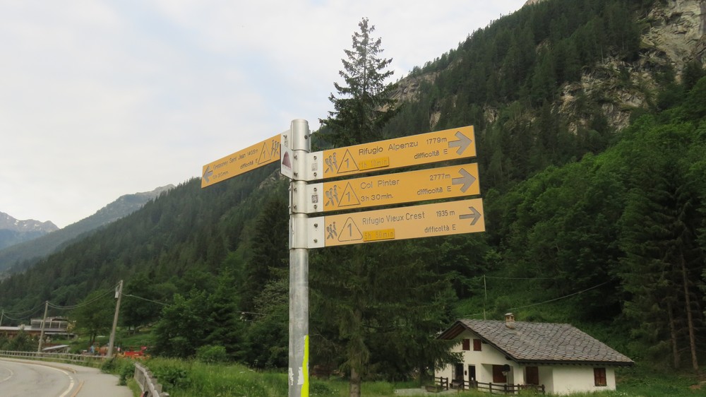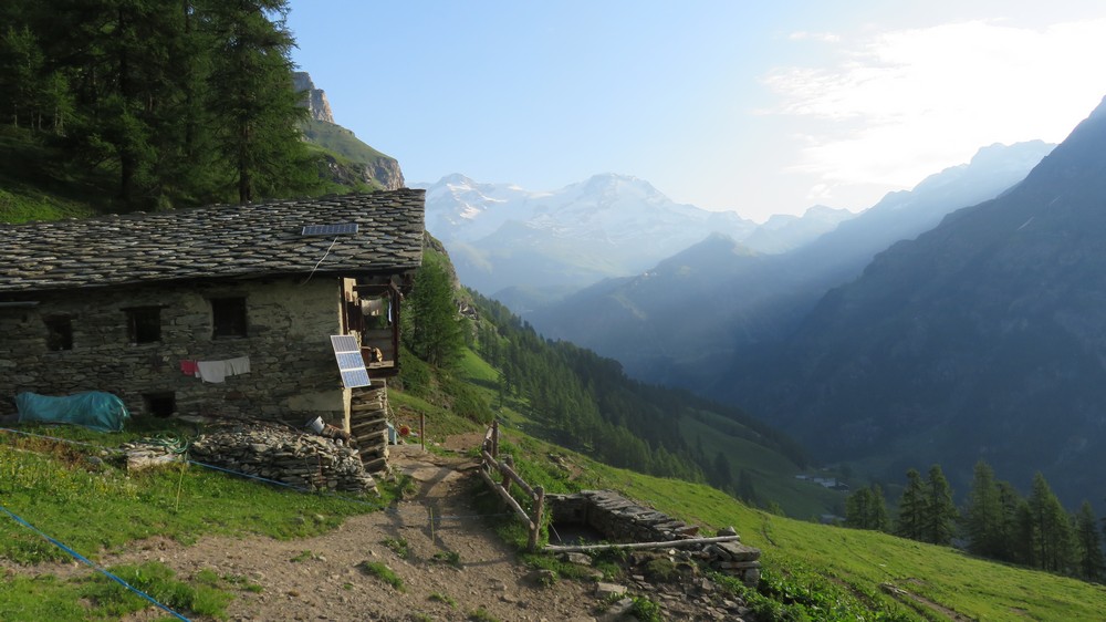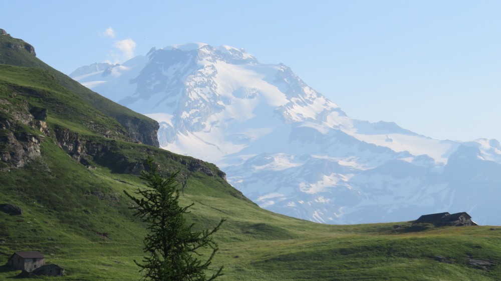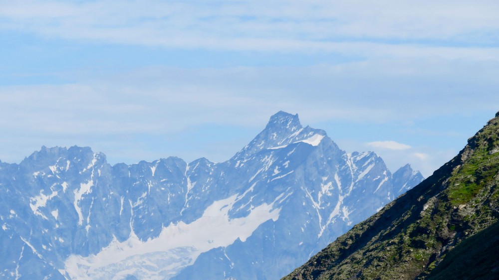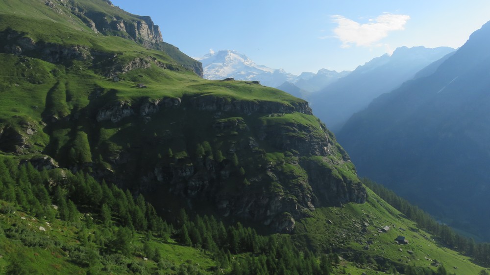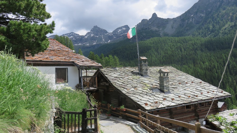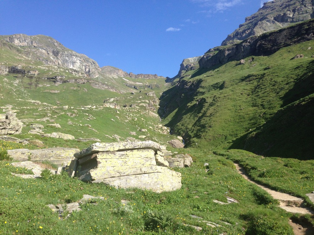 Les sapins sont présents jusqu'à 2200 m puis je prends la direction du col Pinter (2777 m) que j'atteins à 9 h par un sentier assez rude mais sans neige. L'autre versant offre un beau panorama avec quelques névés gérables. Le début de la descente est abrupte puis c'est avec douceur que je parviens au refuge 'Vieux Crest' à 11 heures.