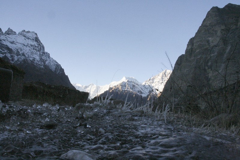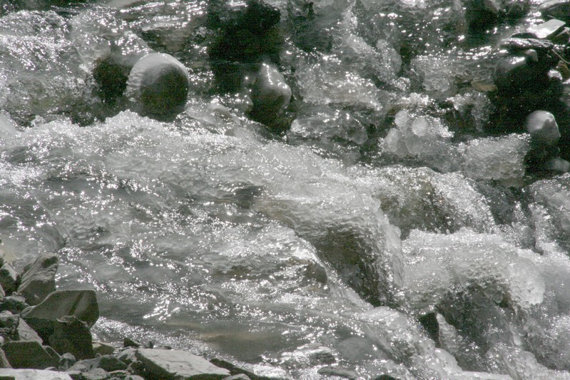 Départ sur sol gelé. Il a fait froid cette nuit et l'eau s'est transformée en glace. Le torrent également ont leurs pierres et rochers recouverts de gel.