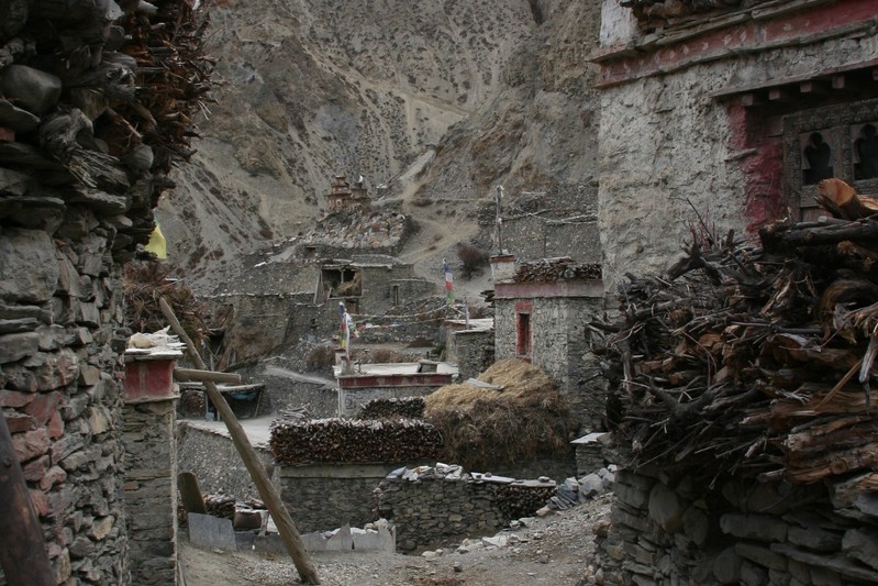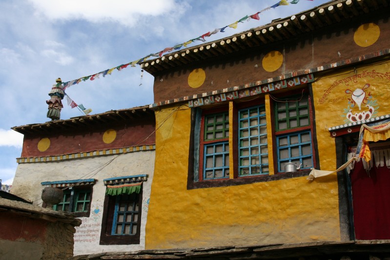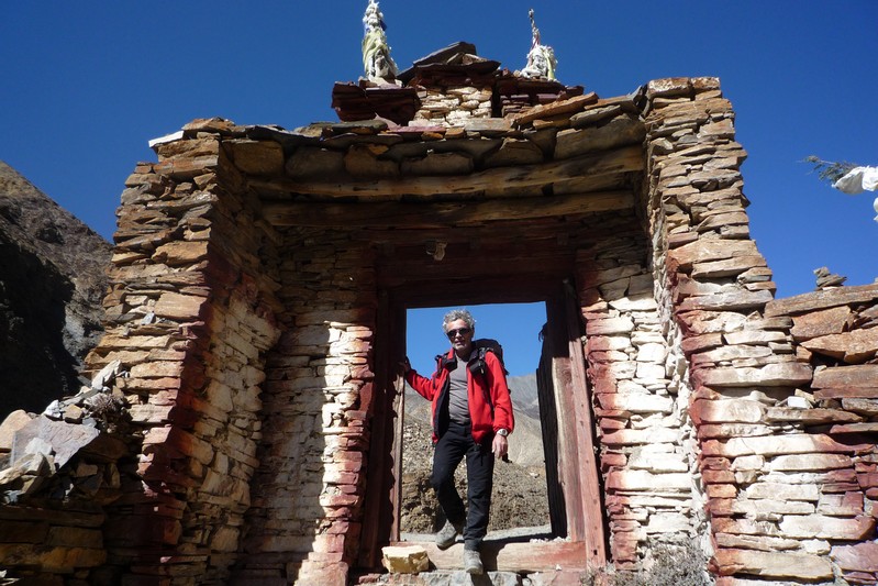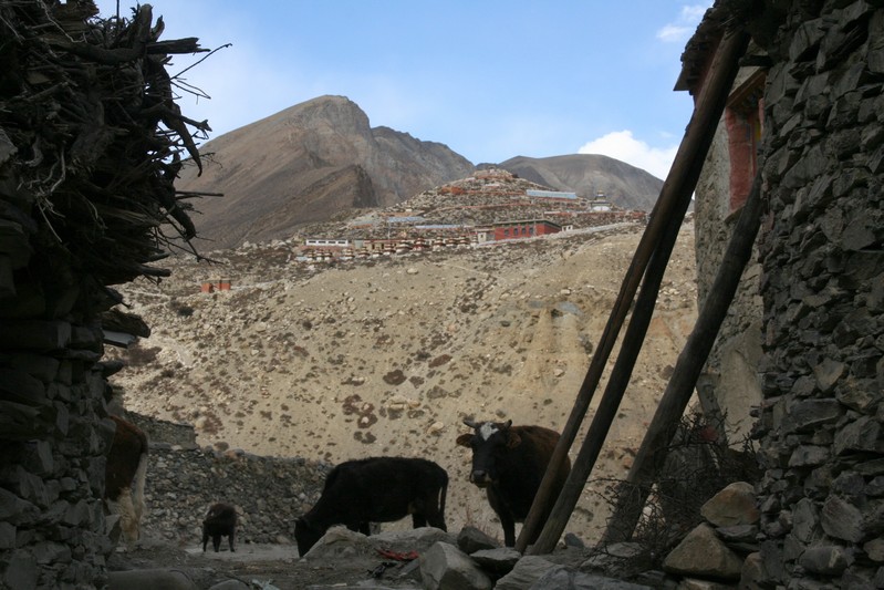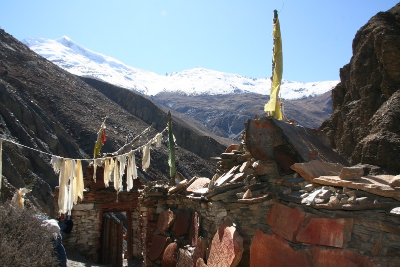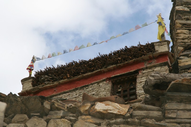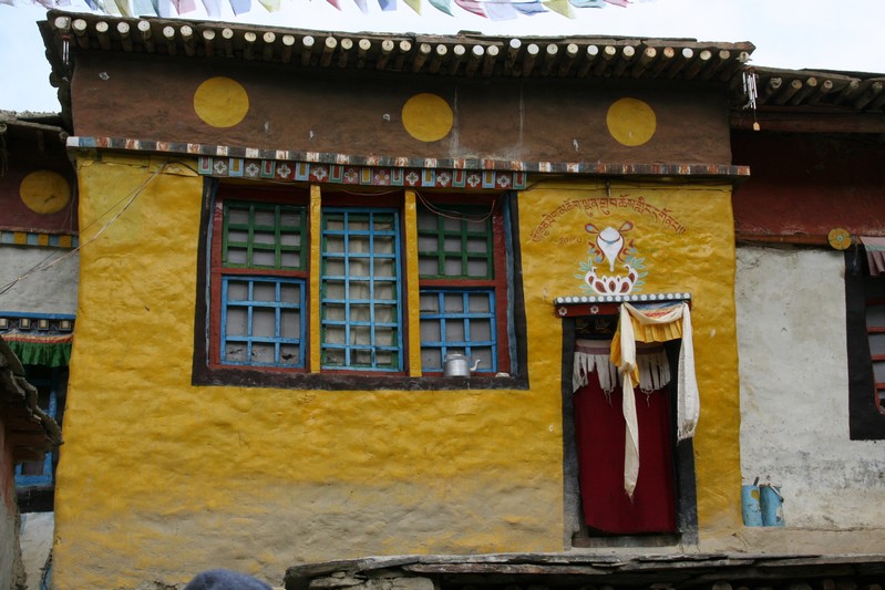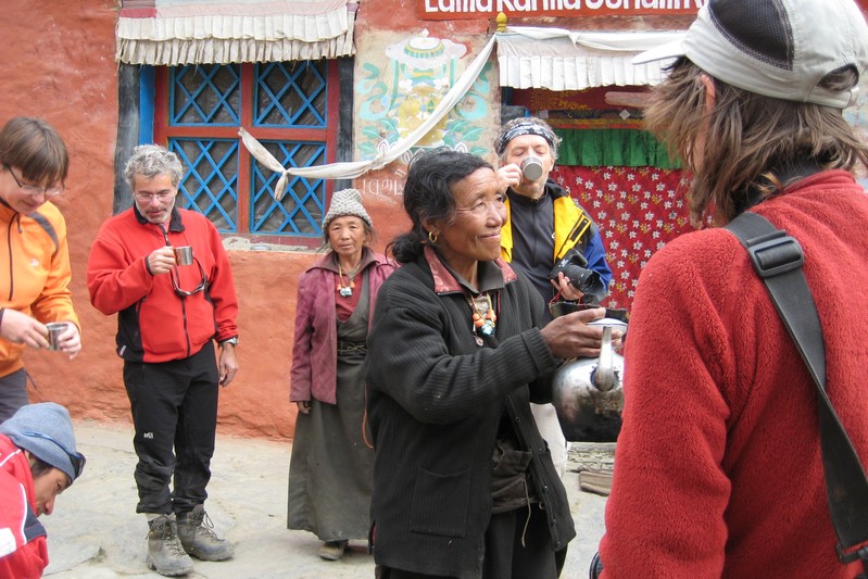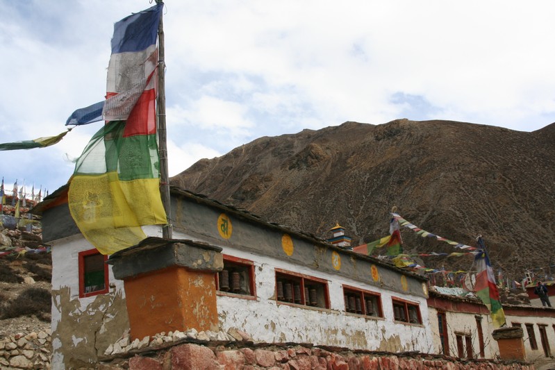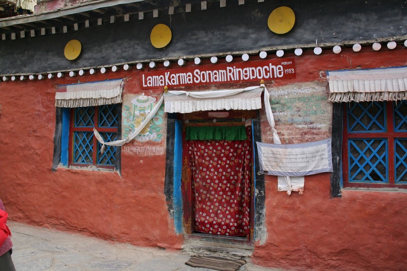 Je déguste ma première tasse de thé népalais (au beurre de yack) dans la cour du monastère qui surplombe le village. Celui-ci est trés coloré et nous sommes trés chaleureusement accueillis. Il se situe face au village, vers 4155 m. Le lama est absent aujourd'hui.