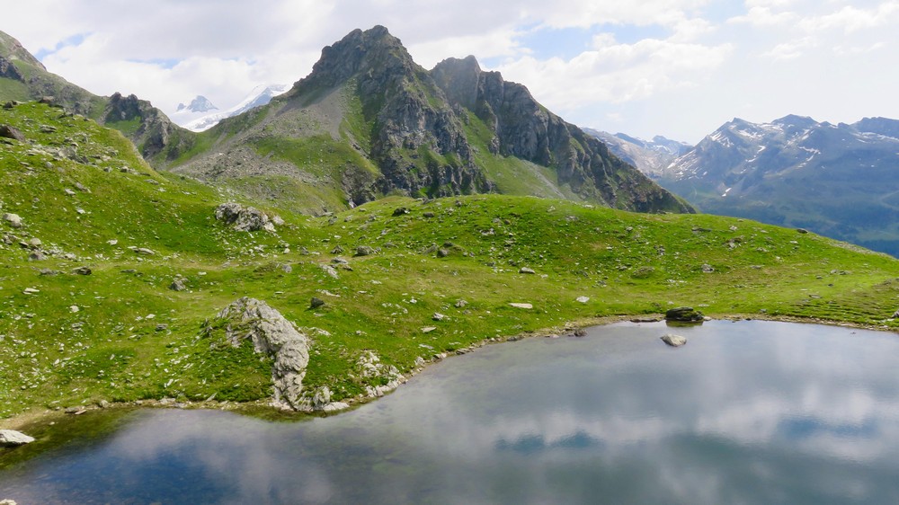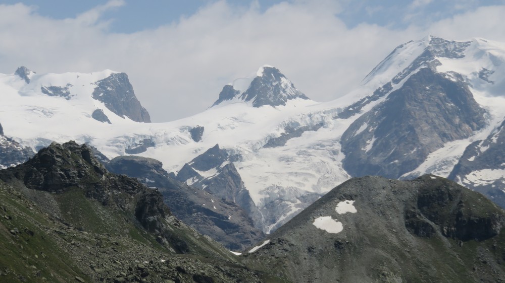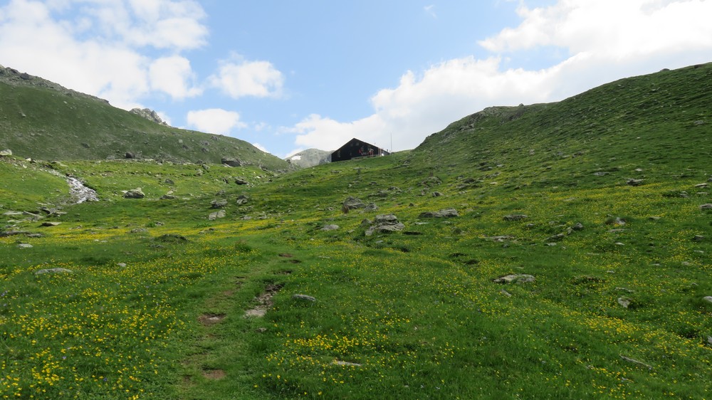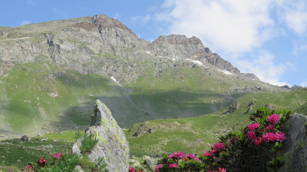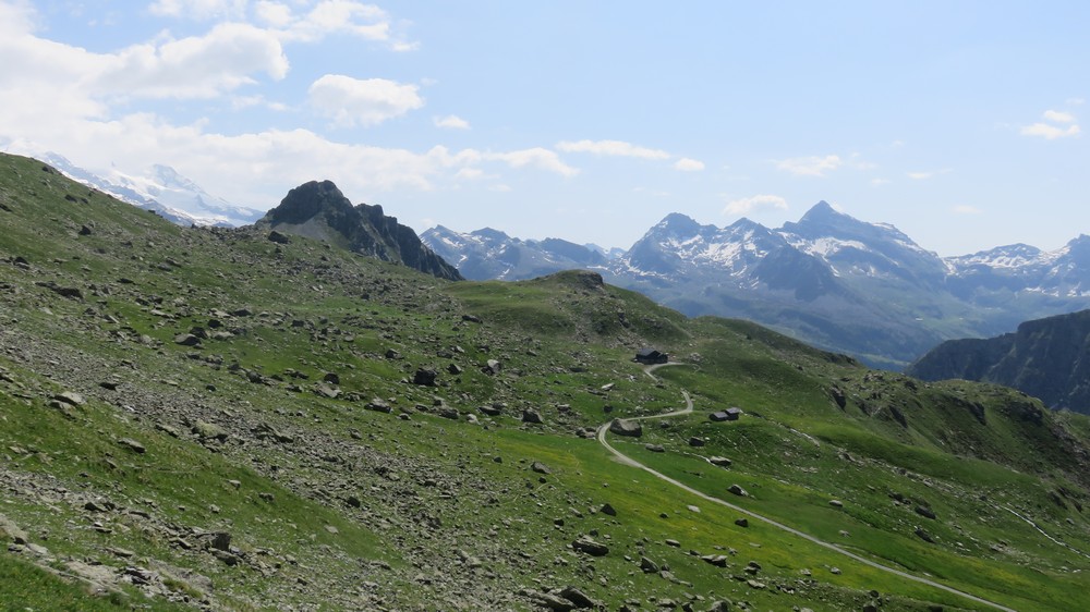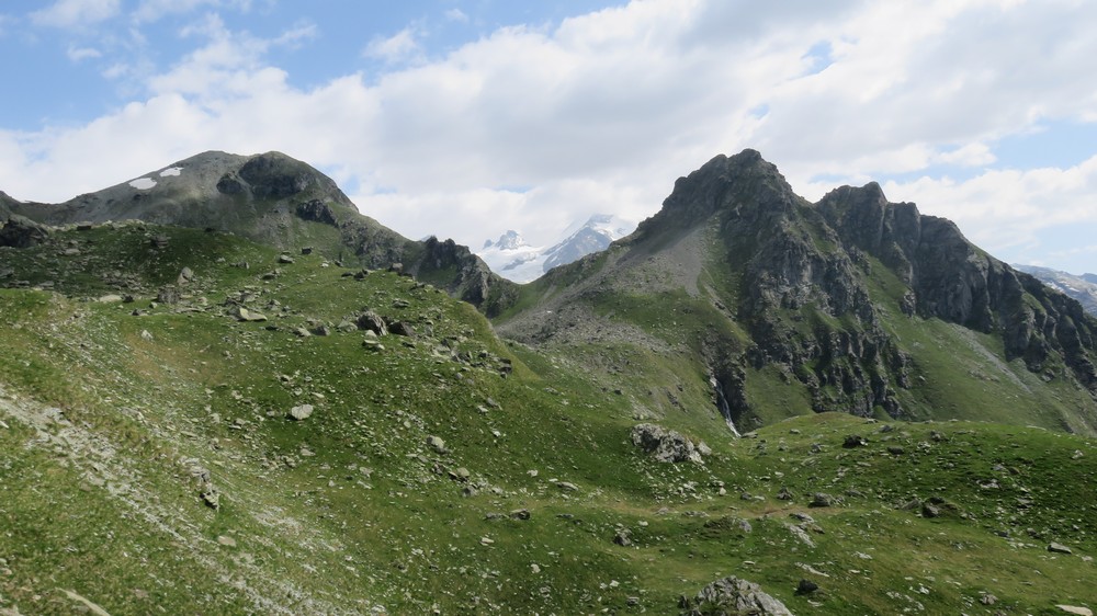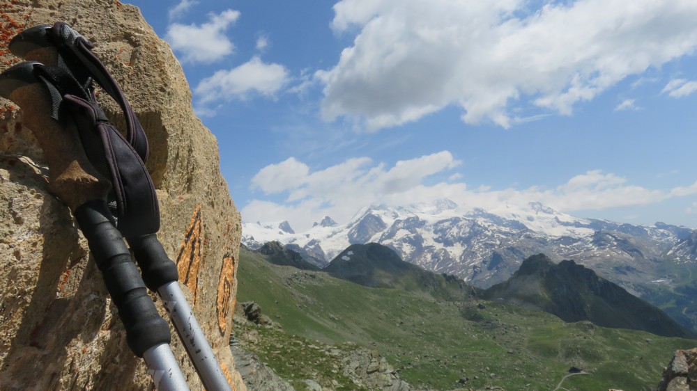 Arrivé au refuge du Grand Tournalin vers 10 h 30 (2535 m). Le col Nanaz (2773 m) se trouve face à moi et j'y suis vers 11h 30 pour une halte déjeuner. Un bel endroit pour s'arrêter quelques instants et profiter du magnifique panorama sur le Mont Rose !